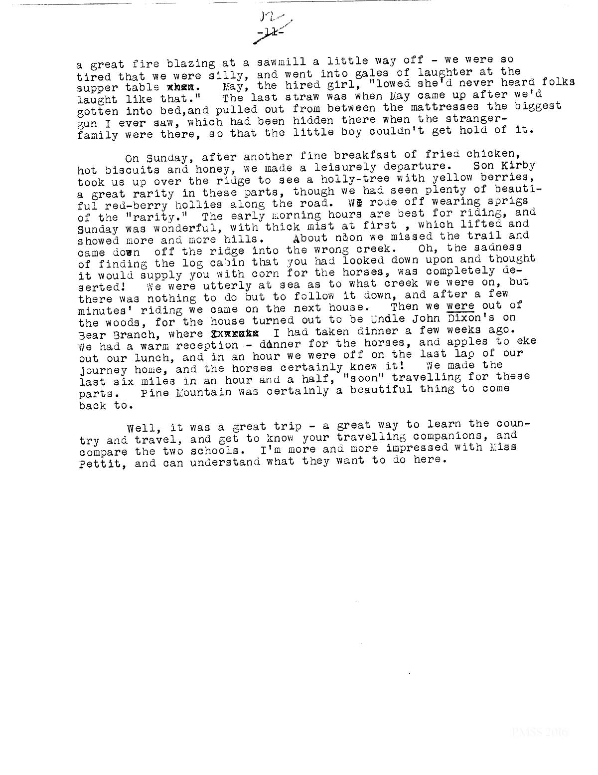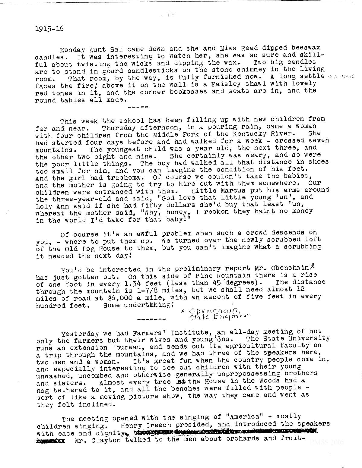 I certainly am having experiences with the boys of the family. The little girls are very harmless, and punishing them is really a diversion, compared to the boys. They really aren’t to blame for all the fighting and noise, of course, but when you let them go at all, then there’s nothing but fighting and noise, and no work is done. Yesterday I dealt with Chester, the largest boy in the class, and much too big to whip —, for bullying his small brother, and I sent him out of class at, recess and tried to carry on the school work in spite of his singing, whistling, and laughing like a loon, throwing sticks and leaves into the class, etc..(This was in the House in the Woods.) After school we had it out. He refused to apologize to me for disturbing the class, and I sat down and took down on paper every word he’d said. “Dag-gone it, you just better quit pickin’ on me. You haint nary speck better’n me ‘n I won’t take it… I wont apologize and you caint make me, and you caint, an’ I won’t stand up and apologize till I git good an’ ready.” And so on for about ten minutes. Then silence, during which I read quietly for about ten more minutes, and then tears. When they subsided, I got him to acknowledge that his tongue had run away with [page 3] him and that he didn’t mean it, and we ended by shaking hands and kissing, and I fed him on cheese and biscuit from my room, he having missed his dinner by that time.