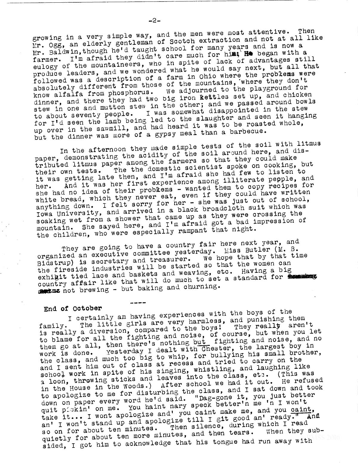 [page 2] … growing in a very simple way, and the men were most attentive. Then Mr. Ogg, an elderly gentleman of Scotch extraction and not at all like Mr. Baldwin, though he’d taught school for many years and is now a farmer. I’m afraid they didn’t care much for him: He began with a eulogy of the mountaineers, who in spite of lack of advantages still produce leaders, and we wondered what he would say next, but all that followed was a description of a farm in Ohio where the problems were absolutely different from those of the mountains, ‘where they don’t know alfalfa from phosphorus. We adjourned to the playground for dinner, and there they had two big iron kettles set up, and chicken stew in one and mutton stew in the other; and we passed around bowls to about seventy people. I was somewhat disappointed in the stew for I’d seen the lamb being led to the slaughter and seen it hanging up over in the sawmill, and had heard it was to be roasted whole, but the dinner was more of a gypsy meal than a barbecue.