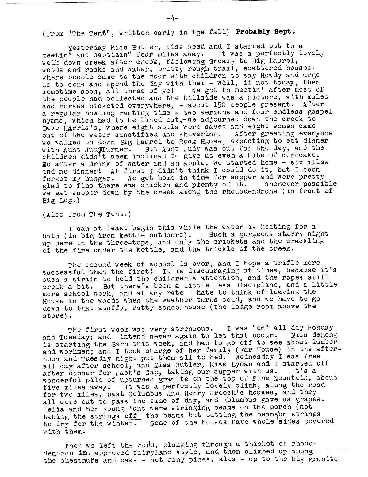 (From the Tent”, written early in the fall) Probably Sept. Yesterday Miss Butler, Miss Reed [sic, Read] and I started out to a meetin’ and baptizin’ four miles away. It was a perfectly lovely walk down creek after creek, following Greasy to Big Laurel, — woods and rocks and water, pretty rough trail, scattered houses — where people came to the door with children to say Howdy and urge us to come and spend the day with them – well, if not today, then sometime soon, all three of ye! We got to meetin’ after most of the people had collected and the hillside was a picture, with mules and horses picketed everywhere, — about 150 people present. After a regular howling ranting time – two sermons and four endless gospel hymns, which had to be lined out*,— we adjourned down the creek to Dave Harris’s, where eight souls were saved and eight women came out of the water sanctified and shivering. After greeting everyone we walked on down Big Laurel to Rock House, expecting to eat dinner with Aunt Judy Turner. But Aunt Judy was out for the day, and the children didn’t seem inclined to give us even a bite of corn-cake. so after a drink of water and an apple, we started home — six miles and no dinner! At first I didn’t think I could do it, but I soon forgot my hunger. We got home in time for supper and were pretty glad to find there was chicken and plenty of it. Whenever possible we eat supper down by the creek among the rhododendrons (in front of Big Log.)