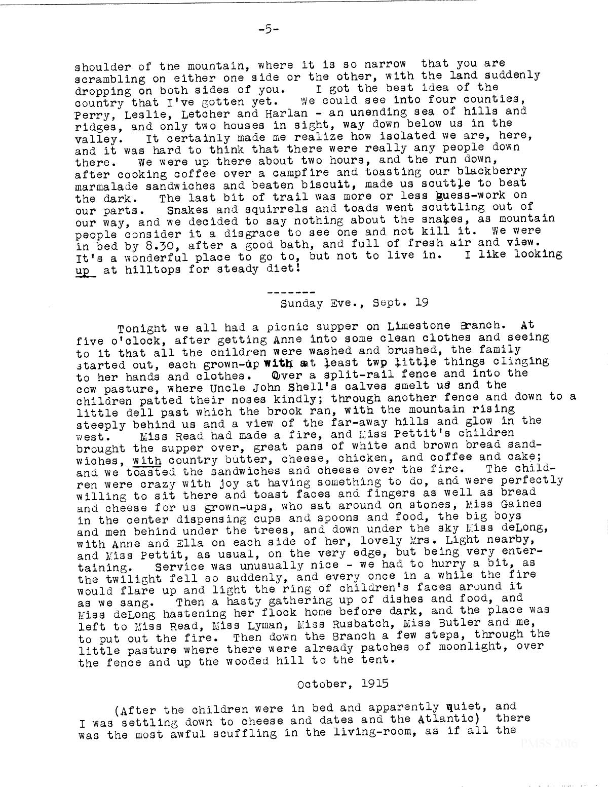 1915 [010] Sunday Eve. Sept. 19. Tonight we all had a picnic supper on Limestone Branch. (p.5)