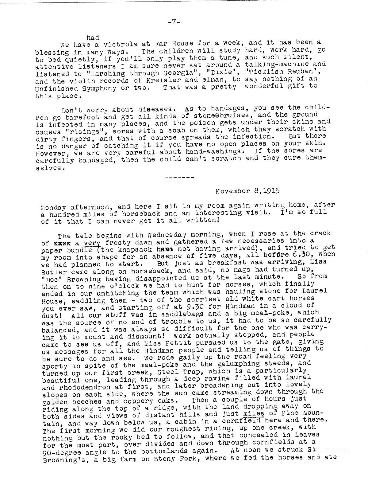 1915 [012-013] November 8 [3 ?]. Monday afternoon, and here I sit in my room again writing home, after a hundred miles of horseback and an interesting visit. I’m so full of it that I can never get it all written! … [See EVELYN K. WELLS 1915 – On Horseback to Hindman] for full transcript (p.7-12a).]