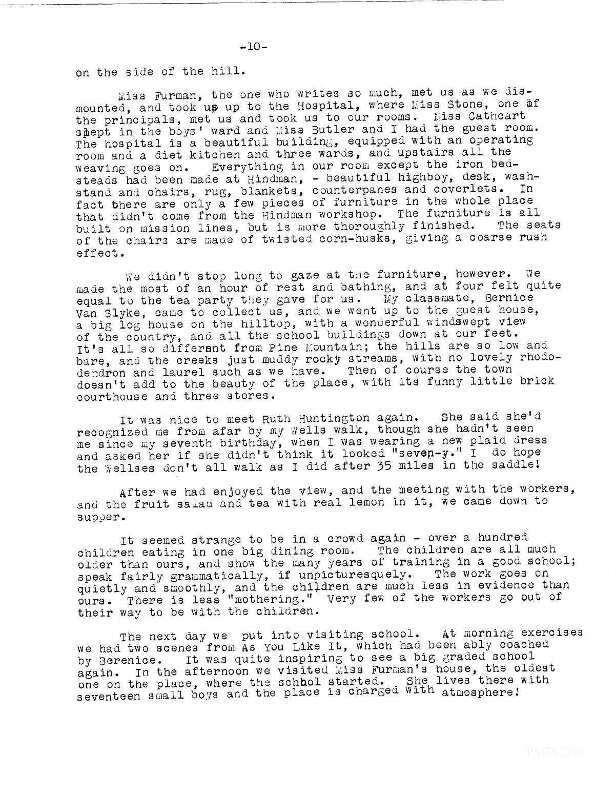 The following extracts are taken from the letters of Evelyn Wells to her family and contain graphic descriptions of life at Pine Mountain during the foundational days of the School from 1915 to 1927.