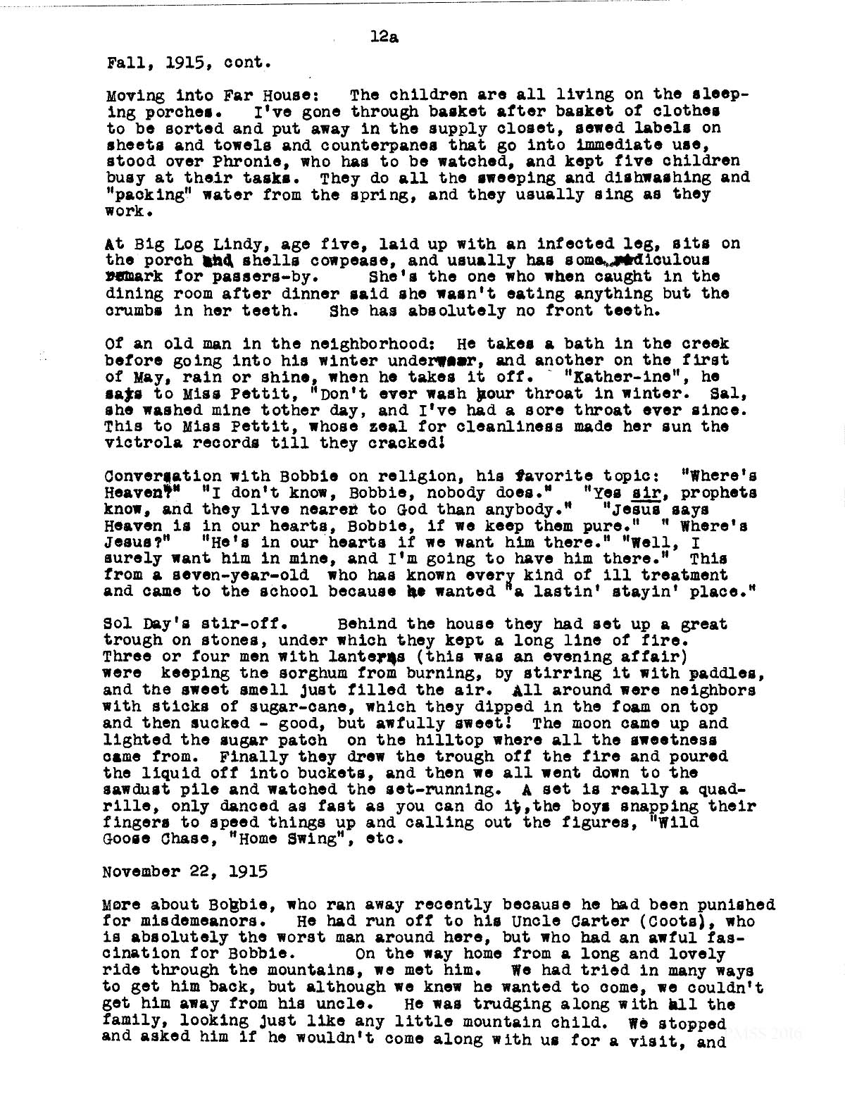 1915 [12a] Fall, cont. [Missing page?] Moving into Far House: The children are all living on the sleeping porches….(p.12a)