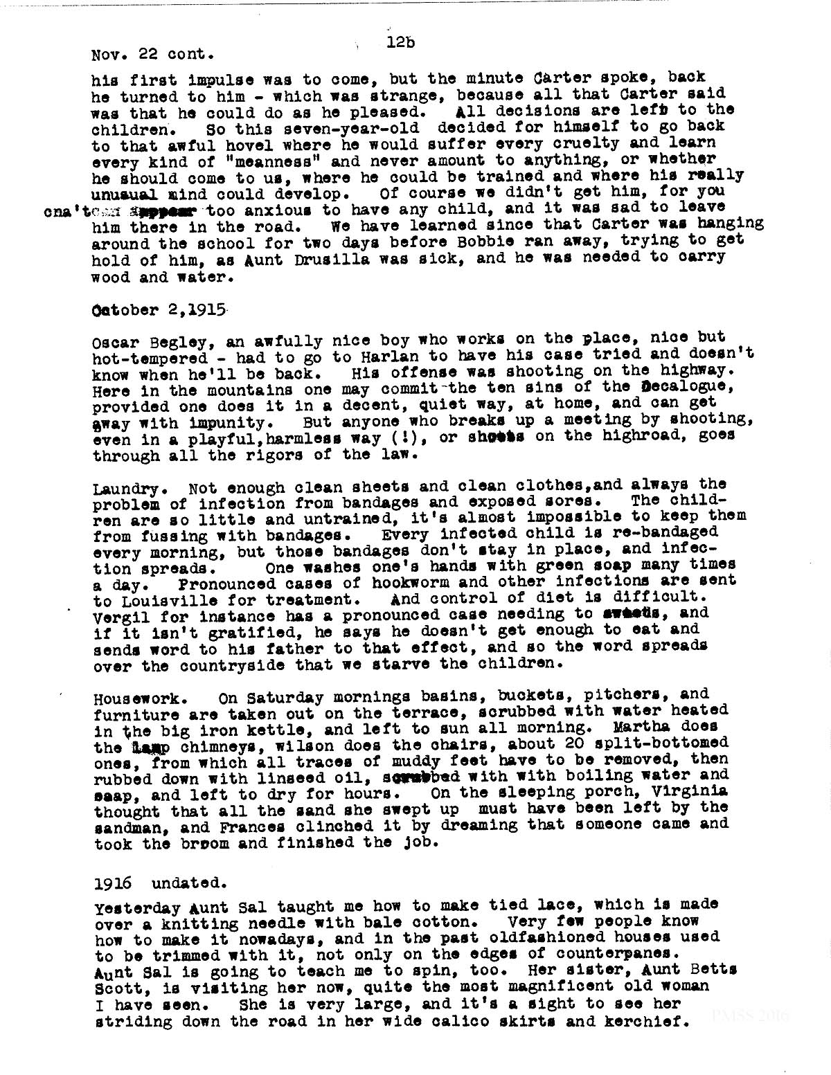 1915 ? – 1916 undated. Yesterday Aunt Sal taught me how to make tied lace, which is made over a knitting needle with bale cotton. (p.12b)