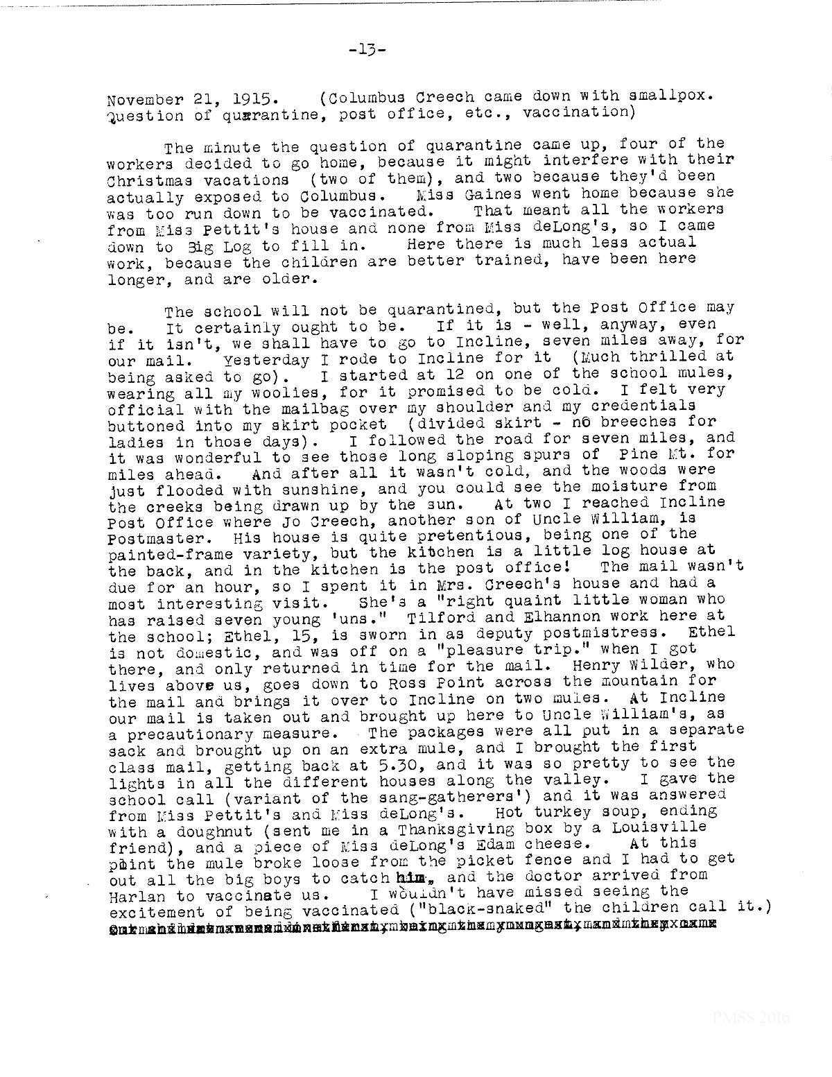 The school will not be quarantined, but the post office may be. It certainly ought to be. If it is — well, anyway, even if it isn’t, we shall have to go to Incline, seven miles away, for our mail. Yesterday I rode to Incline for it (Much thrilled at being asked to go). I started at 12 on one of the school mules, wearing all my woolies, for it promised to be cold. I felt very official with the mailbag over my shoulder and my credentials buttoned into my skirt pocket (divided skirt – no breeches for ladies in those days). I followed the road for seven miles, and it was wonderful to see those long sloping spurs of Pine Mt. for miles ahead. And after all it wasn’t cold, and the woods were just flooded with sunshine, and you could see the moisture from the creeks being drawn up by the sun. At two I reached incline Post Office where Jo [Joe] Creech, another son of Uncle William, is Postmaster. His house is quite pretentious, being one of the painted-frame variety, but the kitchen is a little log house at the back, and in the kitchen is the post office. The mail wasn’t due for an hour, so I spent it in Mrs. [Joe] Creech’s house and had a most interesting visit. She’s a “right quaint little woman who has raised seven young ‘uns.” Tilford and Elhannon work here at the school [Pine Mountain Settlement School]; Ethel, 15, is sworn in as deputy postmistress. Ethel is not domestic, and was off on a “pleasure trip,” when I got there, and only returned in time for the mail. Henry Wilder, [husband of Deliah Creech] who lives above us, goes down to Ross Point across the mountain for the mail and brings it over to Incline on two mules. At Incline our mail is taken out and brought up here to Uncle William’s, as a precautionary measure. The packages were all put in a separate sack and brought up on an extra mule, and I brought the first class mail, getting back at 5:30 and it was so pretty to see the lights in all the different houses along the valley. I gave the school call (variant of the “sang-gatherers’) and it was answered from Miss Pettit’s and Miss de Long’s. Hot turkey soup, ending with a doughnut (sent me in a Thanksgiving box by a Louisville friend), and a piece of Miss de Long’s Edam cheese. At this point the mule broke loose from the picket fence and I had to get out all the big boys to catch him. And, the doctor arrived from Harlan to vaccinate us. I wouldn’t have missed seeing the