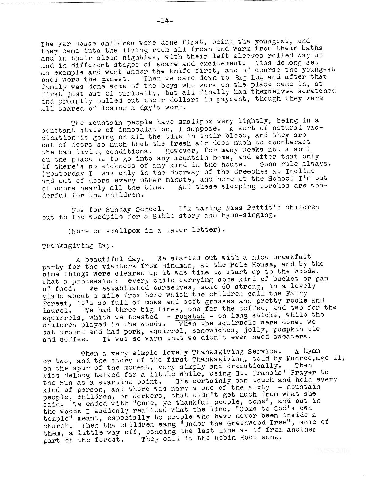 Then a very simple lovely Thanksgiving Service. A hymn or two, and the story of the first Thanksgiving, told by Munroe, age 11, on the spur of the moment, very simply and dramatically. Then Miss de Long talked for a little while, using St. Francis’ Prayer to the Sun as a starting point. She certainly can touch and hold every kind of person, and there was nary a one of the sixty – mountain people, children, or workers, that didn’t get much from what she said, we ended with “Come, ye thankful people, come”, and out in the woods I suddenly realized what the line, “Come to God’s own temple” meant, especially to people who have never been inside a church. Then the children sang “under the Greenwood Tree”, some of them, a little way off, echoing the last line as if from another part of the forest. They call it the Robin Hood song.
