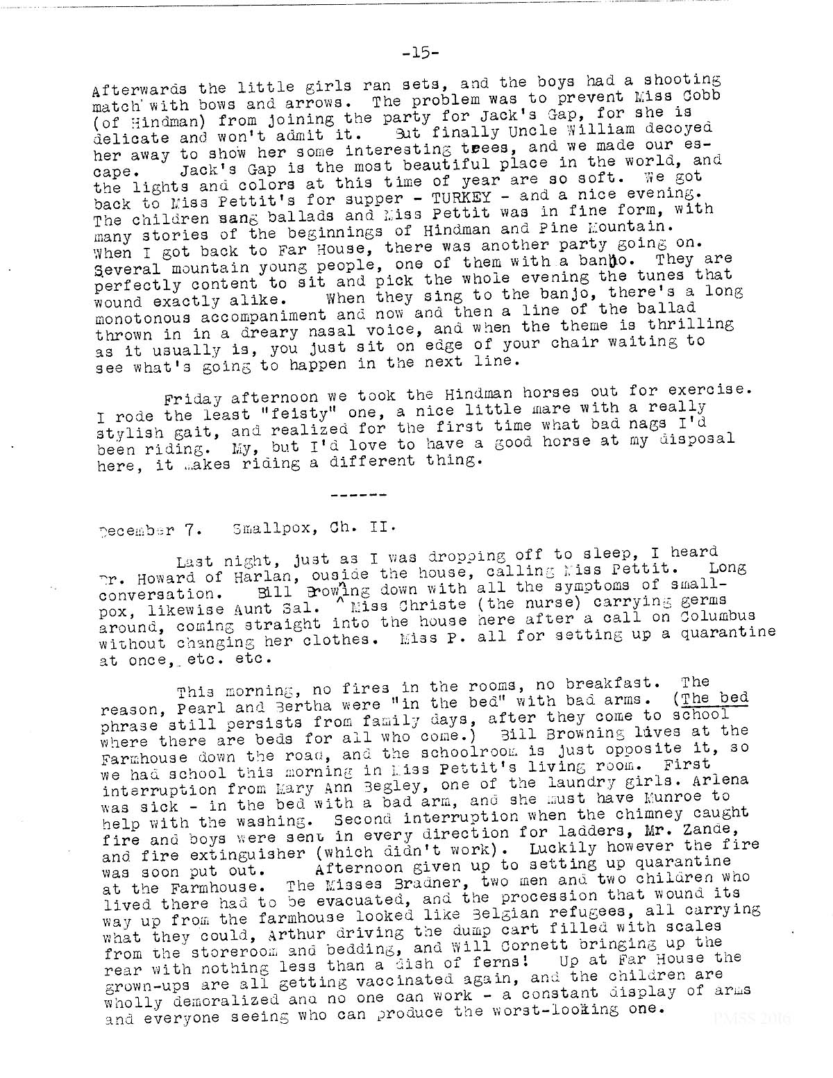 1915 December 7. Smallpox, Ch. II. Last night, just as I was dropping off to sleep, I heard Dr. Howard of Harlan, outside the house, calling Miss Pettit… (p.15)