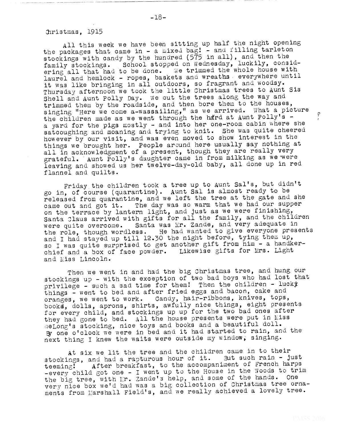 1915 Christmas. All this week we have been sitting up half the night opening the packages that came in — a mixed bag! — and filling Tarleton stockings with candy by the hundred (575 in all) … (p.18-19)