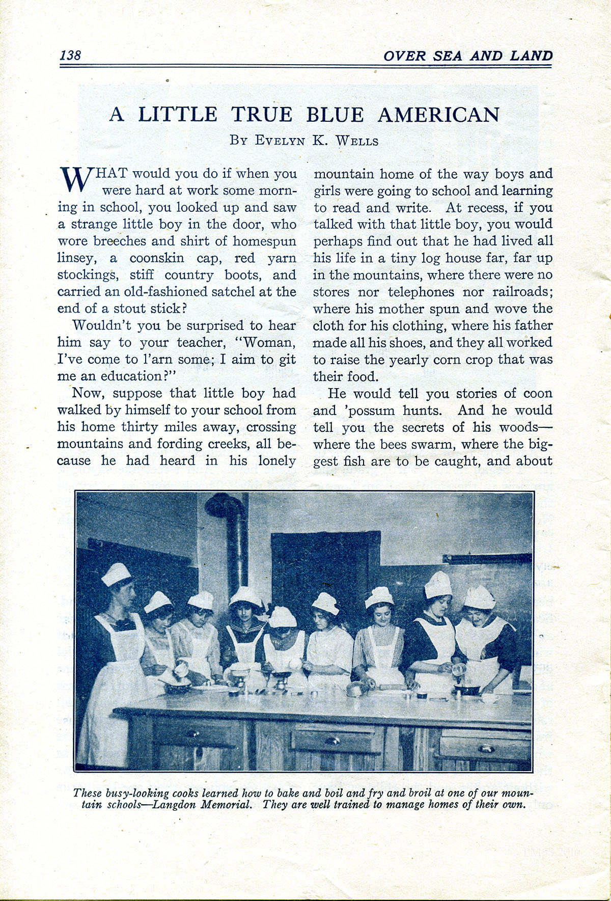 1. E.K. Wells. Cover: Over TAGS: Evelyn K. Wells, “A Little True Blue American” 1920 ; education ; Southern Appalachians ; Over Sea and Land folklore ; folklife ; patriotism ; WWI ;Sea and Land, Nov. 1920. [little_true_blue_001]
