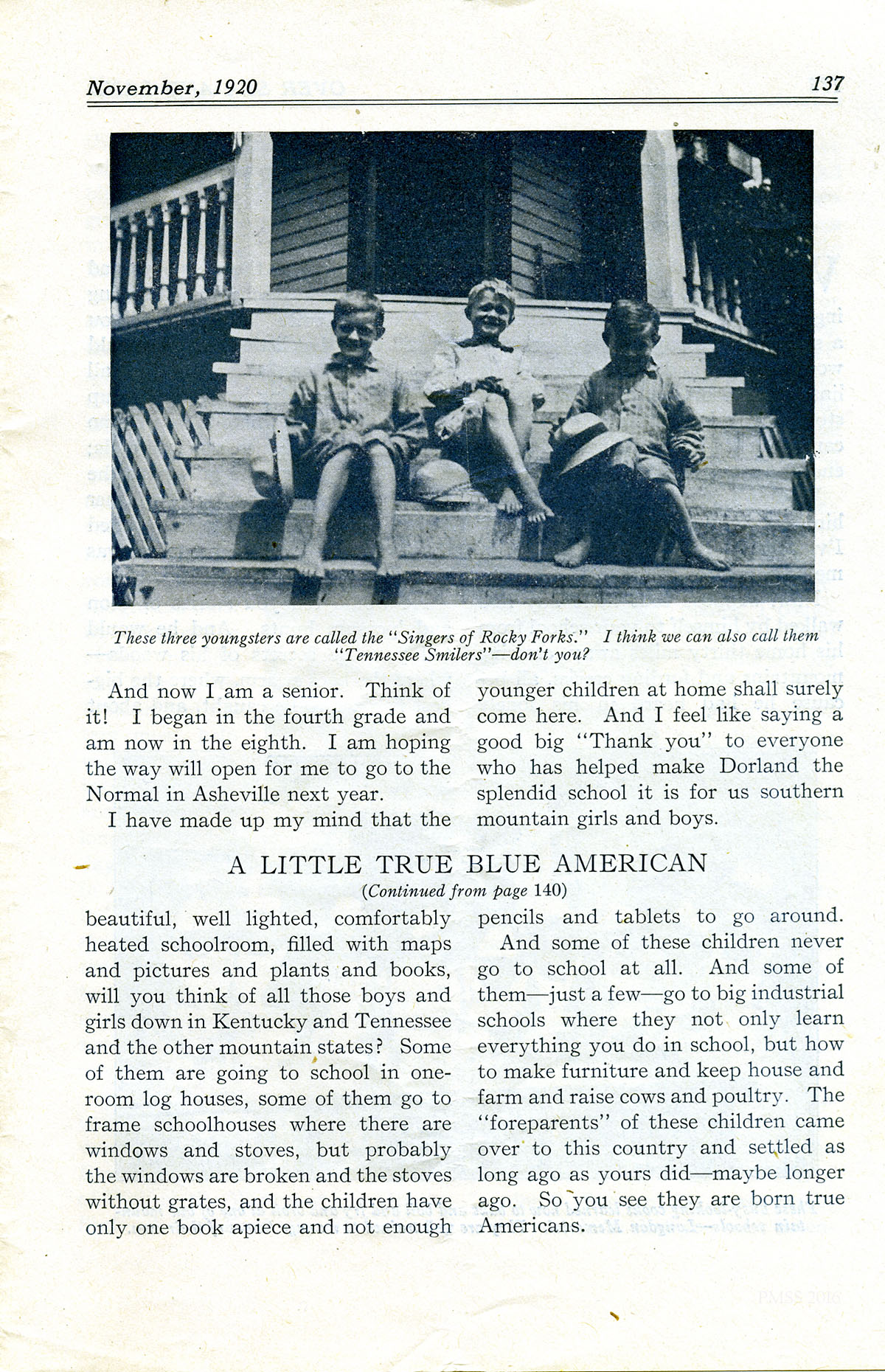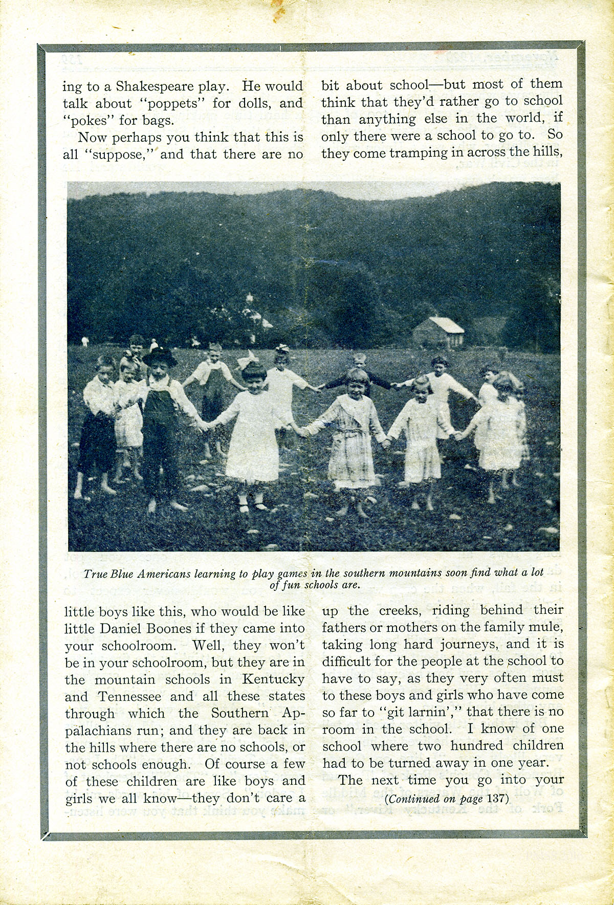 The embellished stories that early staff produced were very effective in capturing the reader and they demonstrate the cultural back and forth of the early years in the Southern Appalachians and the earnest attempts to call attention to the need for educational and social programs for children in the region.