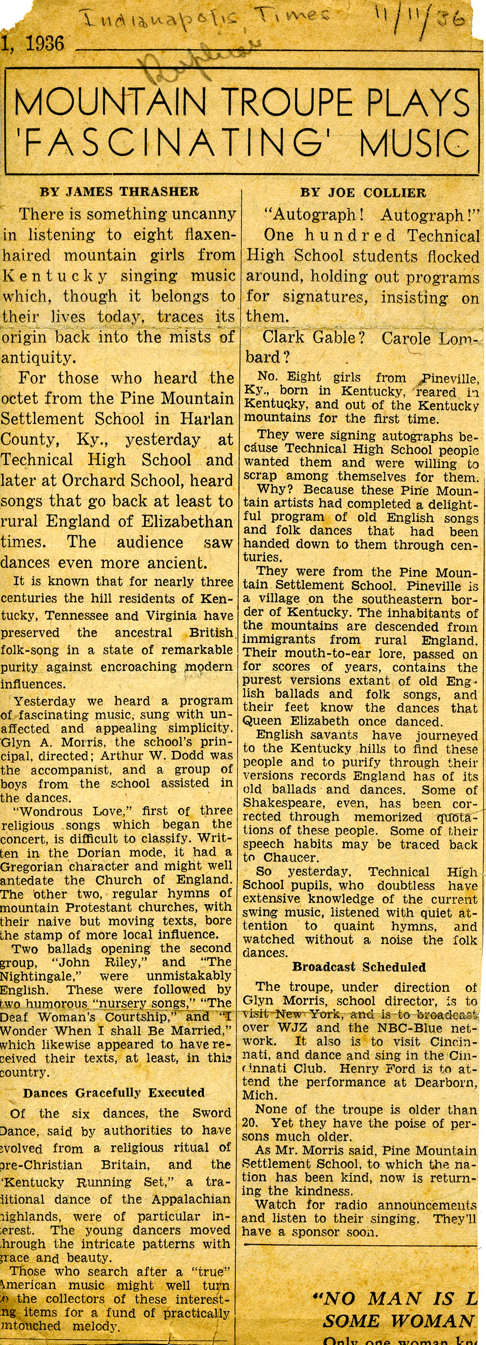 - “Mountain Troupe Plays ‘Fascinating’ Music.” Indianapolis Times, November 11, 1936. [fern_0011.jpg]