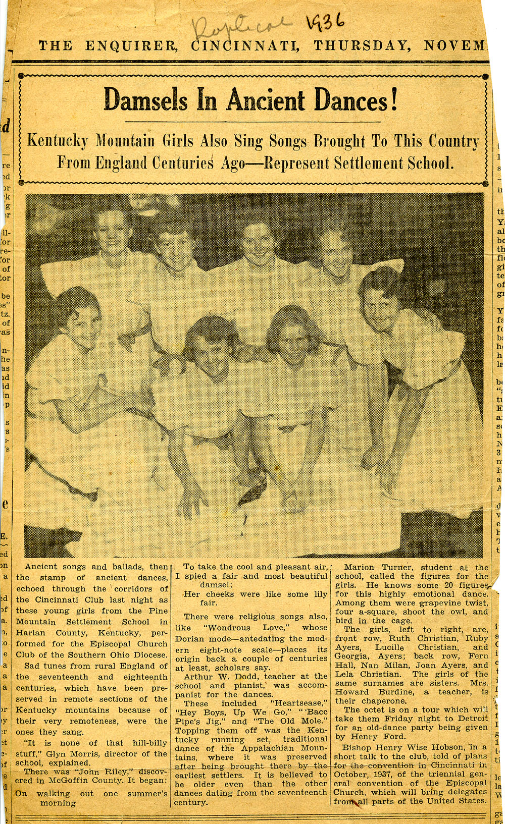 Sources “Damsels in Ancient Dances!” The Enquirer, Cincinnati, OH., November 1937. Newspaper article. Morris, Glyn. A Road Less Traveled, New York: Vantage Press, 1977. Print. “Mountain Troupe Plays ‘Fascinating’ Music.” Indianapolis Times, November 11, 1936. Newspaper Article. Pine Mountain Settlement School Institutional Papers. Pine Mountain Settlement School, Pine Mountain, KY. Archival material. |