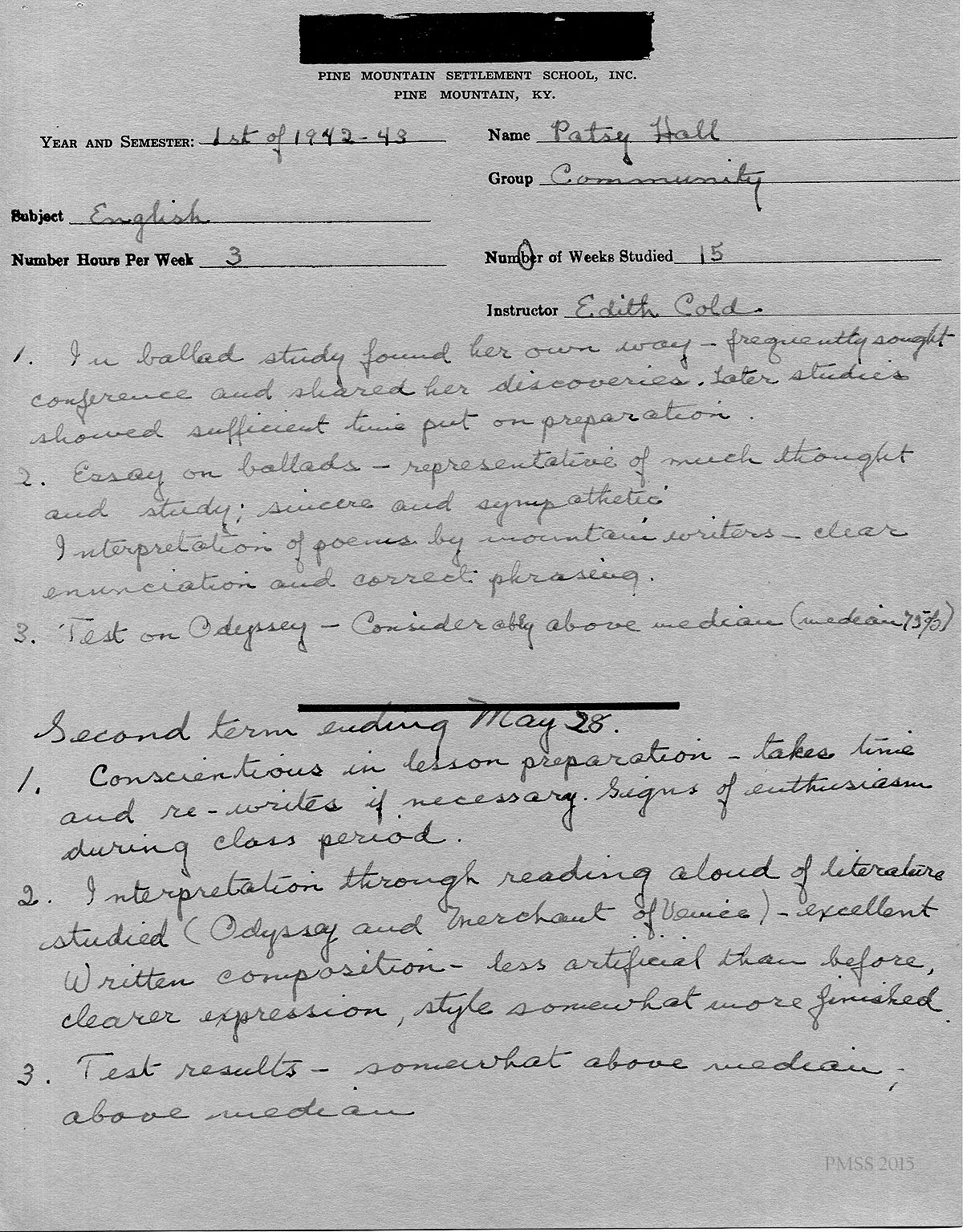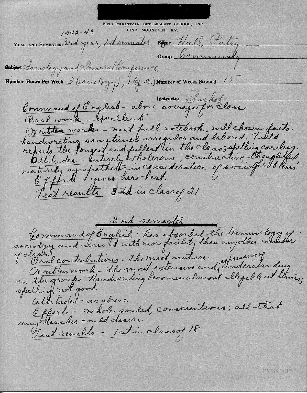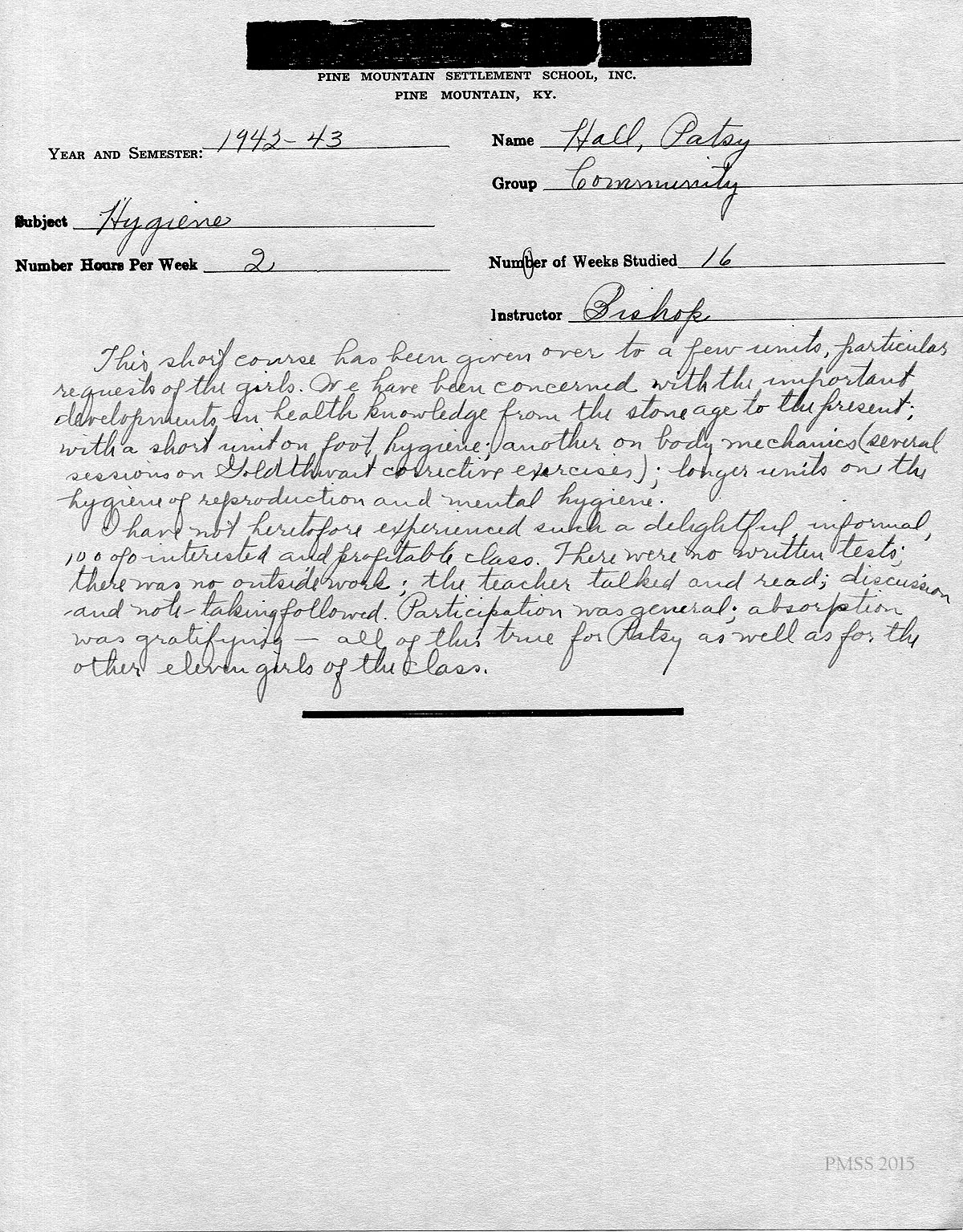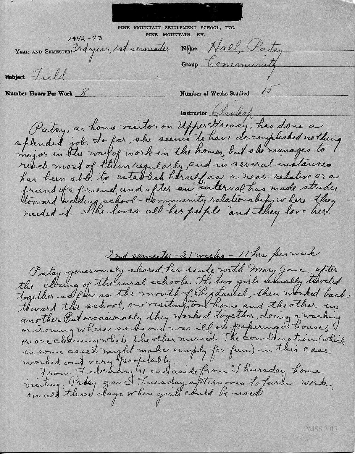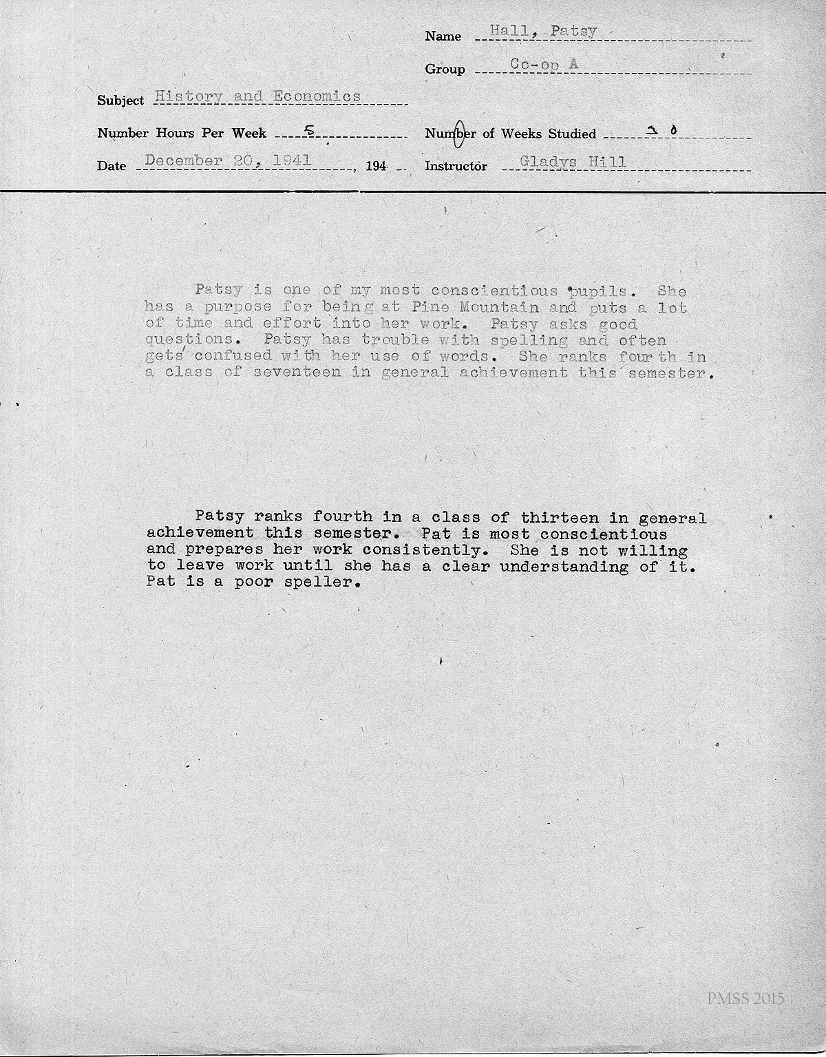 The Flora Patsy Hall correspondence and record at Pine Mountain Settlement School is voluminous, as is sometimes the case when students have many years at the school and many succeeding years in which they are active in School affairs. For example, Patsy was a long-time leader in the Alumni Association of the School. Flora Patsy Hall’s record as a student, is, however, unusually large. It contains one of the later and more documented and extensive records of growth as a student at the school in which each instructor weighed in on the student performance with an annual written report.