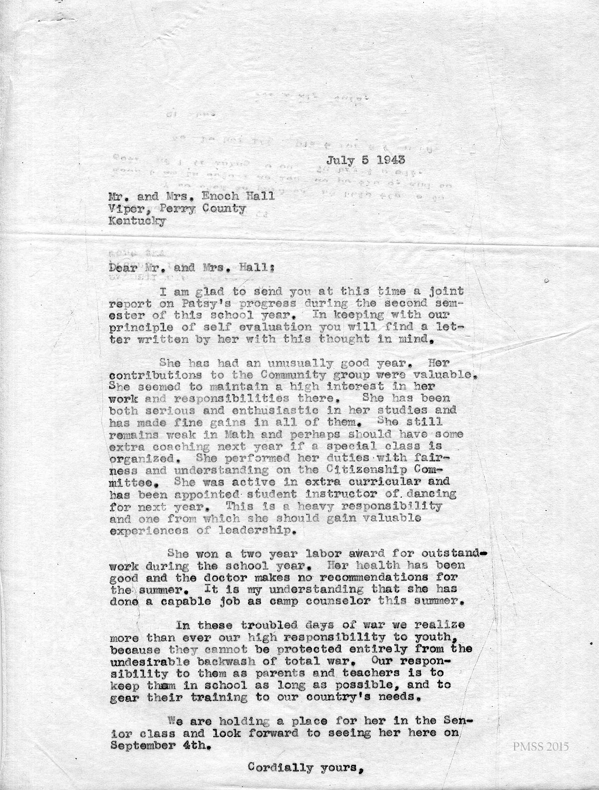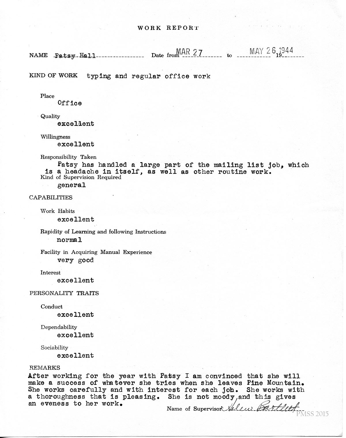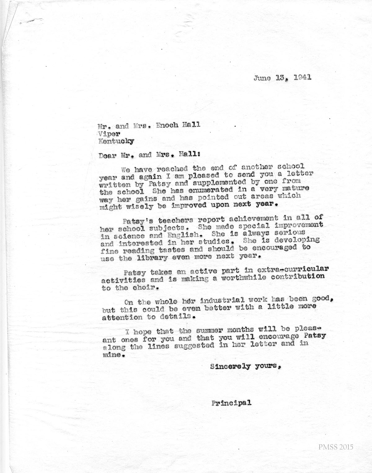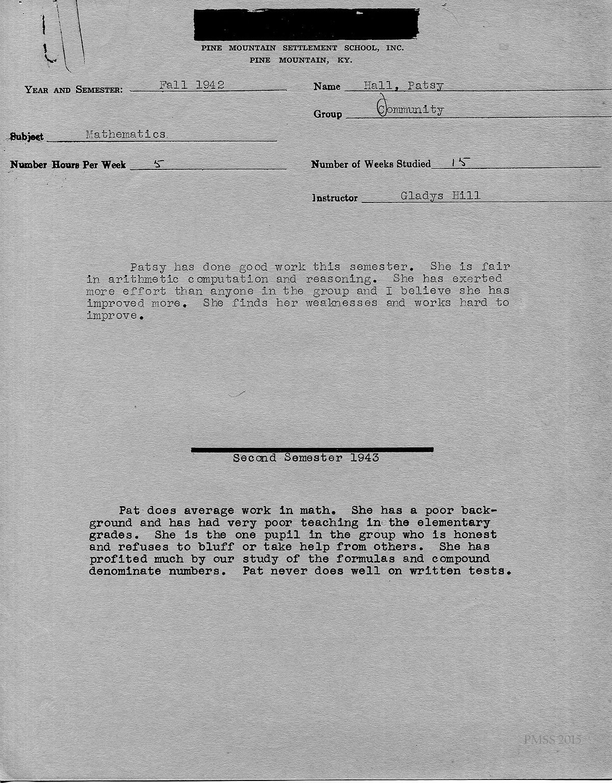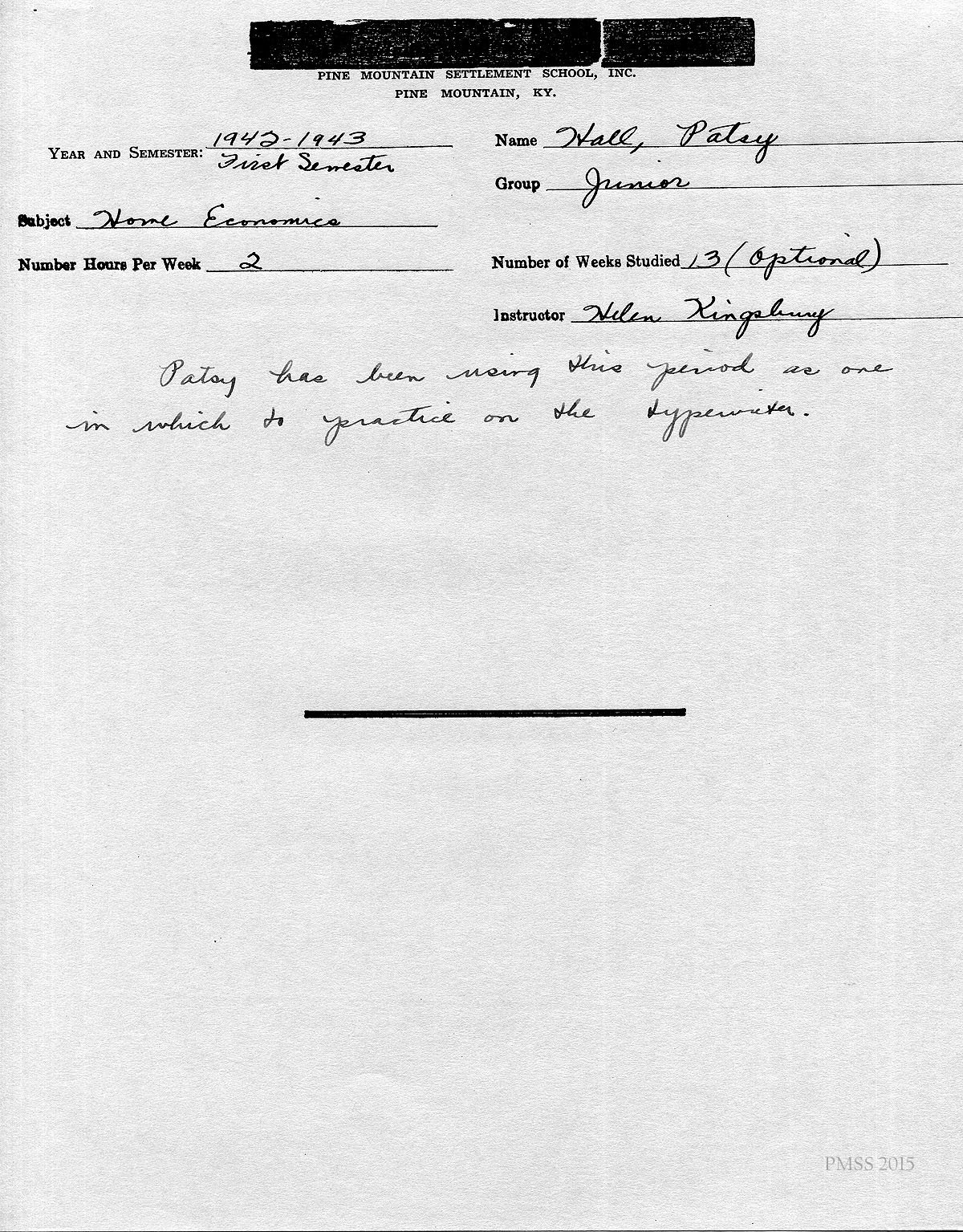 The Flora Patsy Hall correspondence and record at Pine Mountain Settlement School is voluminous, as is sometimes the case when students have many years at the school and many succeeding years in which they are active in School affairs. For example, Patsy was a long-time leader in the Alumni Association of the School. Flora Patsy Hall’s record as a student, is, however, unusually large. It contains one of the later and more documented and extensive records of growth as a student at the school in which each instructor weighed in on the student performance with an annual written report.