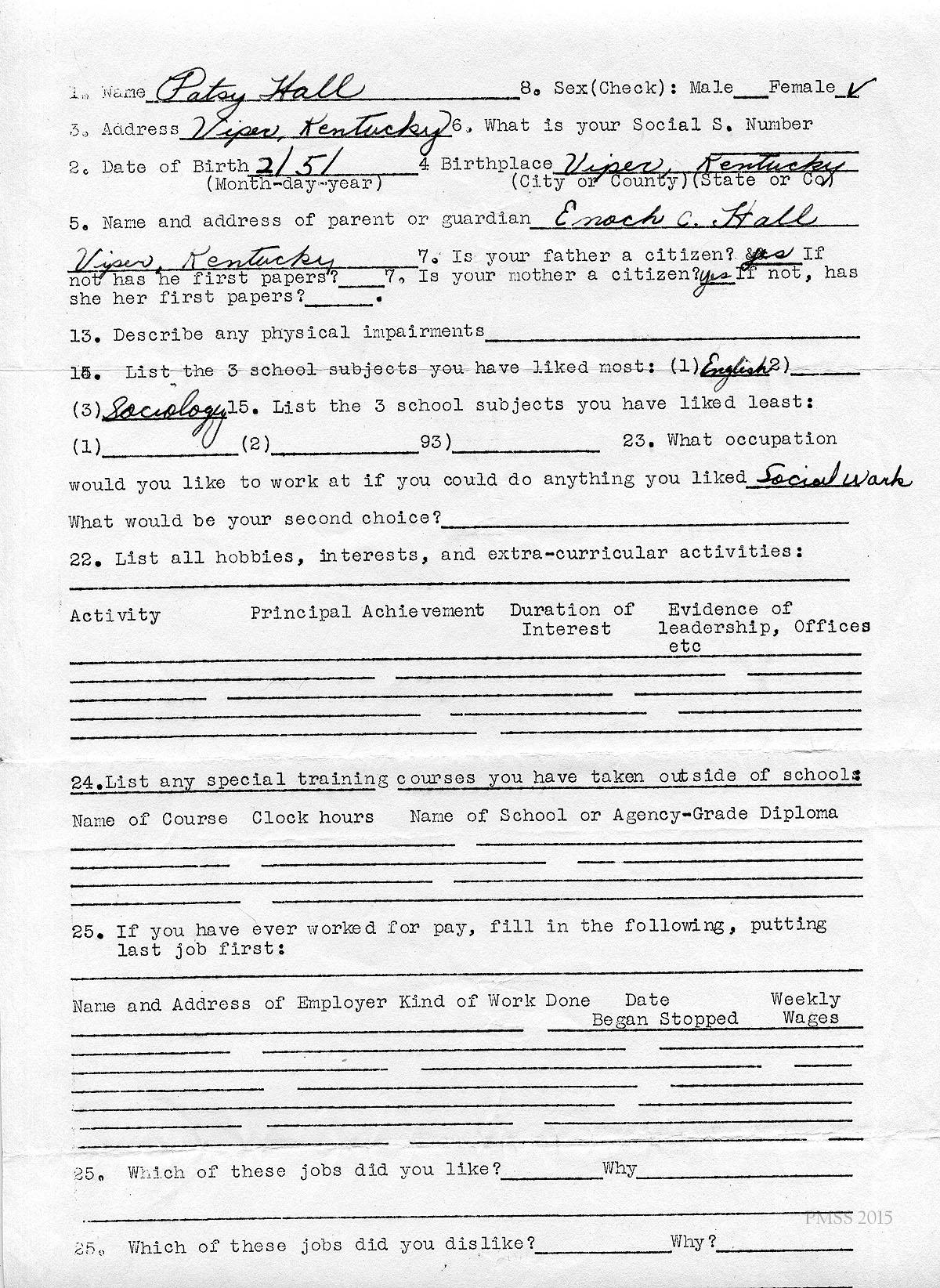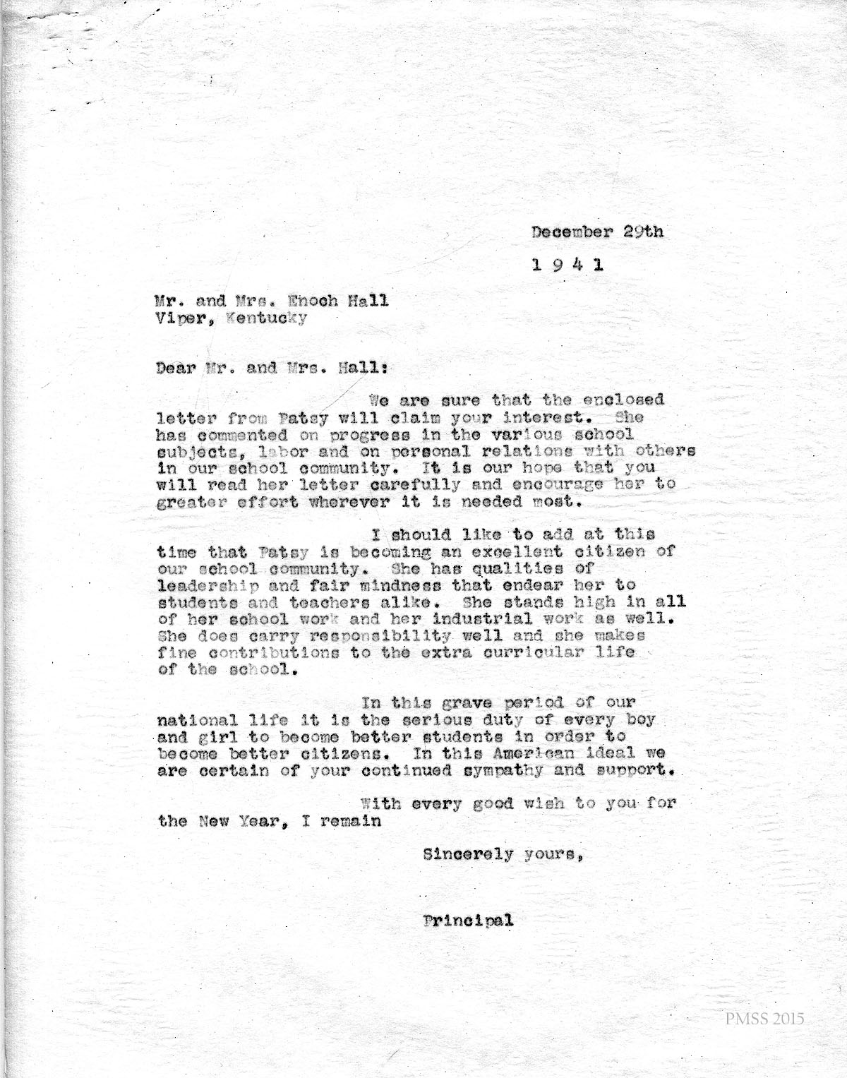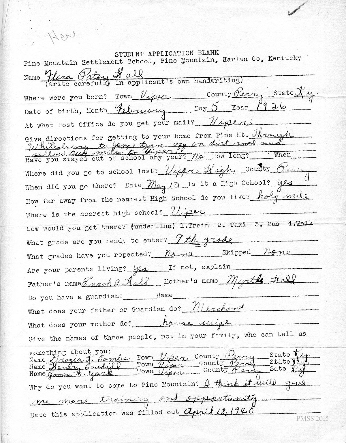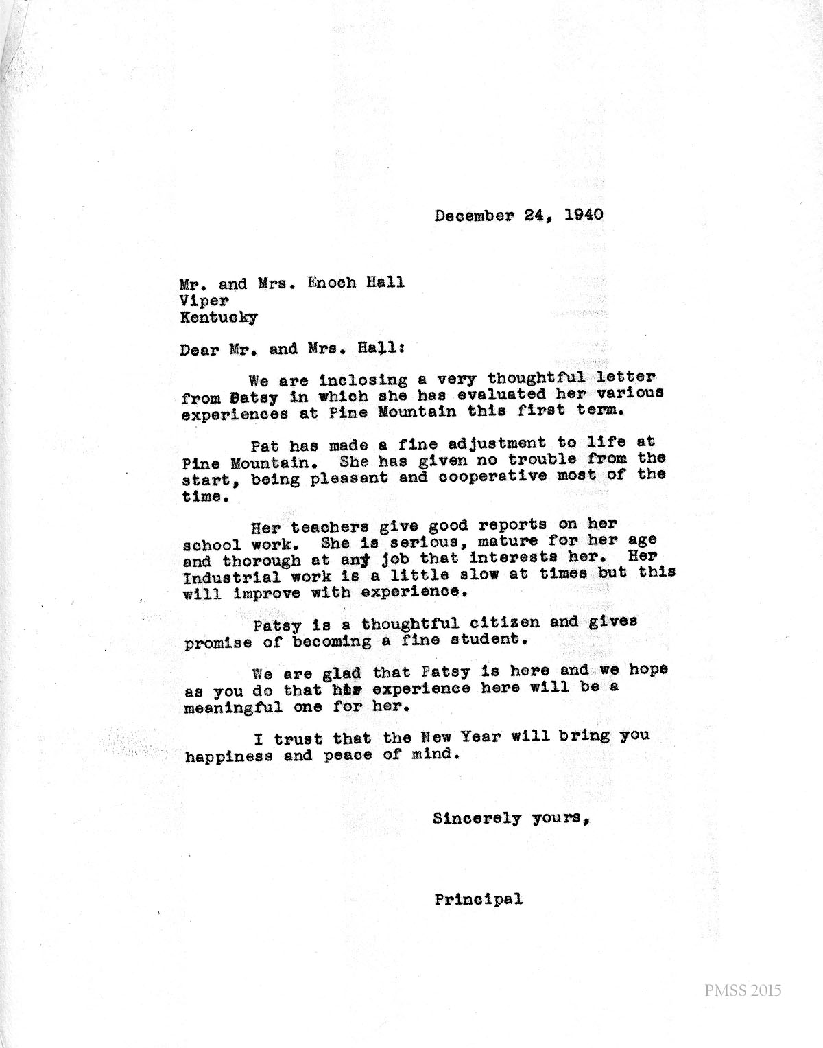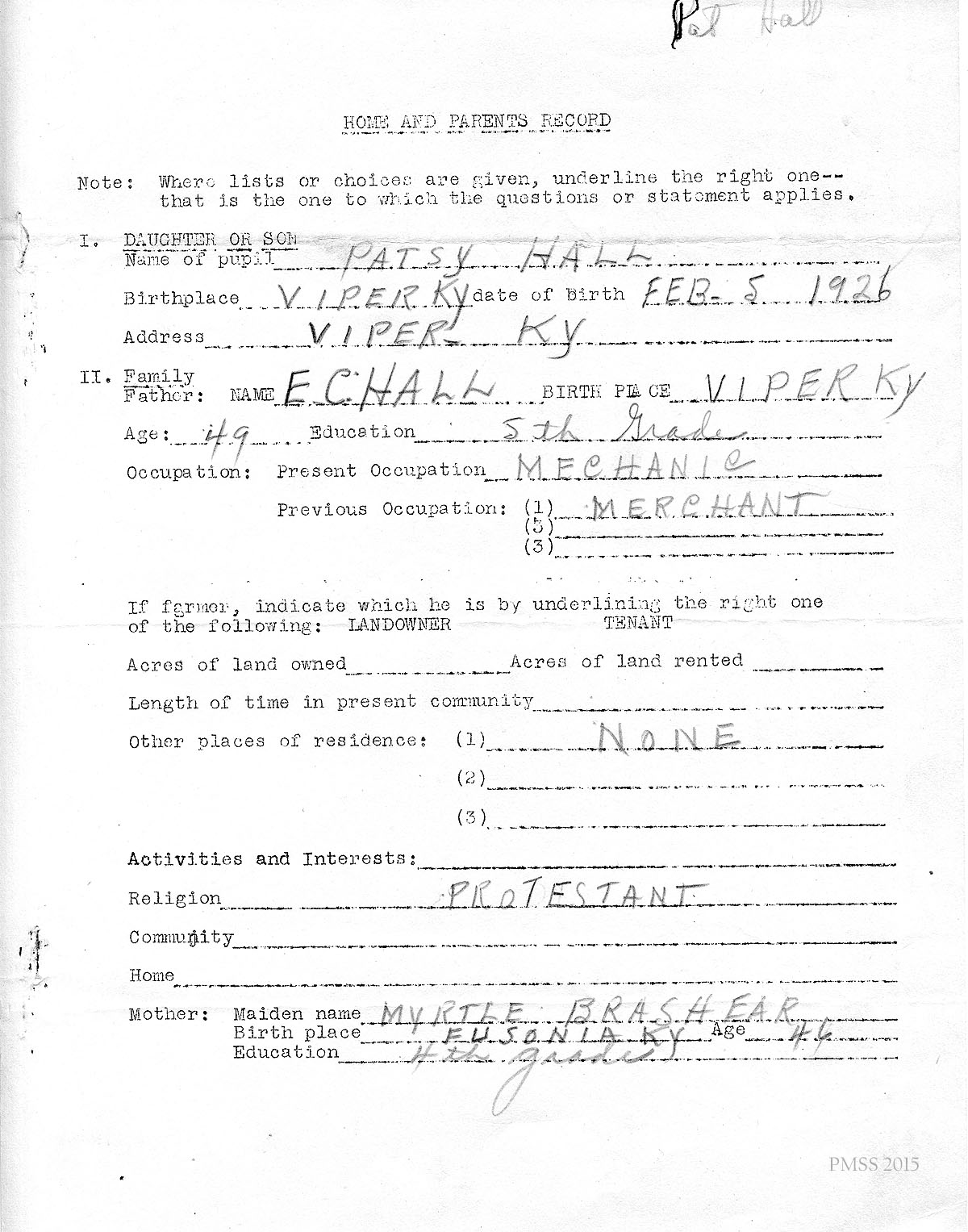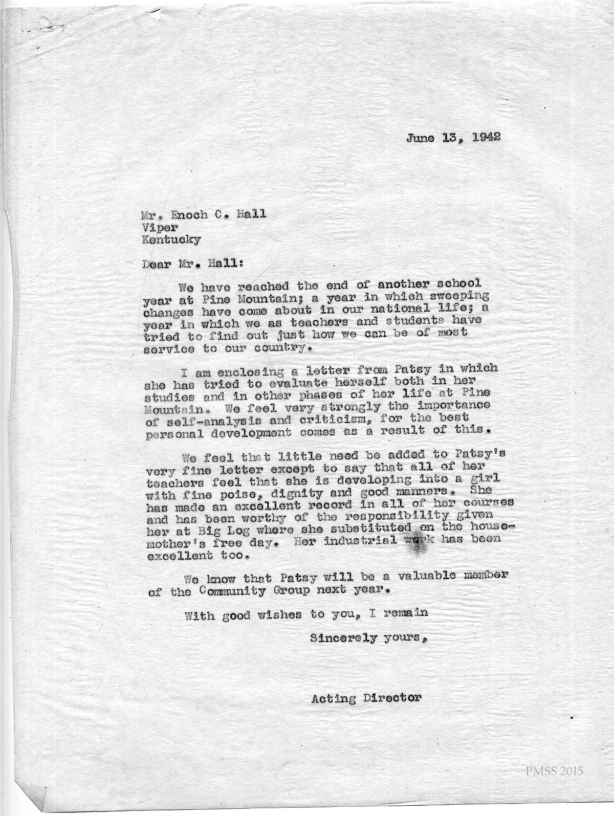 The Flora Patsy Hall correspondence and record at Pine Mountain Settlement School is voluminous, as is sometimes the case when students have many years at the school and many succeeding years in which they are active in School affairs. For example, Patsy was a long-time leader in the Alumni Association of the School. Flora Patsy Hall’s record as a student, is, however, unusually large. It contains one of the later and more documented and extensive records of growth as a student at the school in which each instructor weighed in on the student performance with an annual written report.
