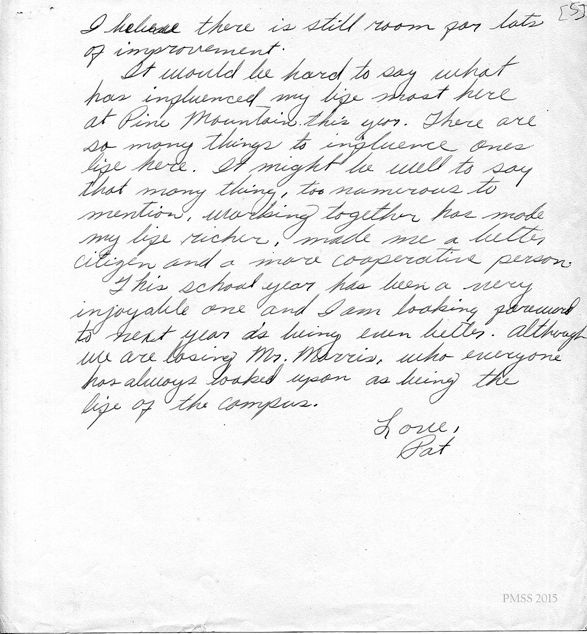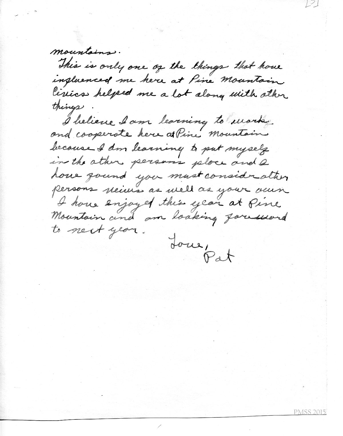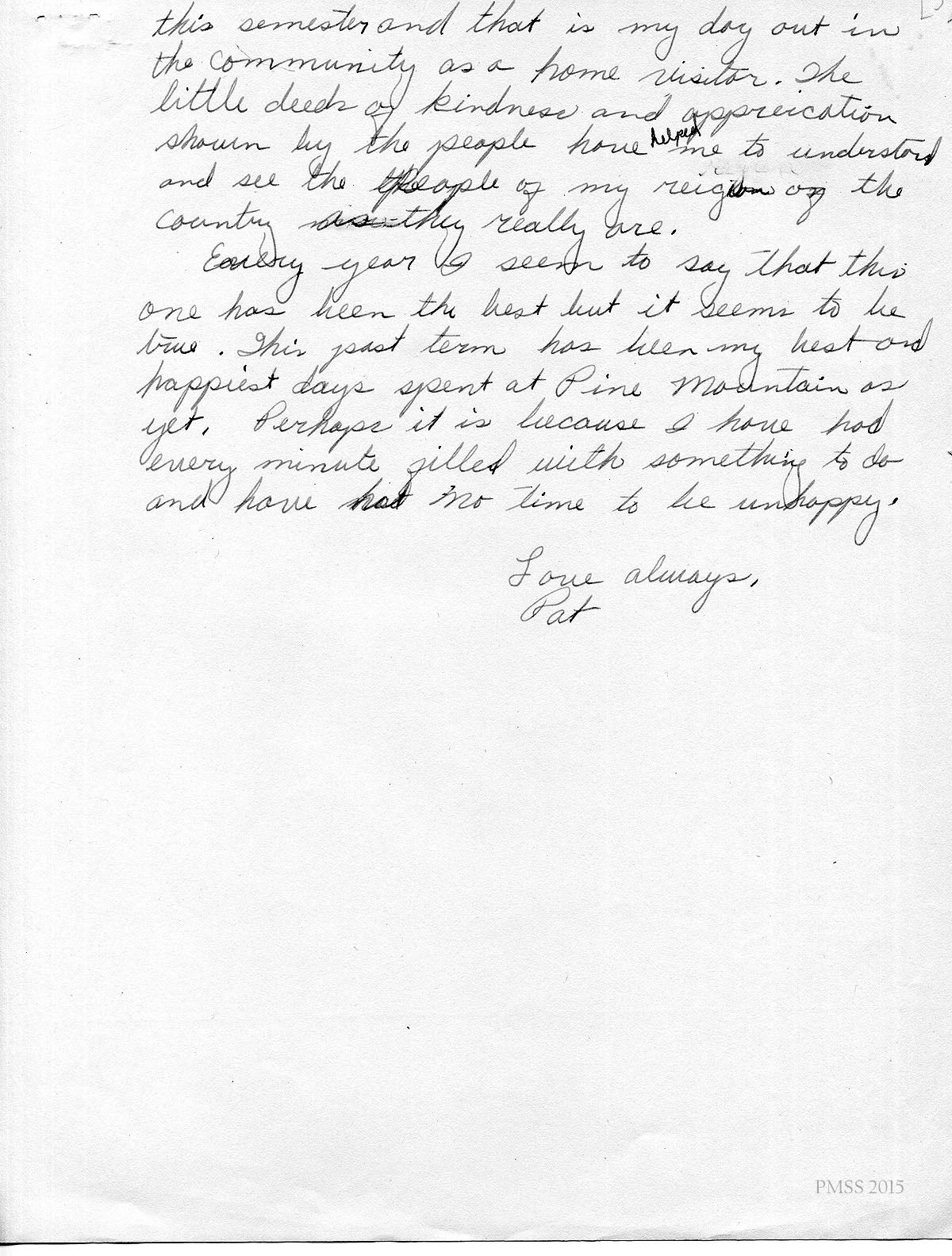 Her record is also an account of student education during WWII and illuminates the many impacts the World War had on the students at Pine Mountain Settlement. The intensity of engagement with the world beyond the mountains shines through her Student Record and in her decision-making processes. Her record and others at the School are compelling in their individual adaptation to the terrors, the limited resources, and their deep appreciation of their education in troubled time. The lessons of the School were life-changing in so many respects and shine through the self evaluation of Pat’s school record and those of her classmates. The lessons for contemporary education are there for each reader to explore. That Pat chose to become a teacher would not be surprising. Also, not surprising, would be to find many of the lessons of Pine Mountain introduced into her Indiana classrooms over the years.