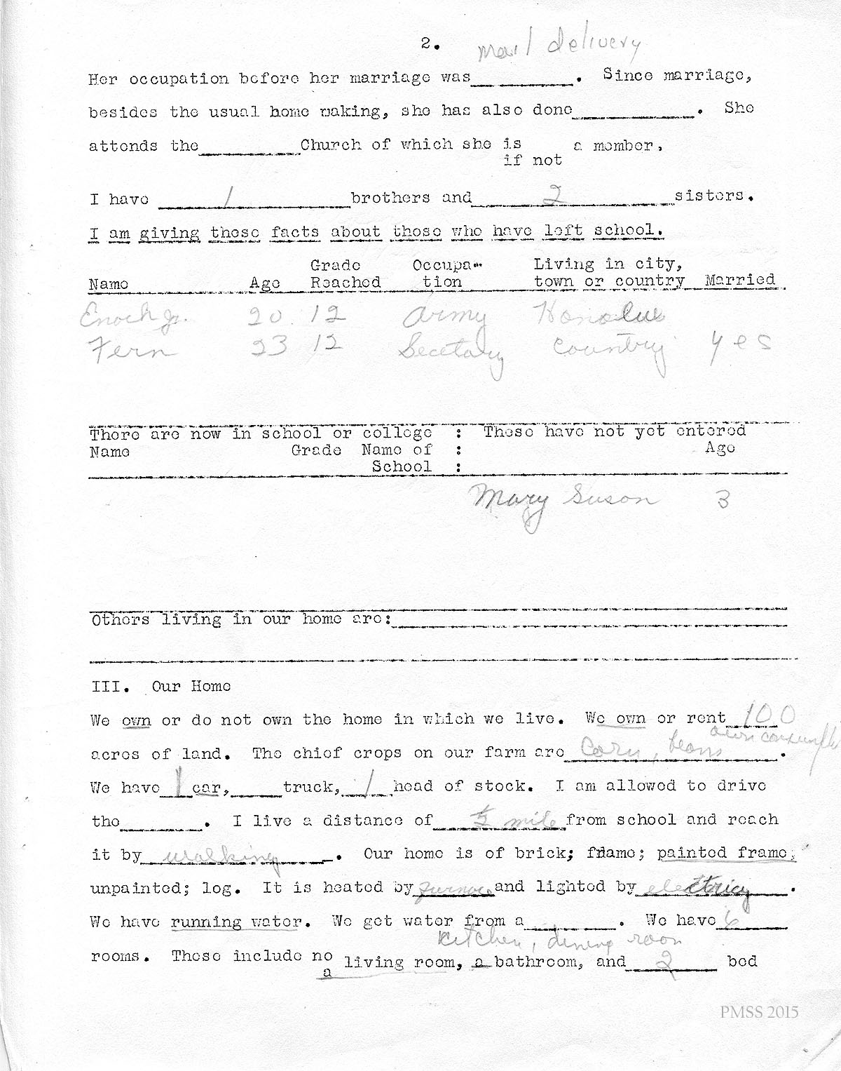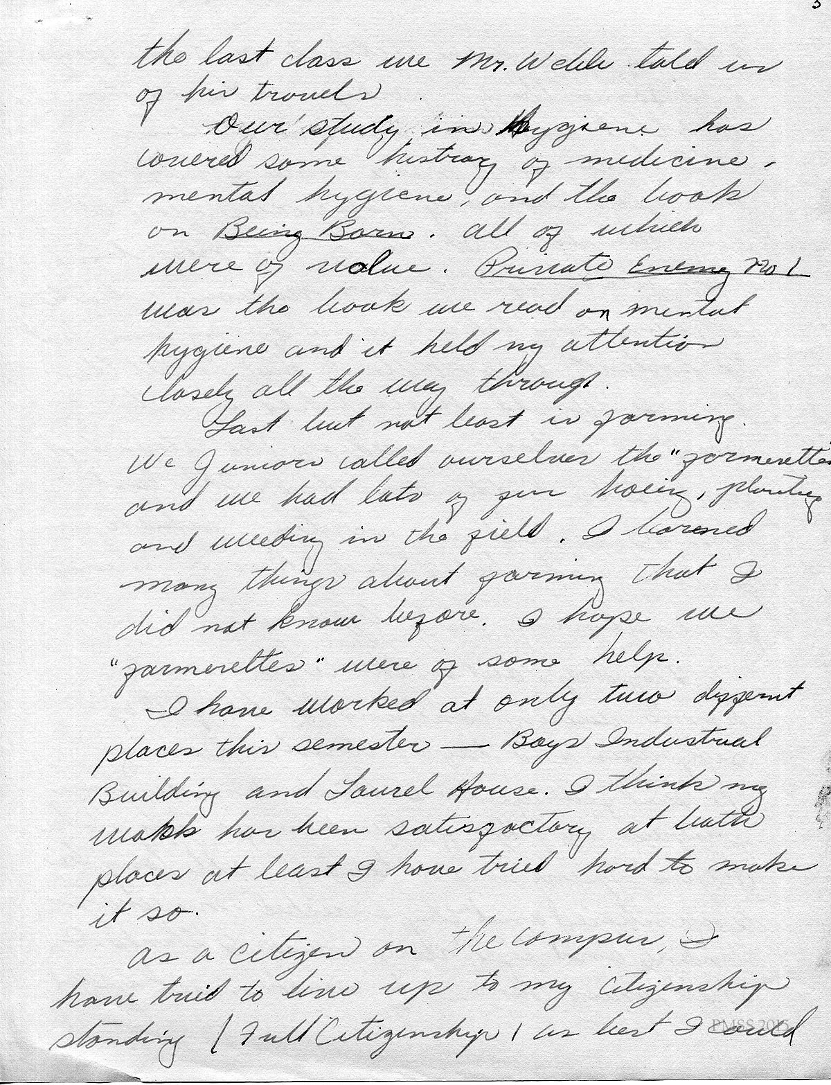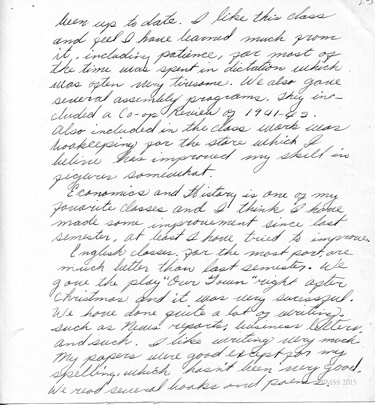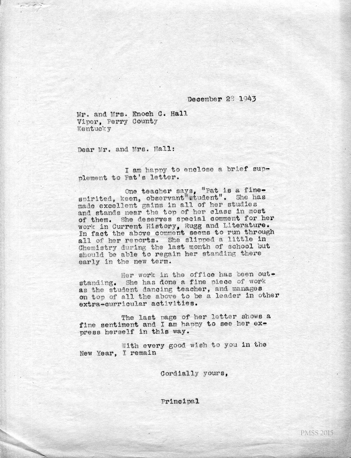Her record is also an account of student education during WWII and illuminates the many impacts the World War had on the students at Pine Mountain Settlement. The intensity of engagement with the world beyond the mountains shines through her Student Record and in her decision-making processes. Her record and others at the School are compelling in their individual adaptation to the terrors, the limited resources, and their deep appreciation of their education in troubled time. The lessons of the School were life-changing in so many respects and shine through the self evaluation of Pat’s school record and those of her classmates. The lessons for contemporary education are there for each reader to explore. That Pat chose to become a teacher would not be surprising. Also, not surprising, would be to find many of the lessons of Pine Mountain introduced into her Indiana classrooms over the years.