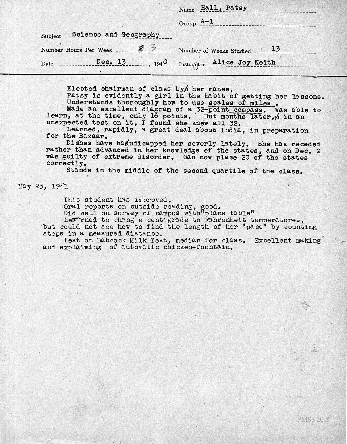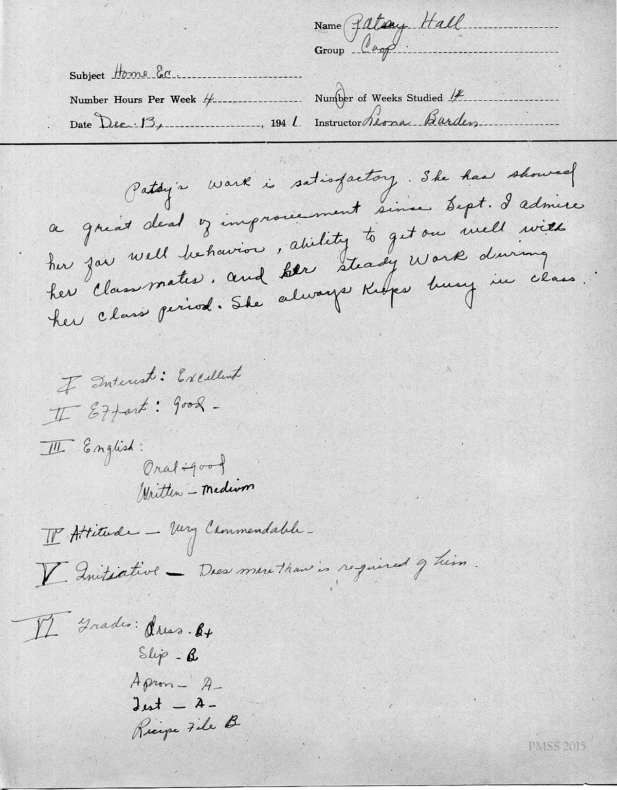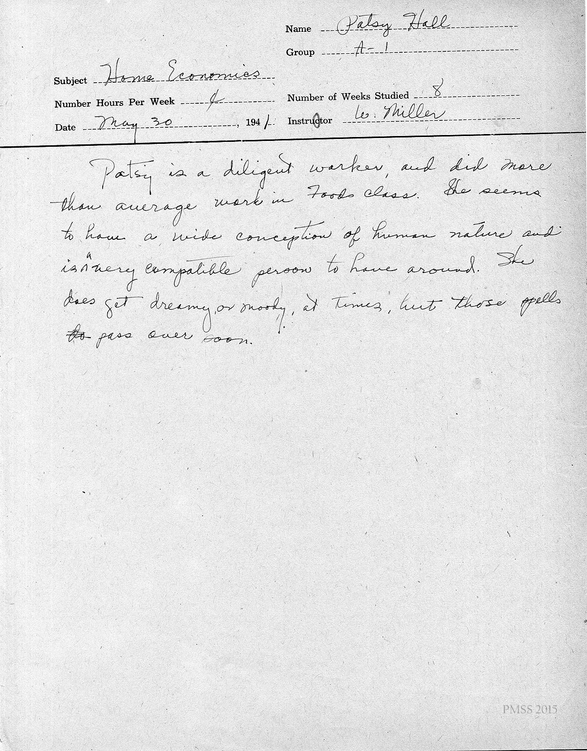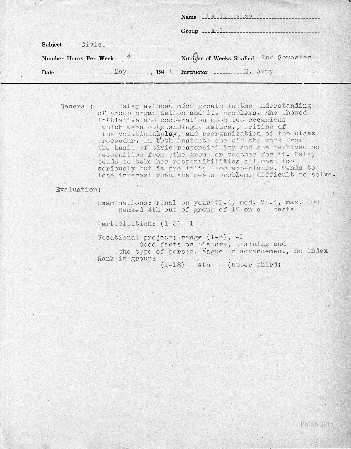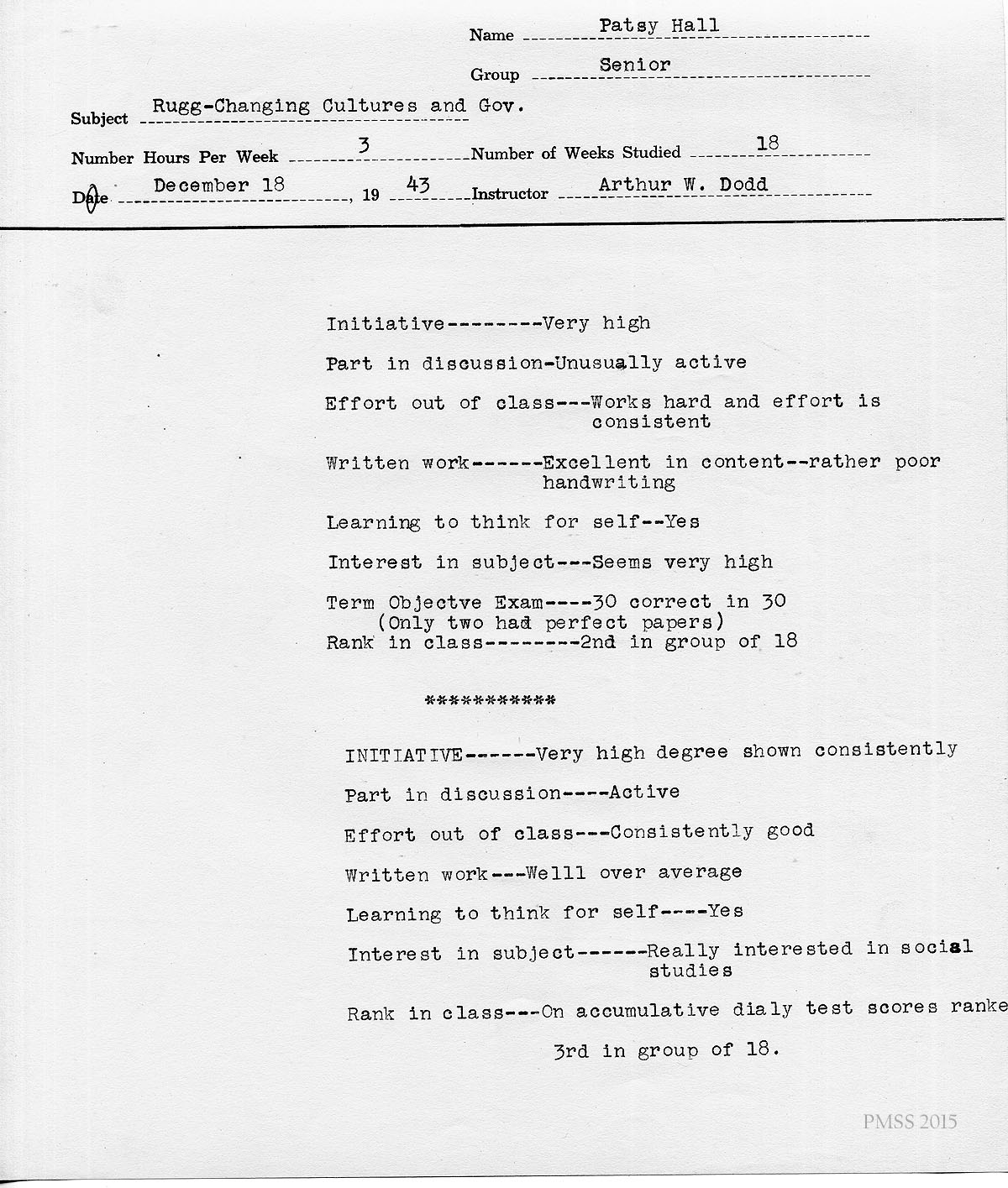 As in many of the student biographies, some of Patsy’s academic records (testing, for example) have not been included in the Correspondence page in order to retain privacy. Flora Patsy Hall is now in her early 90’s and has given permission to publish most of her school record and correspondence in this online archive of student records and the additional correspondence that the record produced.