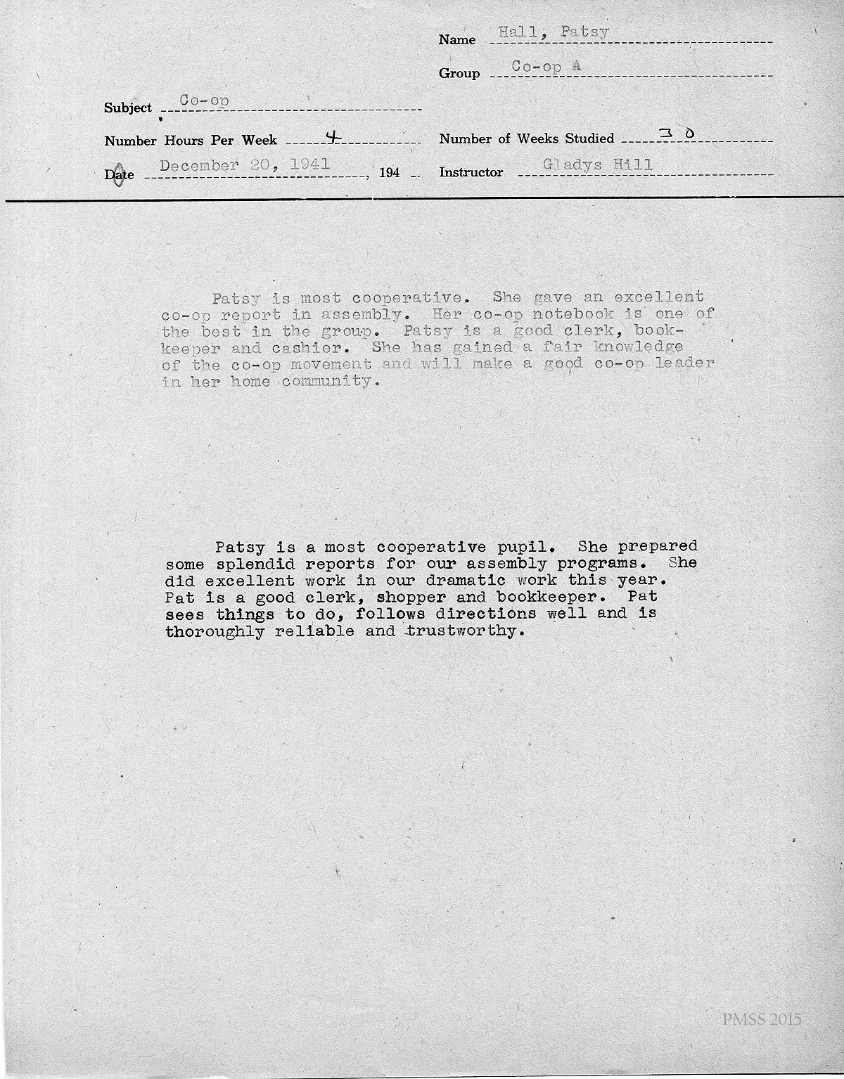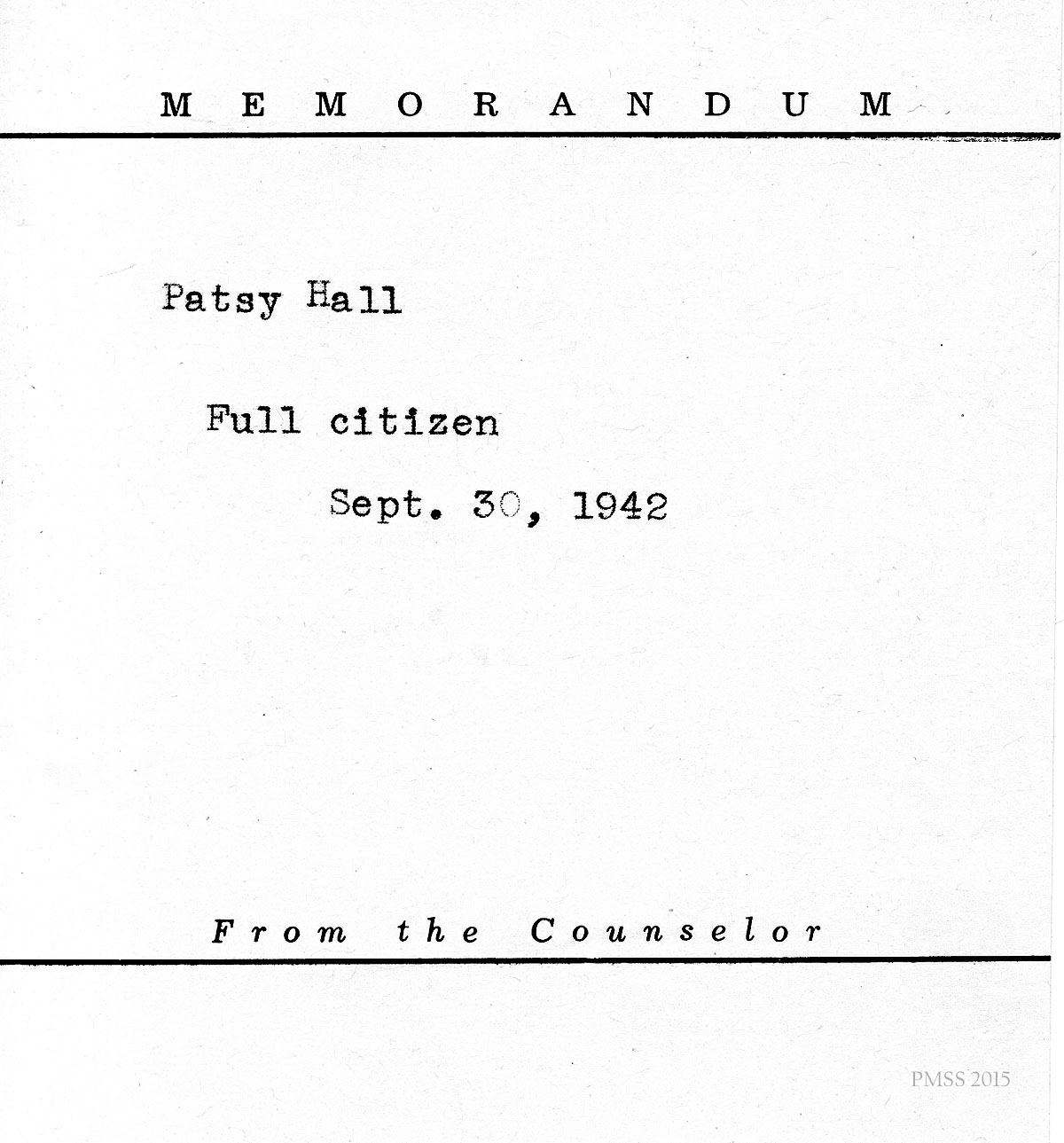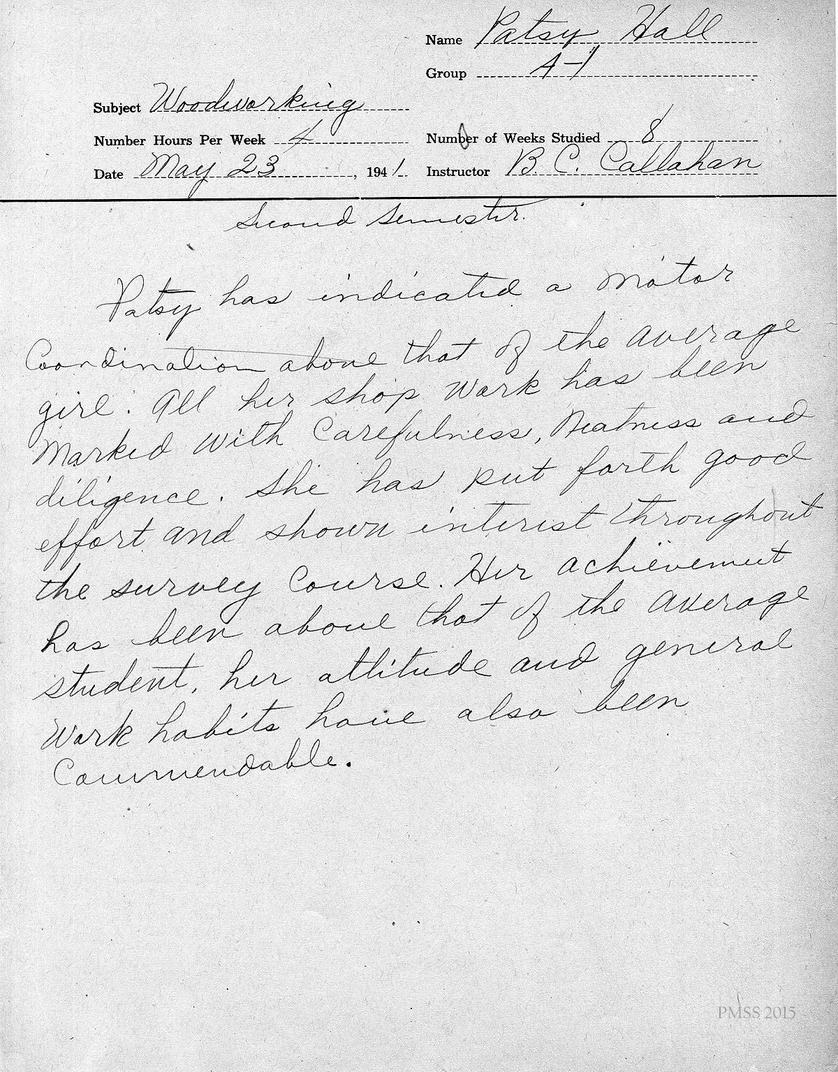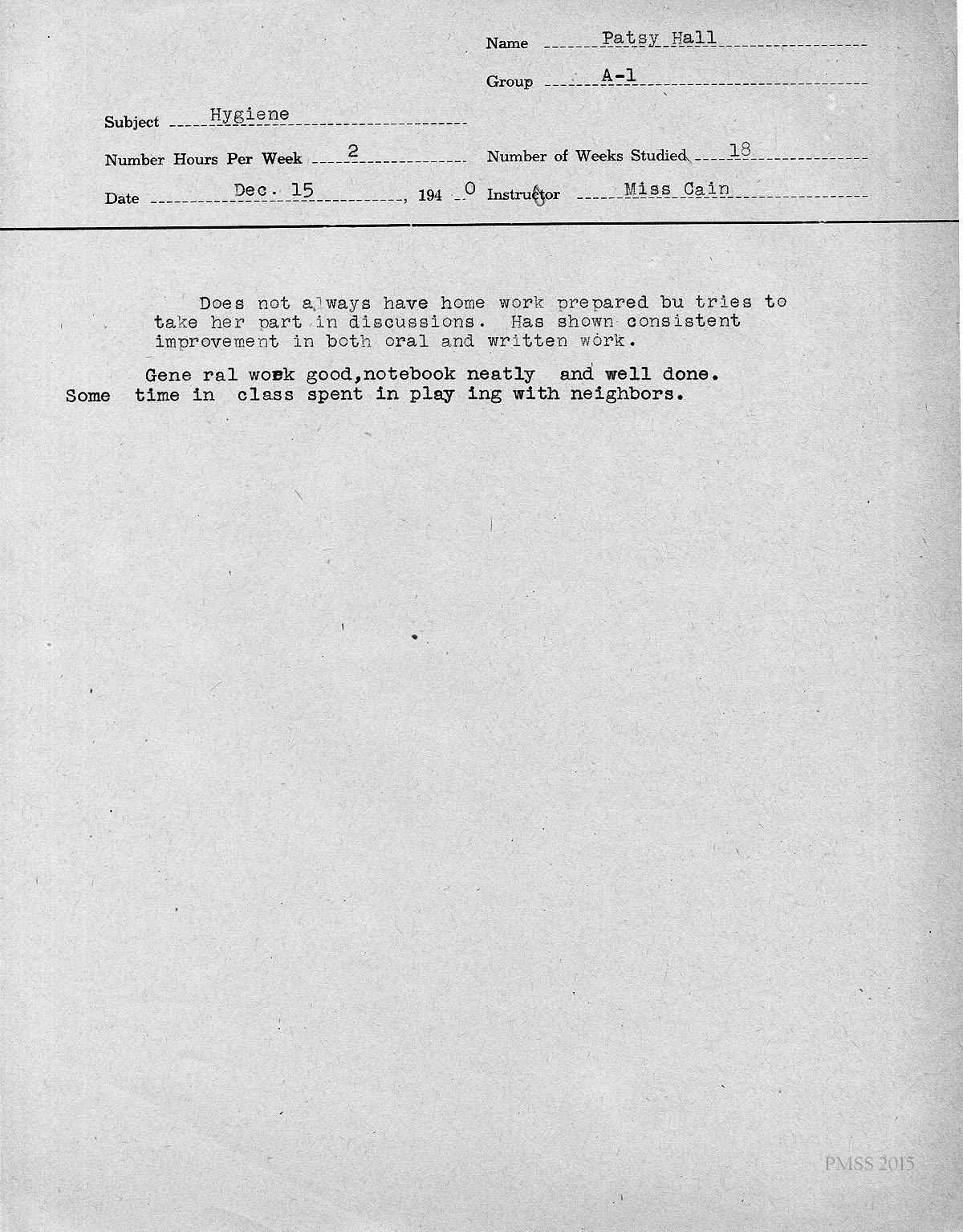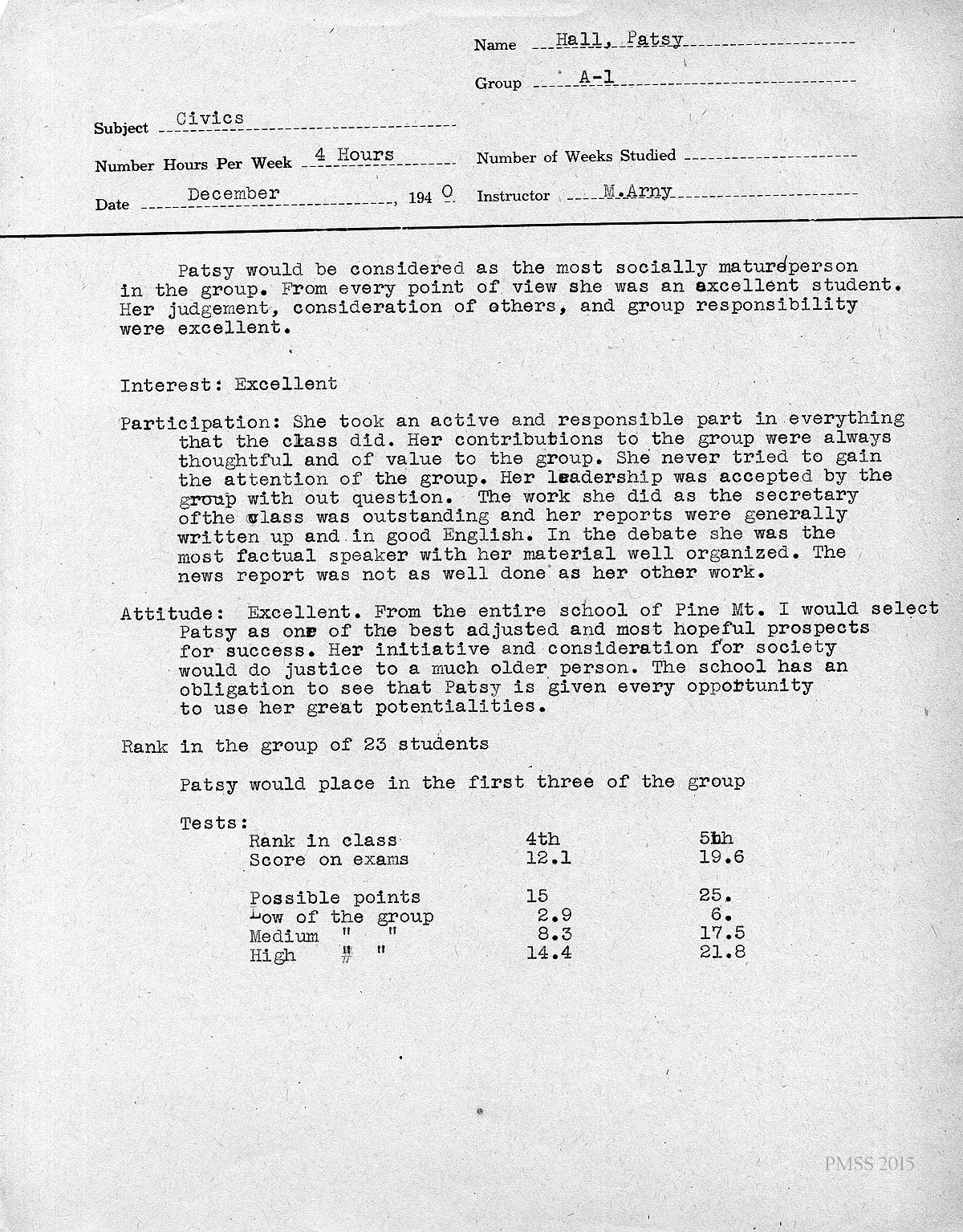 As in many of the student biographies, some of Patsy’s academic records (testing, for example) have not been included in the Correspondence page in order to retain privacy. Flora Patsy Hall is now in her early 90’s and has given permission to publish most of her school record and correspondence in this online archive of student records and the additional correspondence that the record produced.