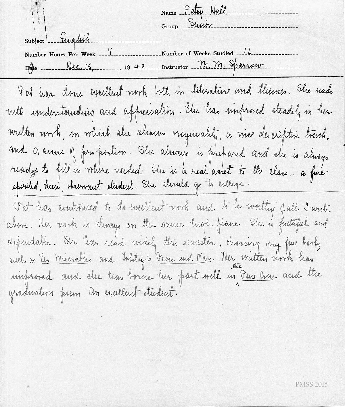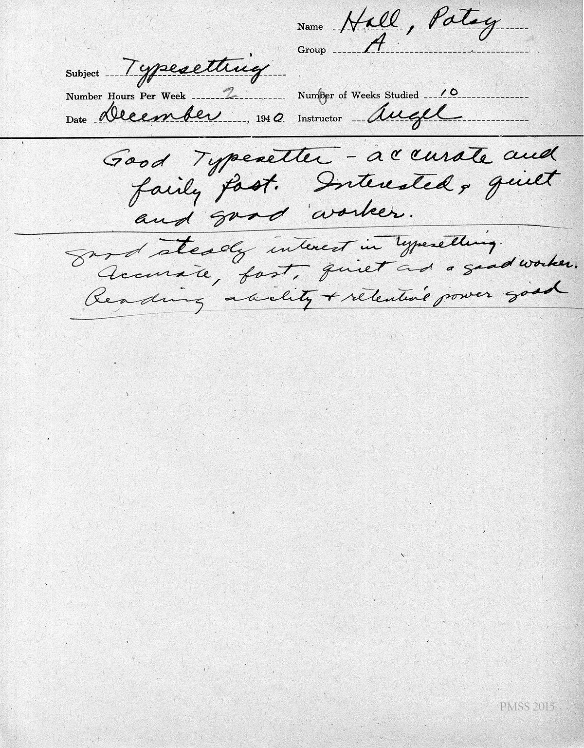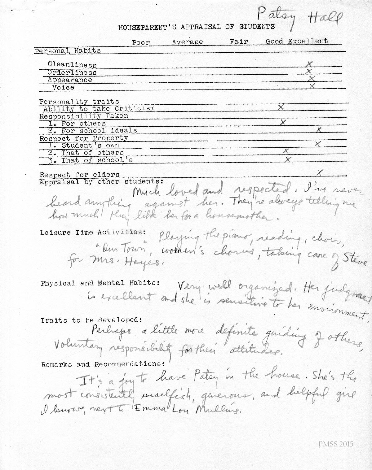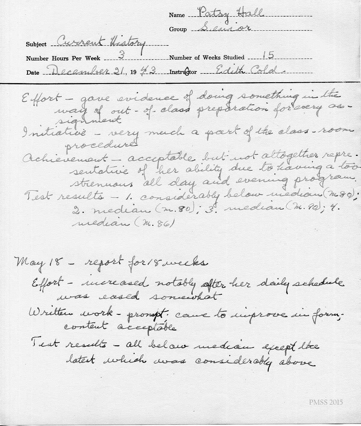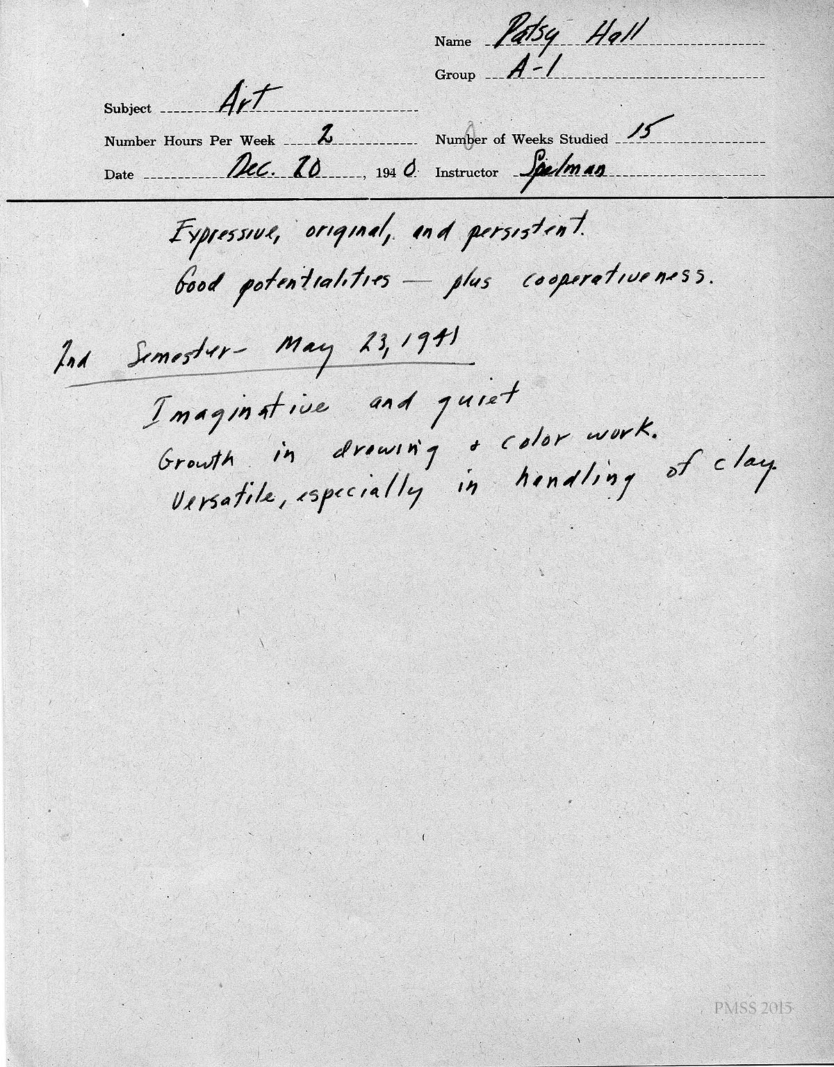 As in many of the student biographies, some of Patsy’s academic records (testing, for example) have not been included in the Correspondence page in order to retain privacy. Flora Patsy Hall is now in her early 90’s and has given permission to publish most of her school record and correspondence in this online archive of student records and the additional correspondence that the record produced.