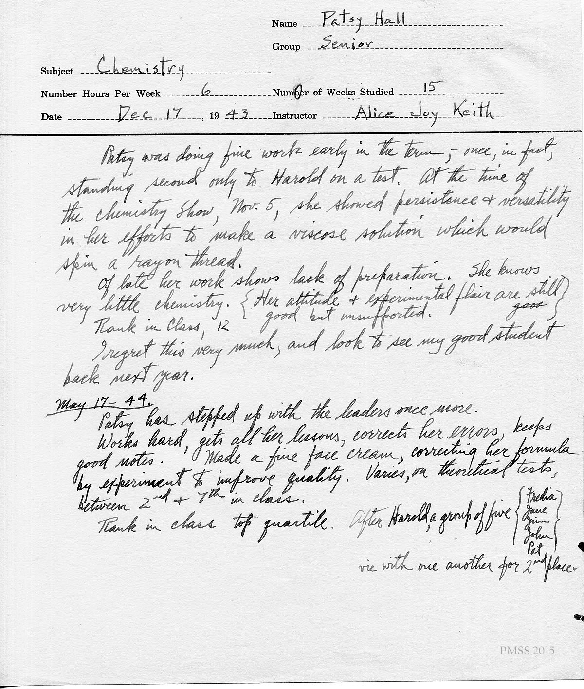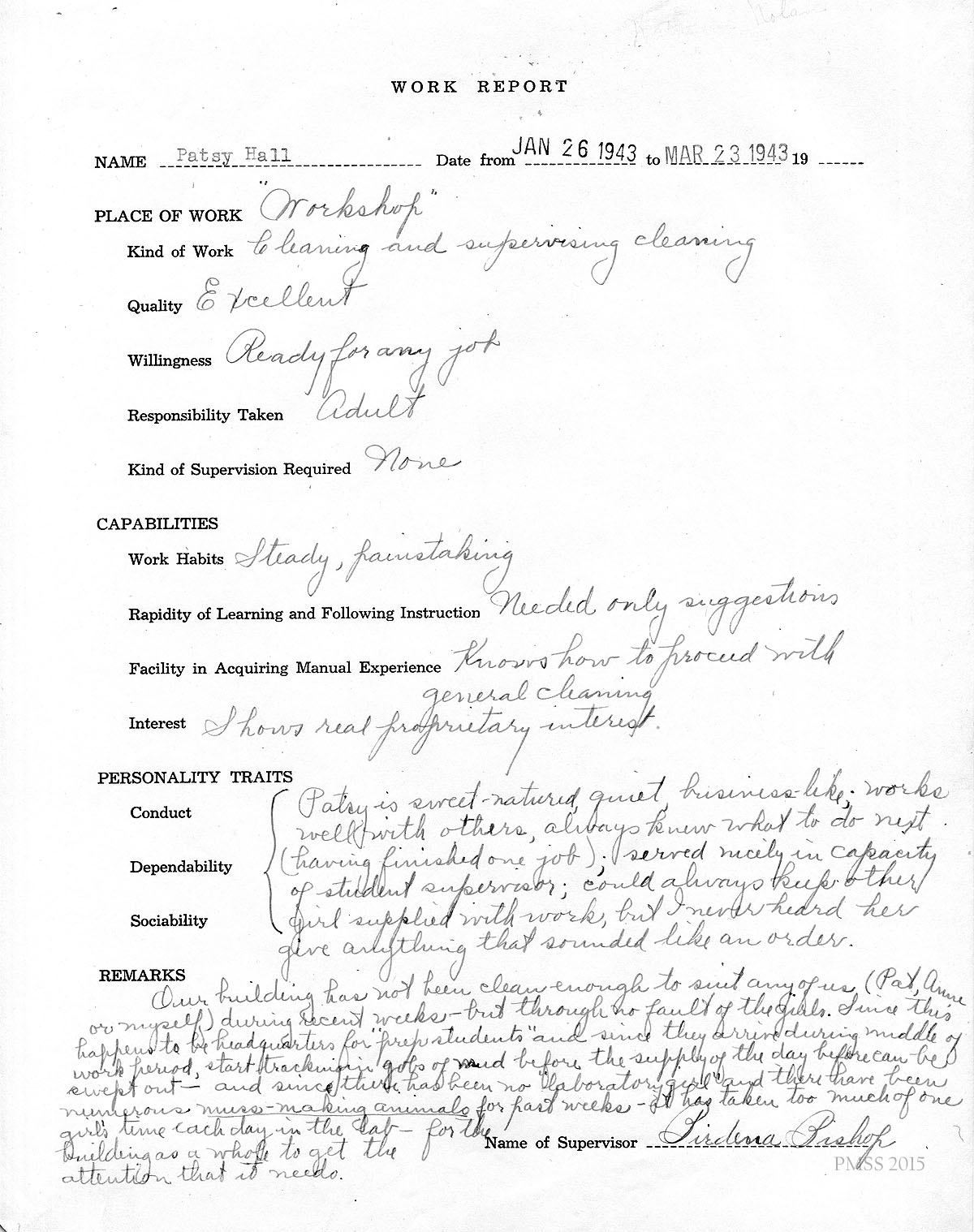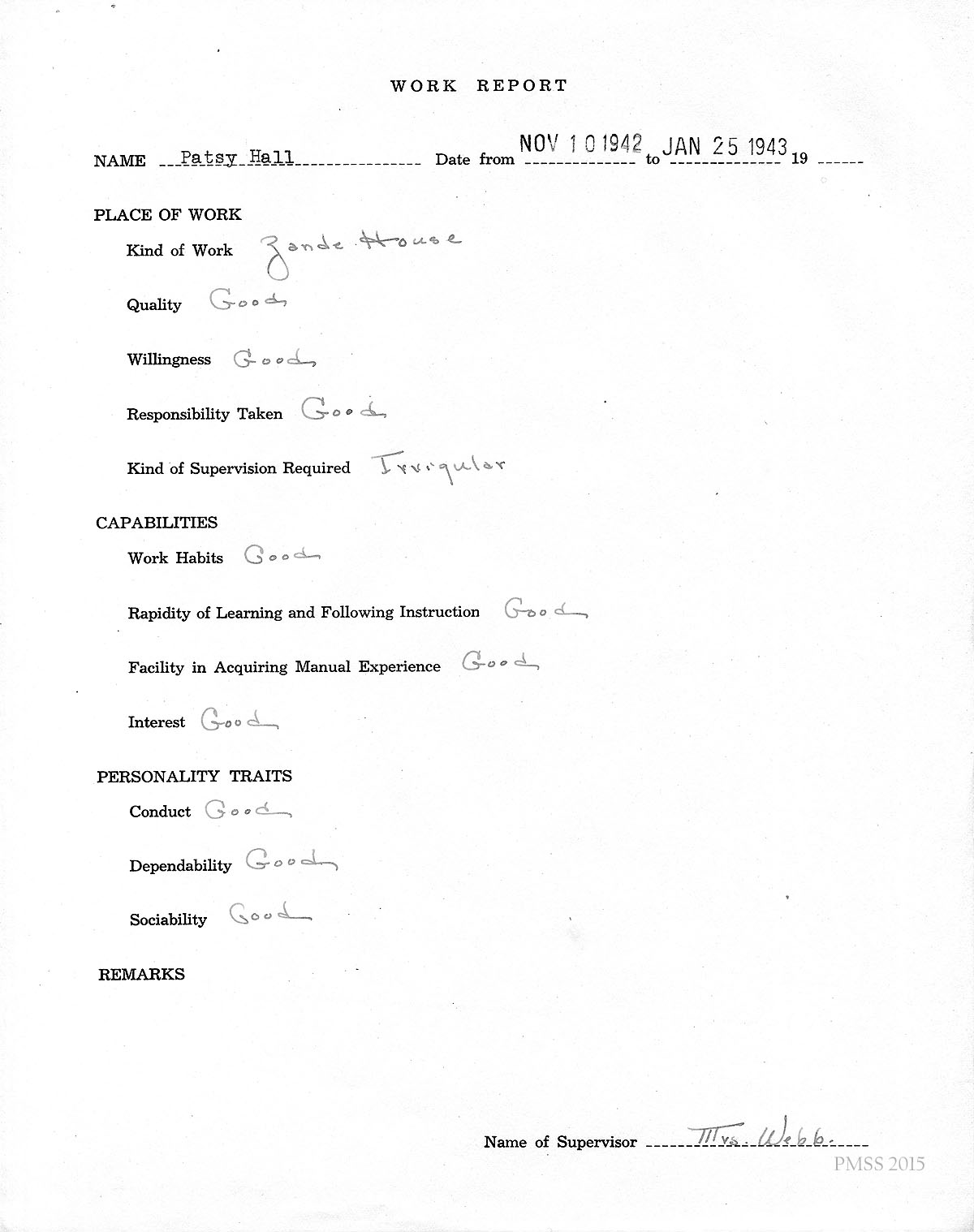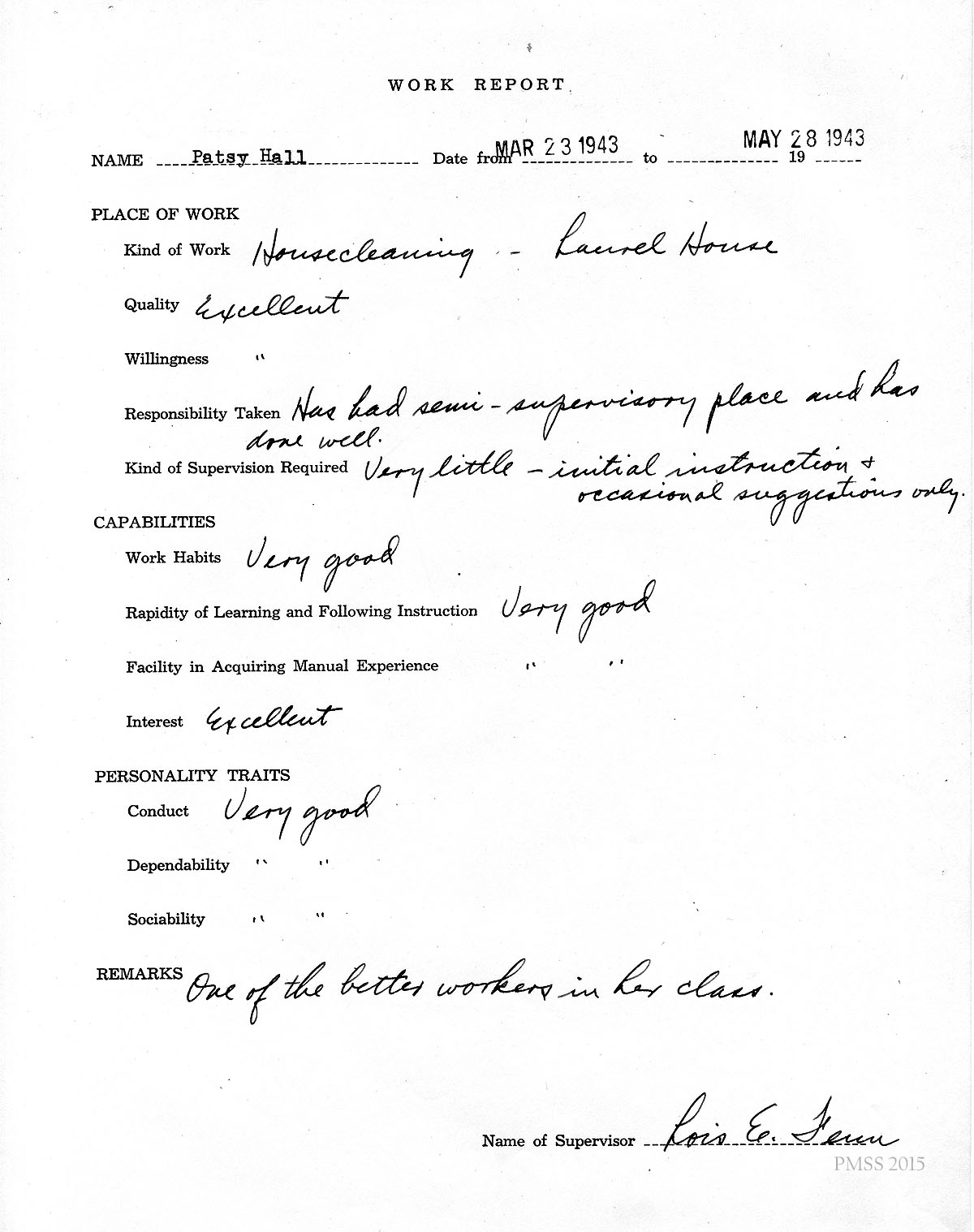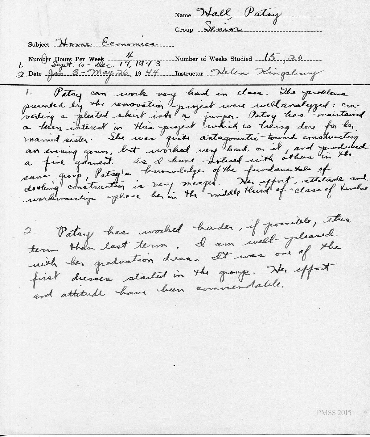 As in many of the student biographies, some of Patsy’s academic records (testing, for example) have not been included in the Correspondence page in order to retain privacy. Flora Patsy Hall is now in her early 90’s and has given permission to publish most of her school record and correspondence in this online archive of student records and the additional correspondence that the record produced.