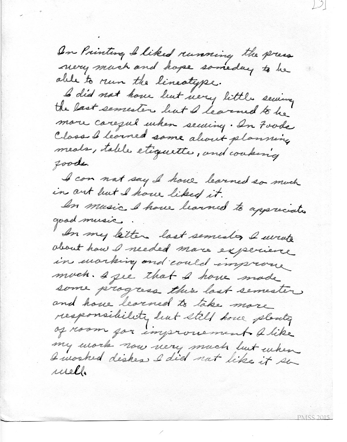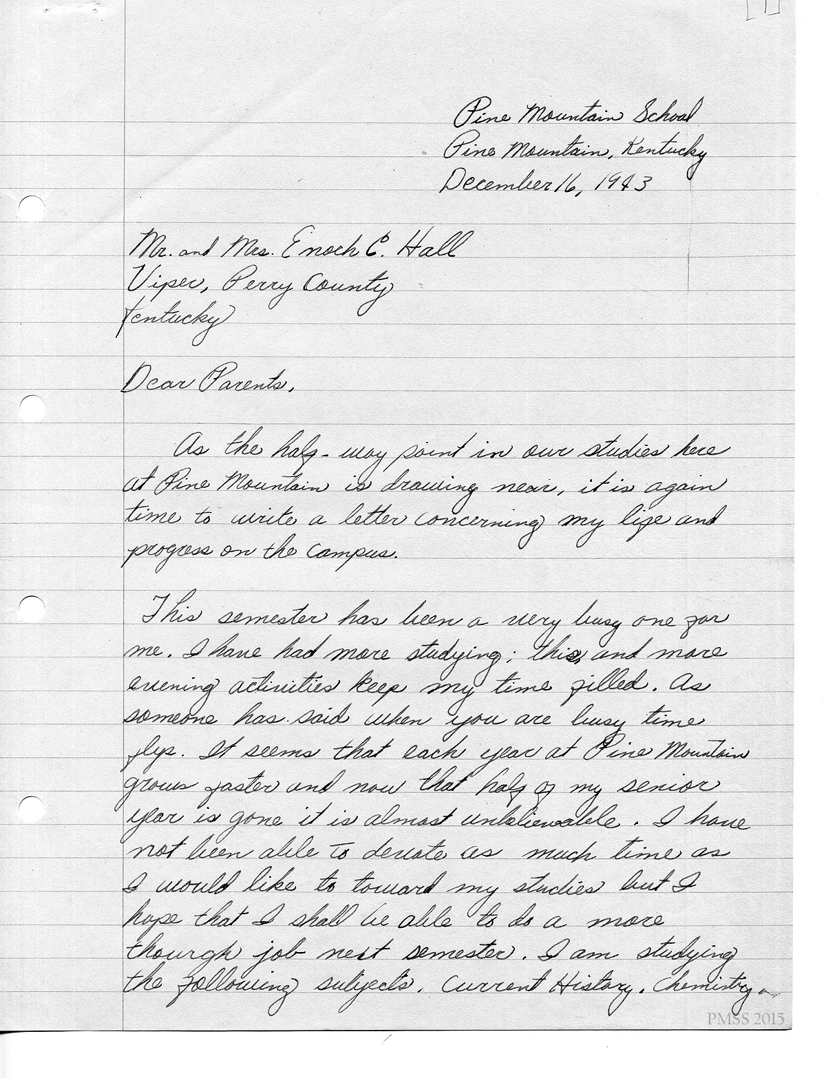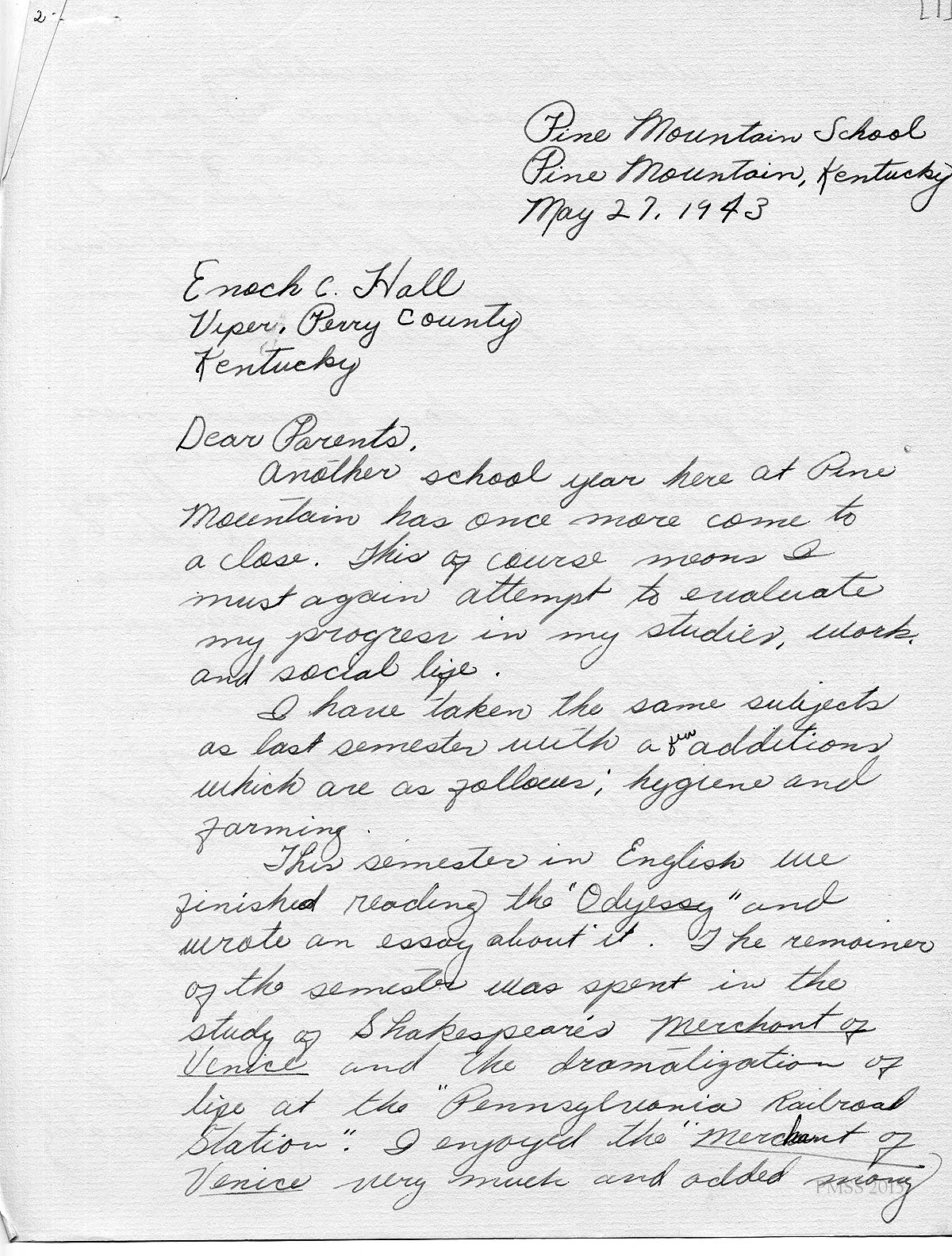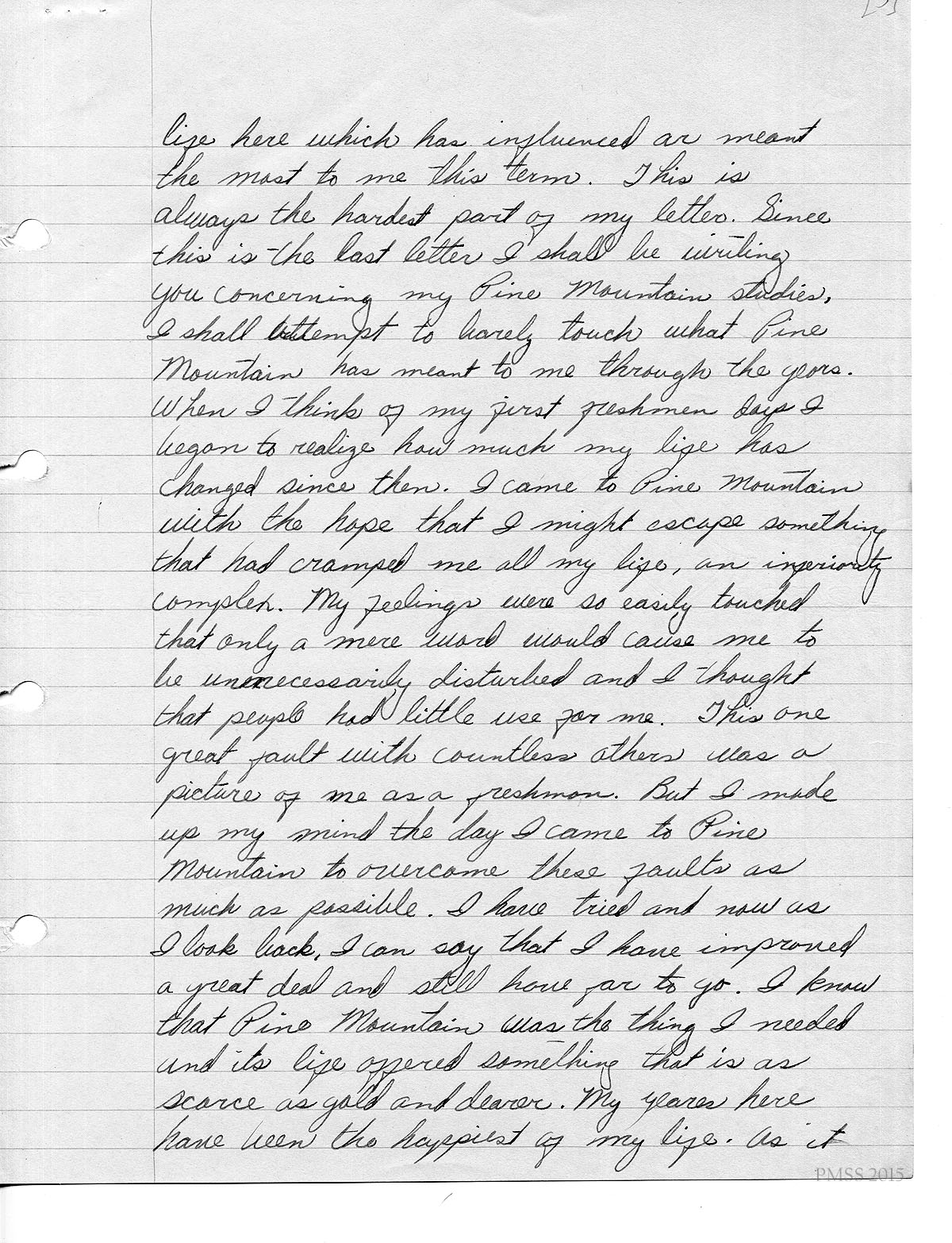 Of particular interest are the “Letters Home” in which students were obligated to report to parents on the progress they were making at the school and the reports were then validated by means of the narrative teacher “record”. The recording of each year of work by her teachers, supervisors, and housemothers produced a large body of evaluative material. The student “Letters Home” and Evaluations are unique insights into the educational experience and processes at Pine Mountain Settlement School as instituted by Glyn Morris, during his tenure as the Director and filled the gap of the typical registrar school records that were not collected.