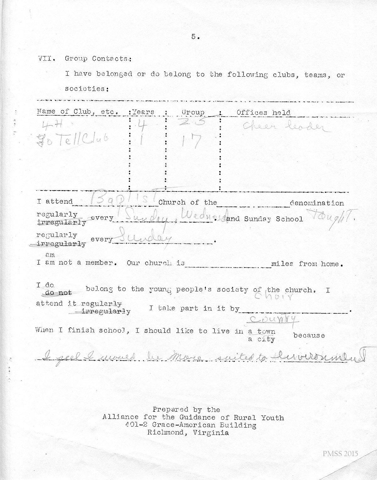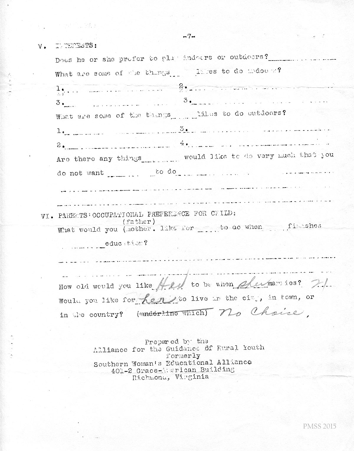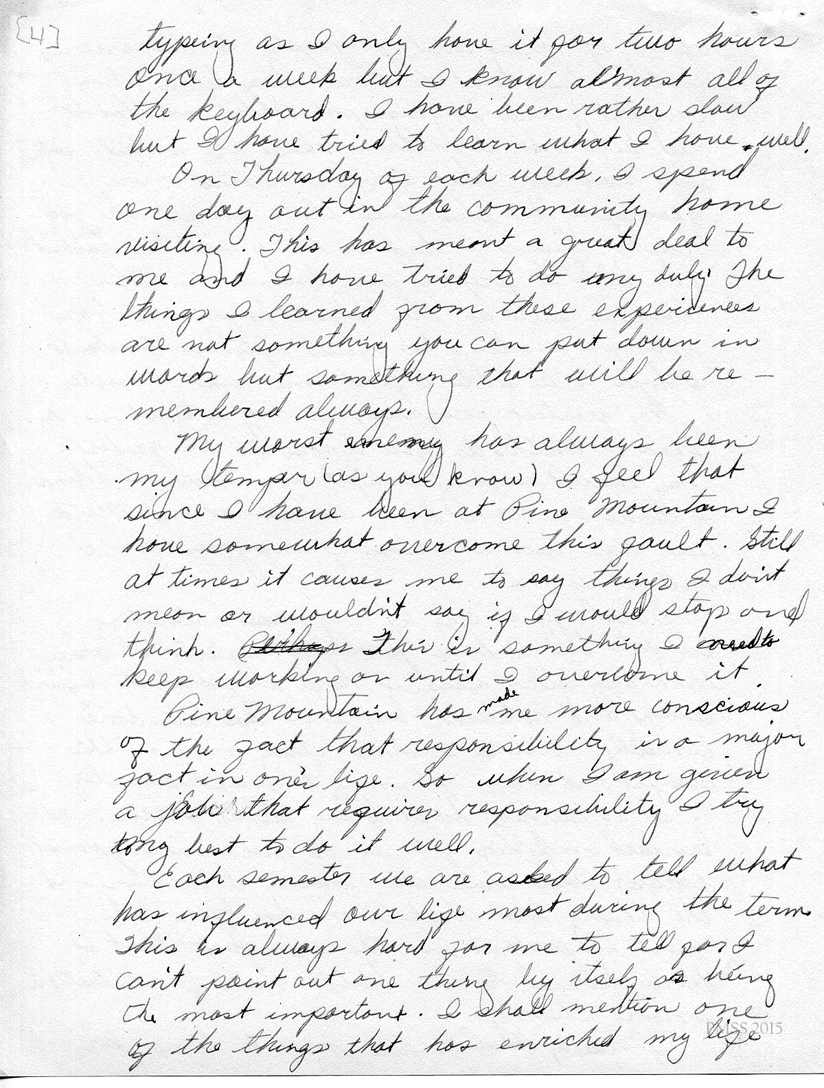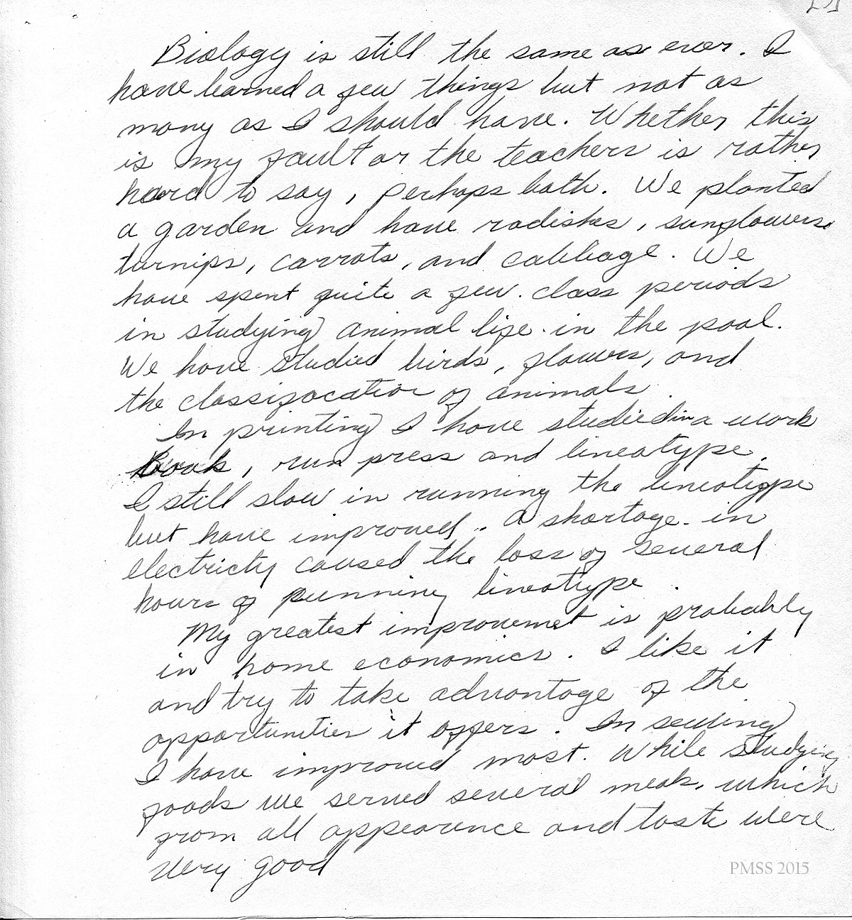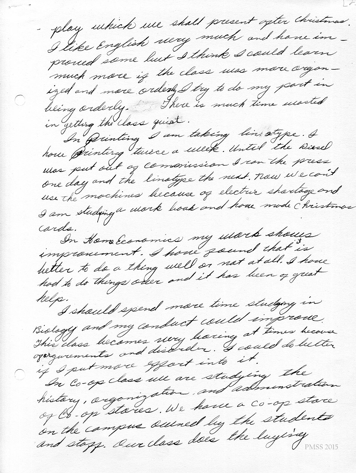 Of particular interest are the “Letters Home” in which students were obligated to report to parents on the progress they were making at the school and the reports were then validated by means of the narrative teacher “record”. The recording of each year of work by her teachers, supervisors, and housemothers produced a large body of evaluative material. The student “Letters Home” and Evaluations are unique insights into the educational experience and processes at Pine Mountain Settlement School as instituted by Glyn Morris, during his tenure as the Director and filled the gap of the typical registrar school records that were not collected.