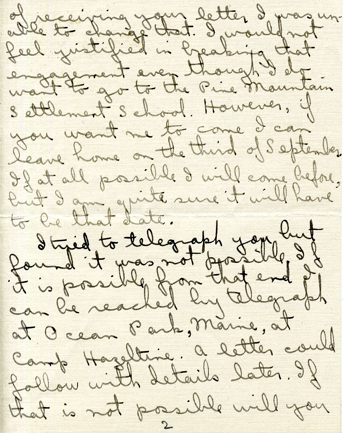 - August 18. Katherine Pettit to Florence Daniels inviting her to work at Pine Mountain and answering some of her questions. (4 pages)