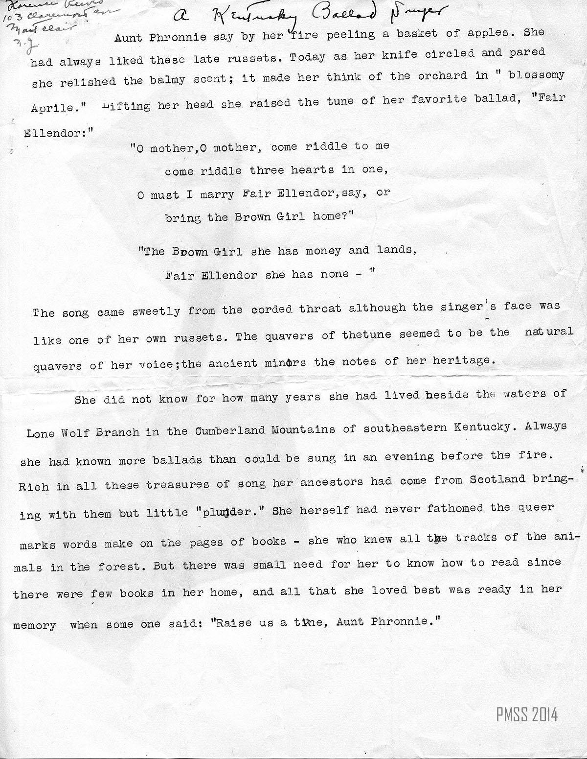 [Handwritten title] A Kentucky Ballad Singer