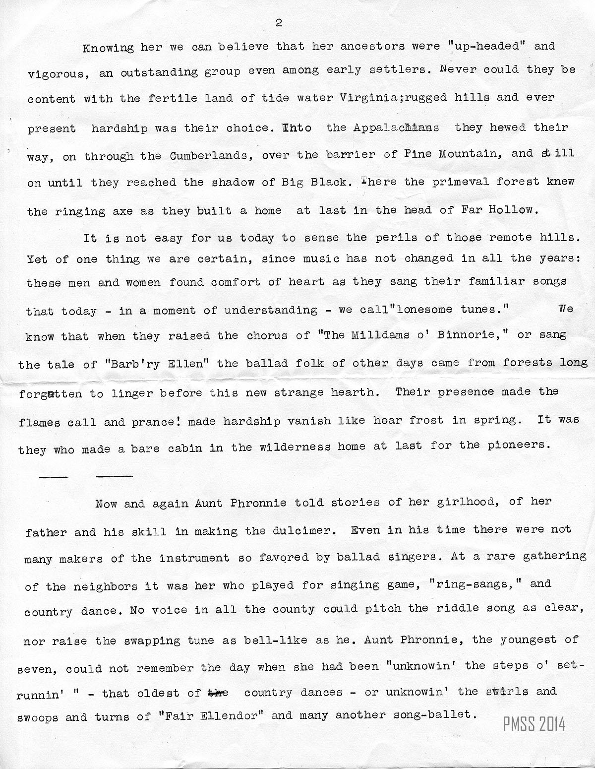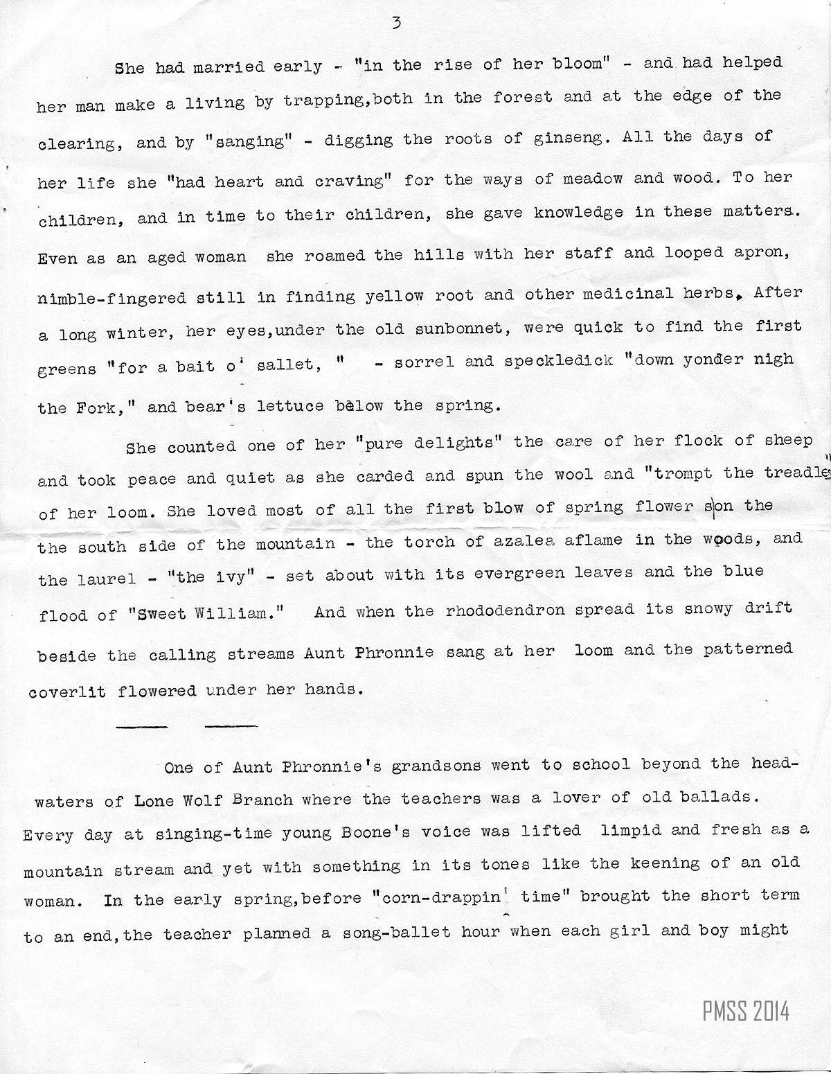One day when I was wanting to write I thought: “Why not try to write about the ballads I heard at the school?” So I tried. Then I discovered I wanted a person in the article who could represent the old way of life in the hills. That made me think of Aunt Sal. So, little by little, the article came together….