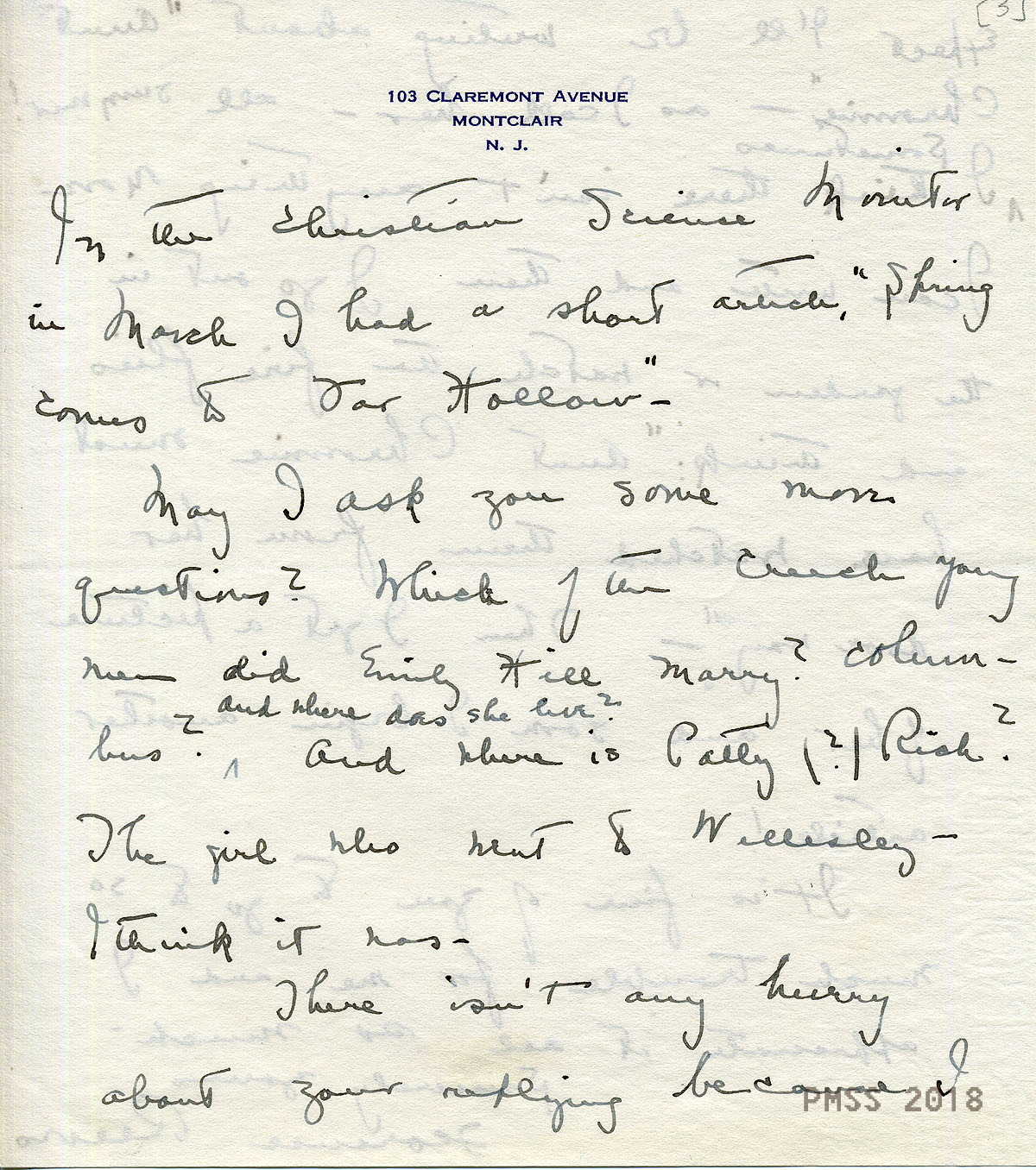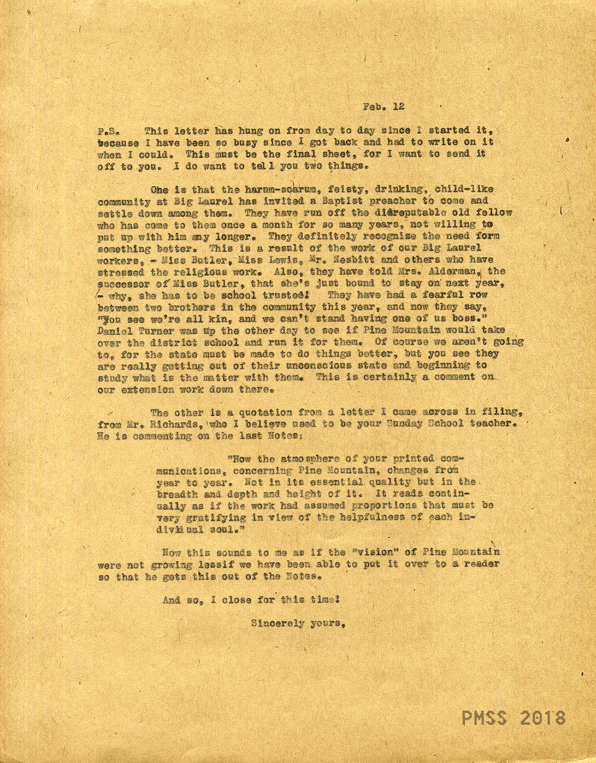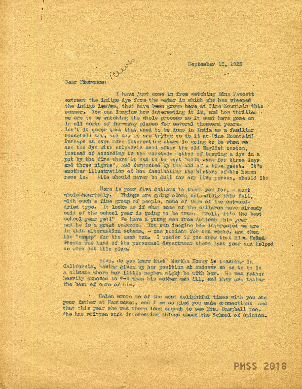 TAGS: Florence Reeves Correspondence; Florence Reeves; Pine Mountain Settlement School; correspondence; workers; summer workers; staff; poetry; writers; Evelyn K. Wells; Olive Dame Campbell; Marguerite Butler; Danish Folk Schools; folk schools; libraries; books; settlement school vision; Line Fork Settlement; Medical Settlement at Big Laurel; fund-raising; donations; publicity; Montclair, N.J.; cooperative program; Co-op; community service; educational programming
