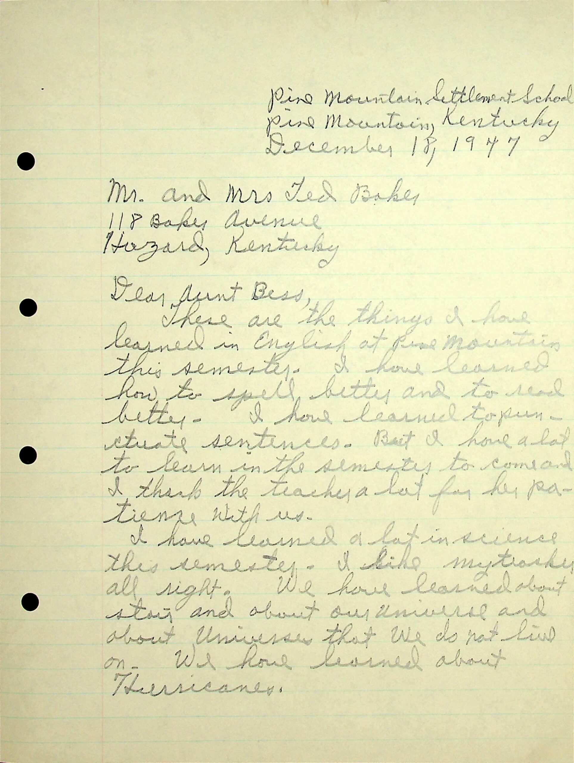 01 December 18, 1947. Three-page letter to Mr. and Mrs. Ted Baker (“Dear Aunt Bess”) in Hazard, KY, from Fred Baker at PMSS. He describes what he has learned this semester in English (spelling, punctuation); science (stars, universe, hurricanes);