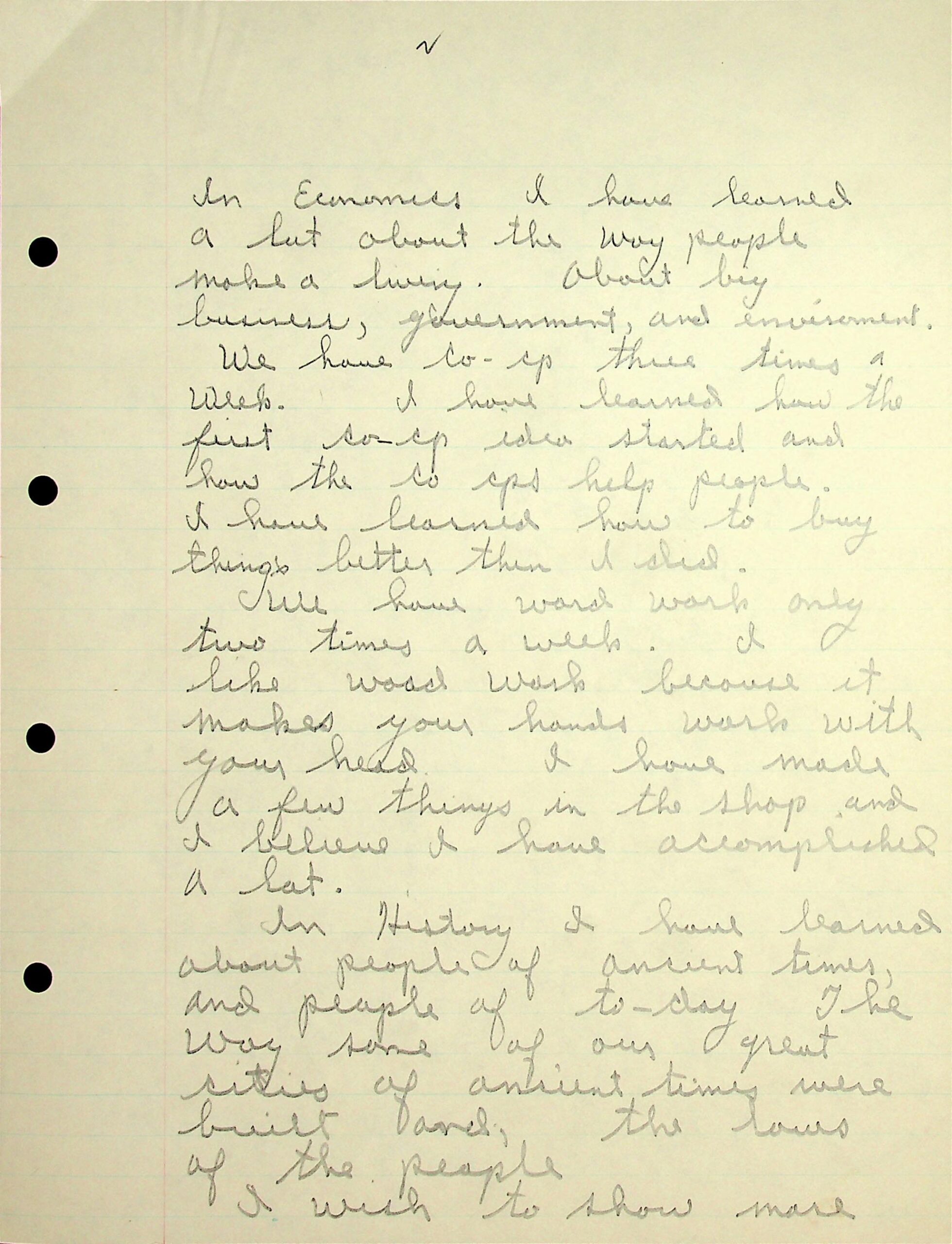 10 (Page 2) Economics (“the way people make a living”, big business, government, environment). In Co-op, he has learned about the Co-op’s history and “how the co-ops help people. I learned how to buy things better than I did.”; woodwork; history (“The way some of our great cities of ancient times were built and the laws of the people”).