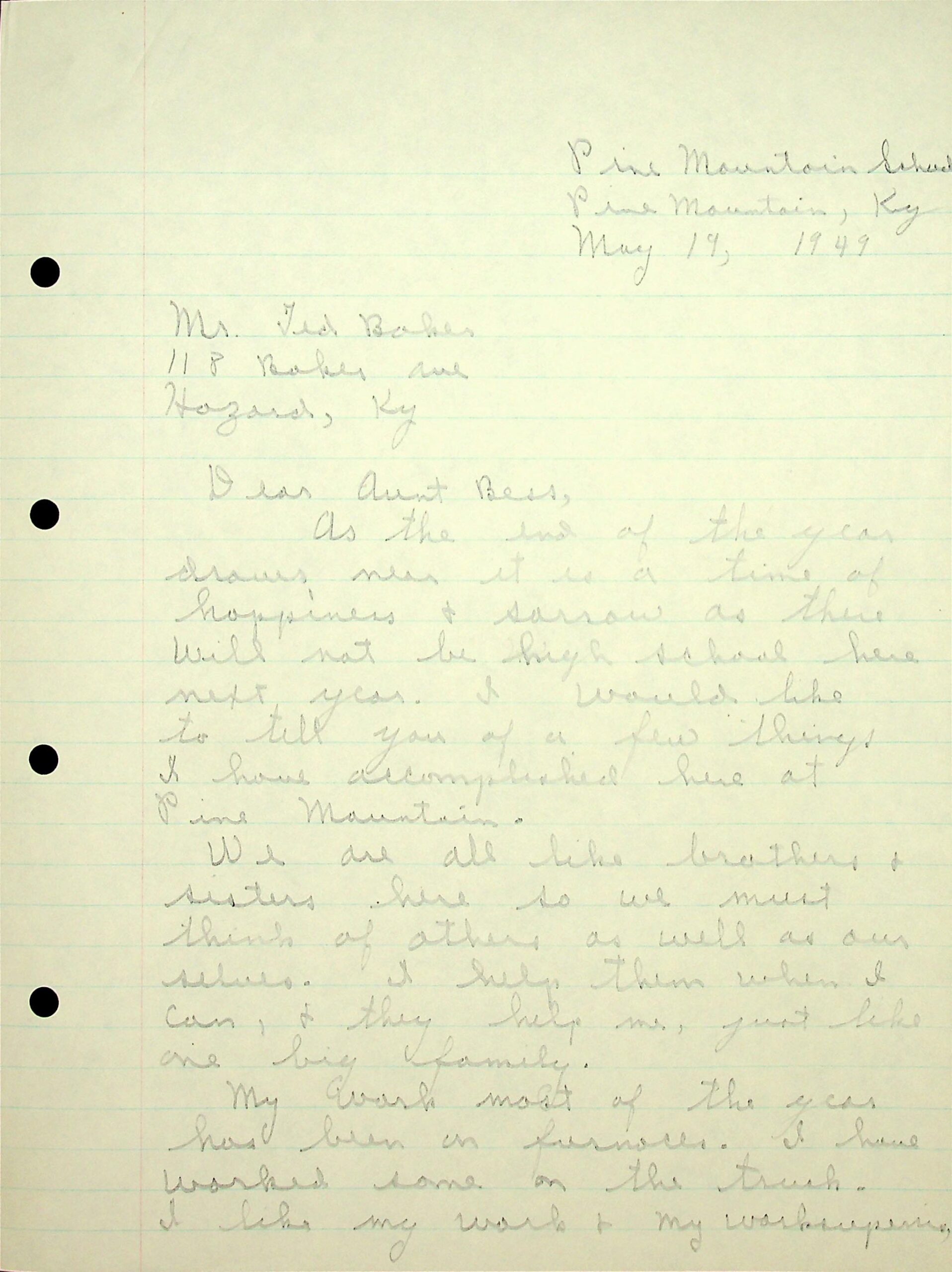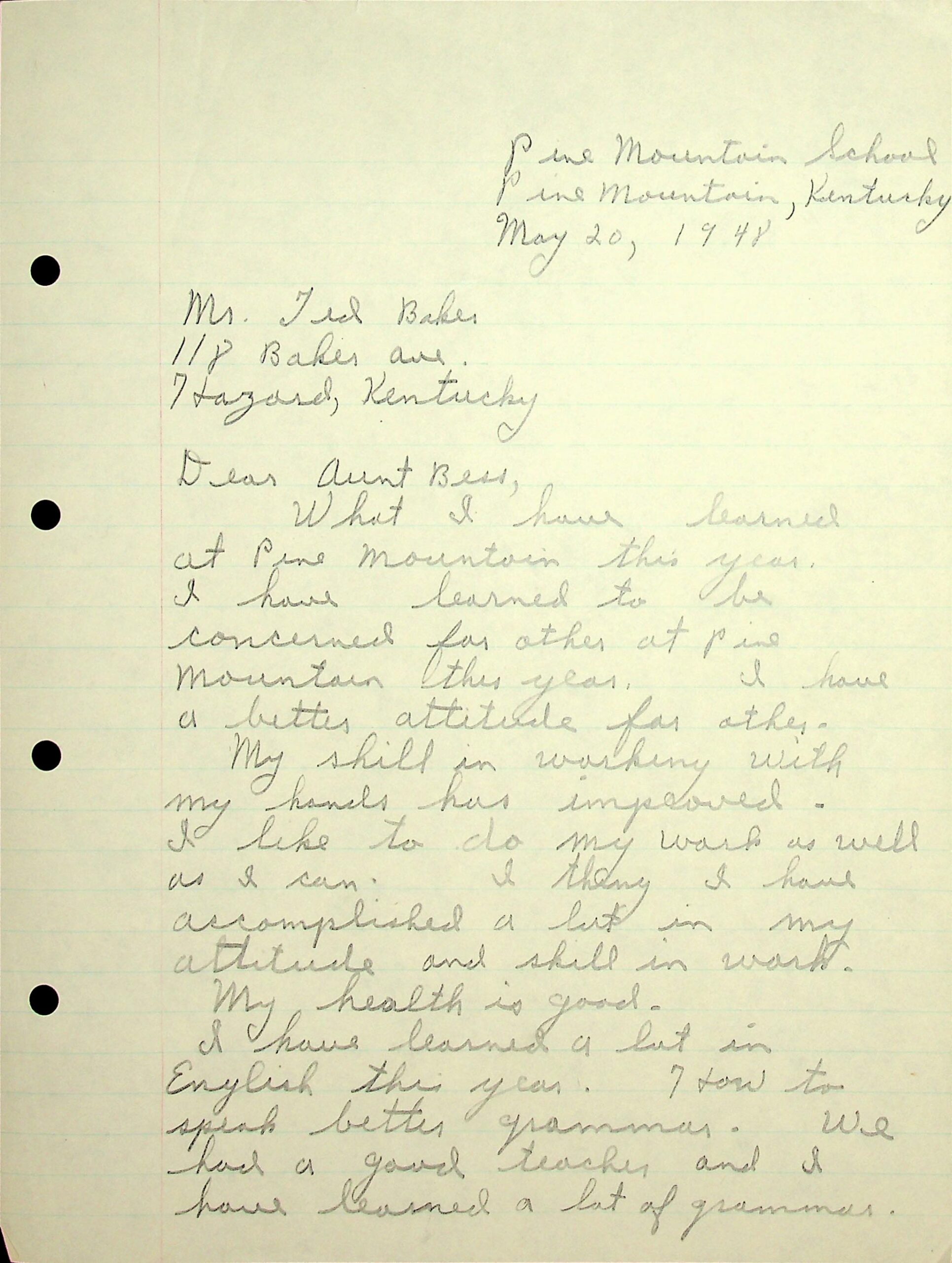 The following is a list of contents of four letters handwritten by PMSS student Fred Baker in 1947. They were addressed to Mr. and Mrs. Ted Baker of Hazard, Kentucky, with the salutation, “Dear Aunt Bess.”