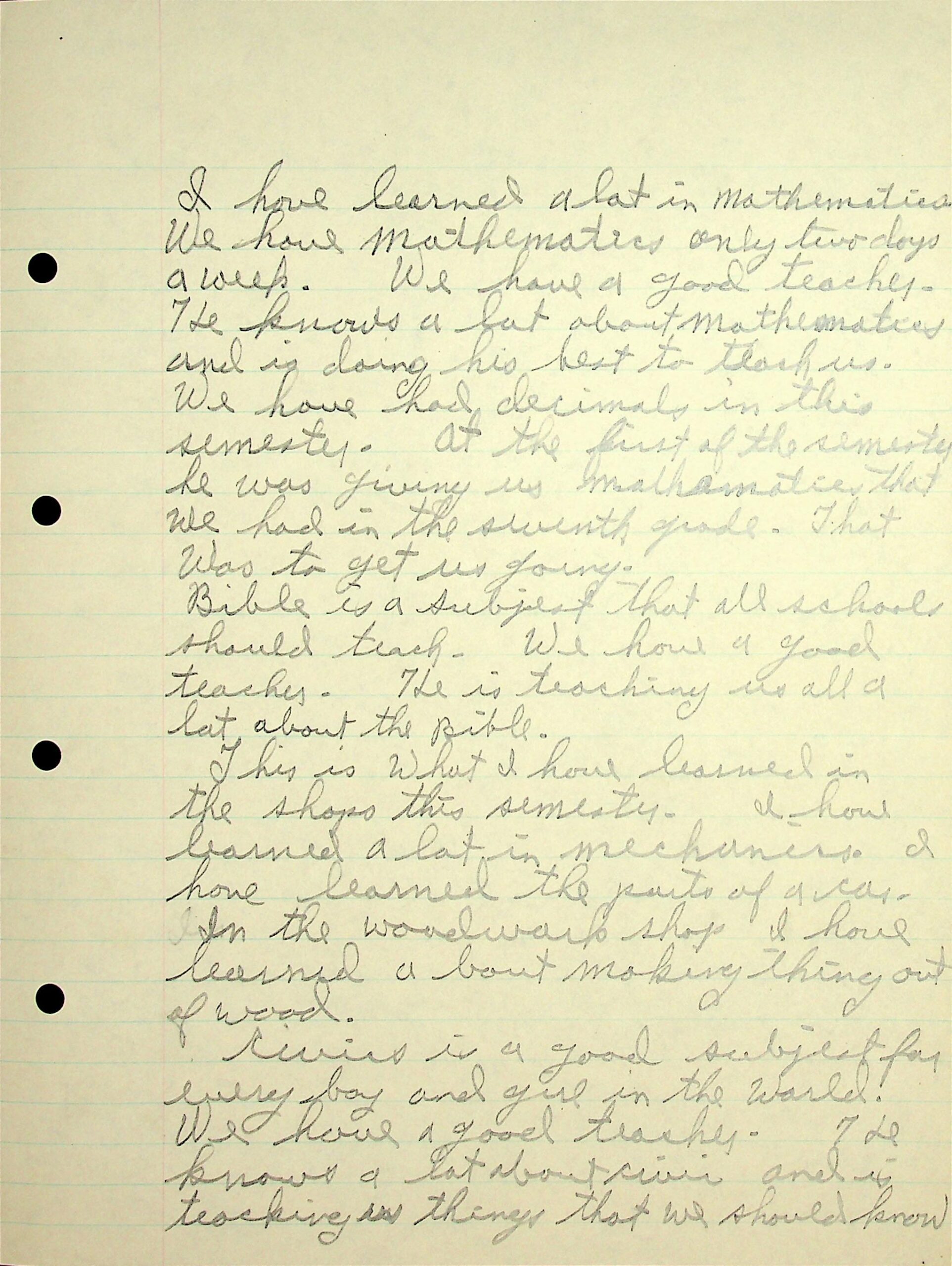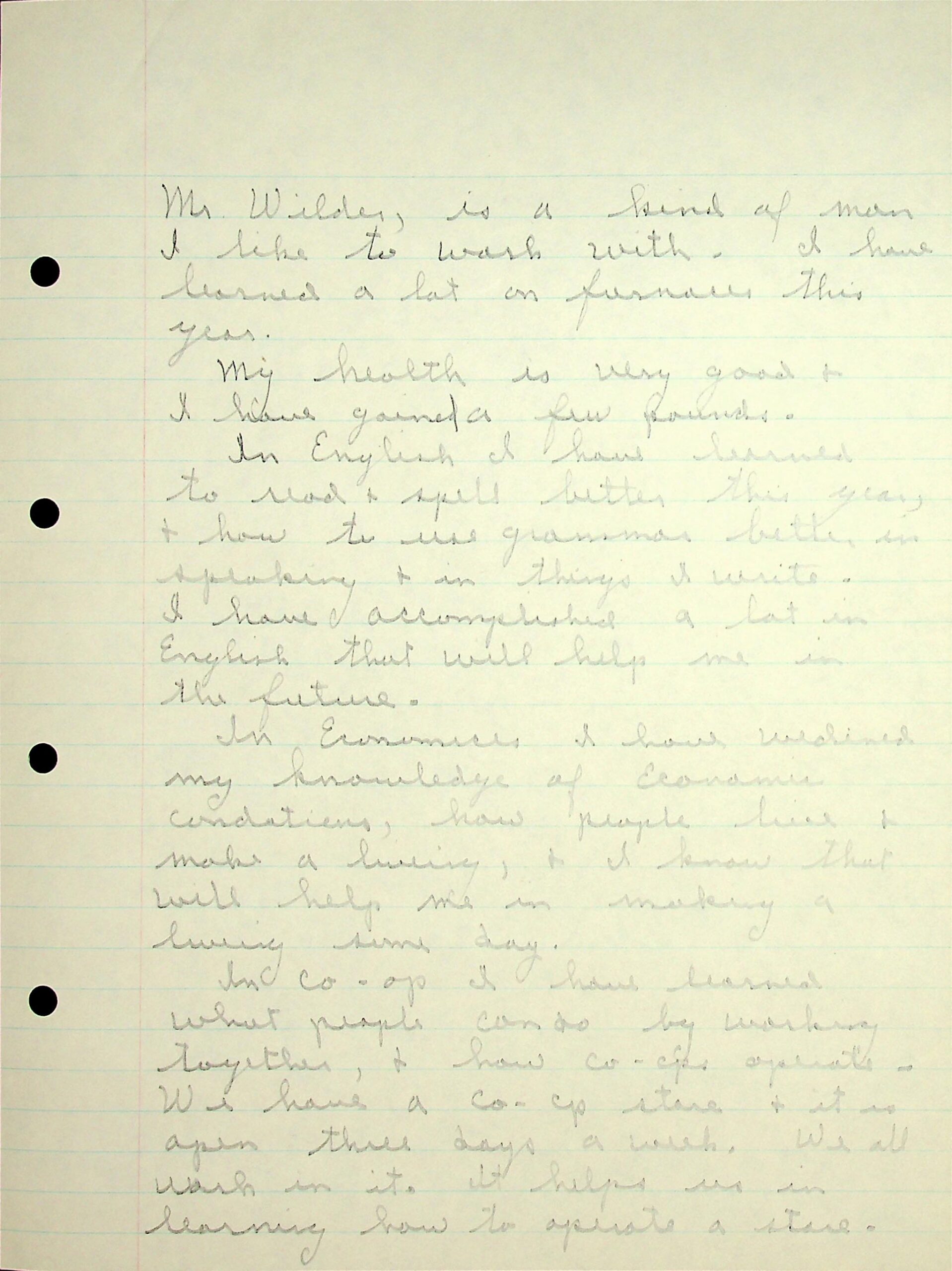13 (Page 2) under Mr. Wilder’s supervision (“Mr. Wilder is a kind of man I like to work with.”). In English he improved in spelling and grammar in speaking and writing. He describes his other subjects, such as economics; Co-op and working in the Co-op store;