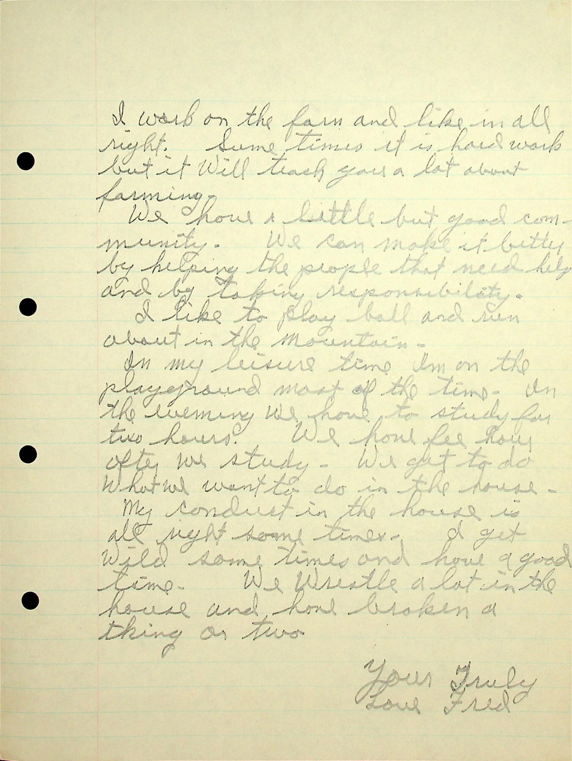 03 (Page 3) farm (“sometimes it is hard work”). “We have a little but good community. We can make it better by helping the people that need help and by taking responsibility… I like to play ball and run about in the mountains. In my leisure time, I’m on the playground most of the time. In the evening we have to study for two hours. We have [a] free hour after we study…. My conduct in the house is all right sometimes. I get wild sometimes and have a good time. We wrestle a lot in the house and have broken a thing or two.”