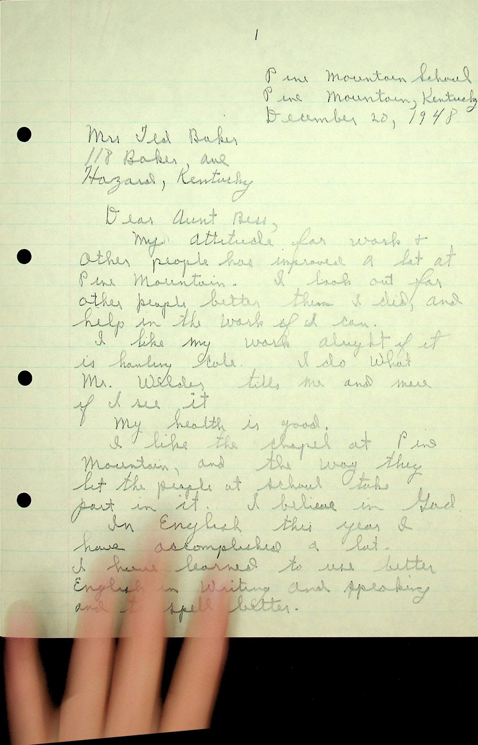 09 December 20, 1948. Three-page letter to Mrs. Ted Baker (“Dear Aunt Bess”) from Fred Baker. “My attitude for work & other people has improved a lot at Pine Mountain. I look out for other people better than I did, and help in the work if I can.” He tells about hauling coal under direction of Mr. [Brit] Wilder; the Chapel; English;