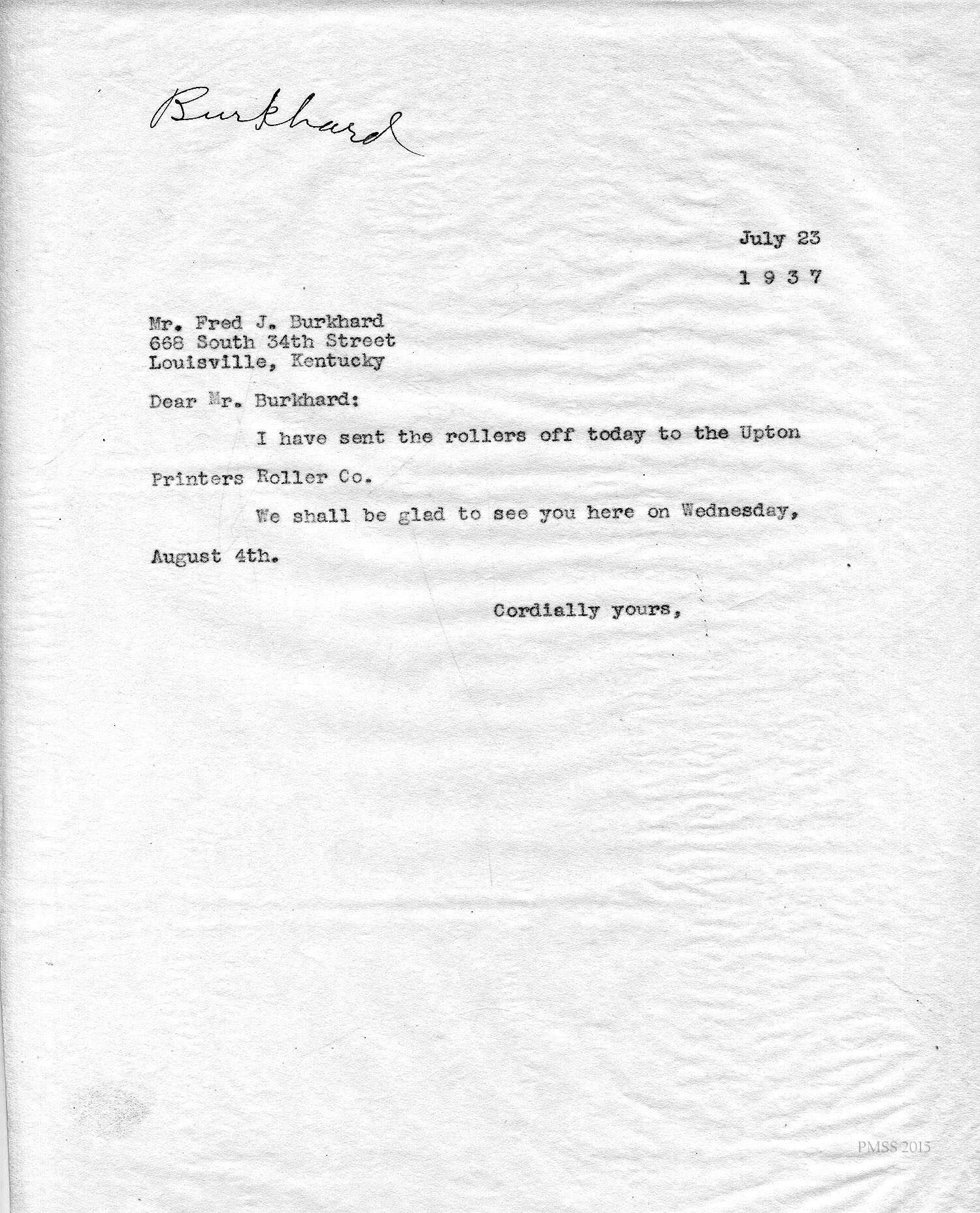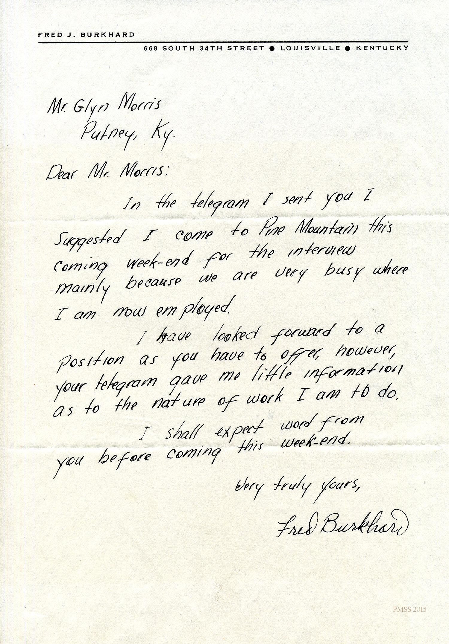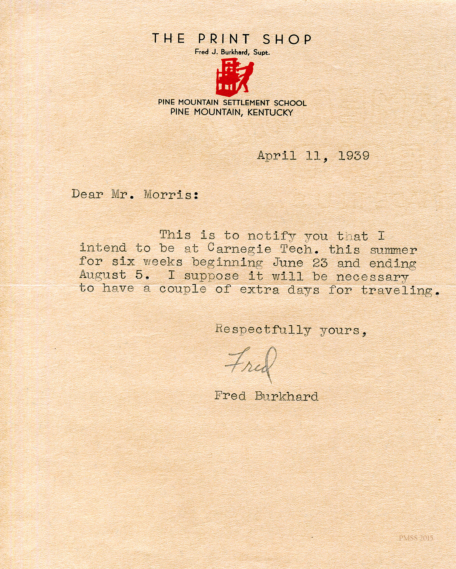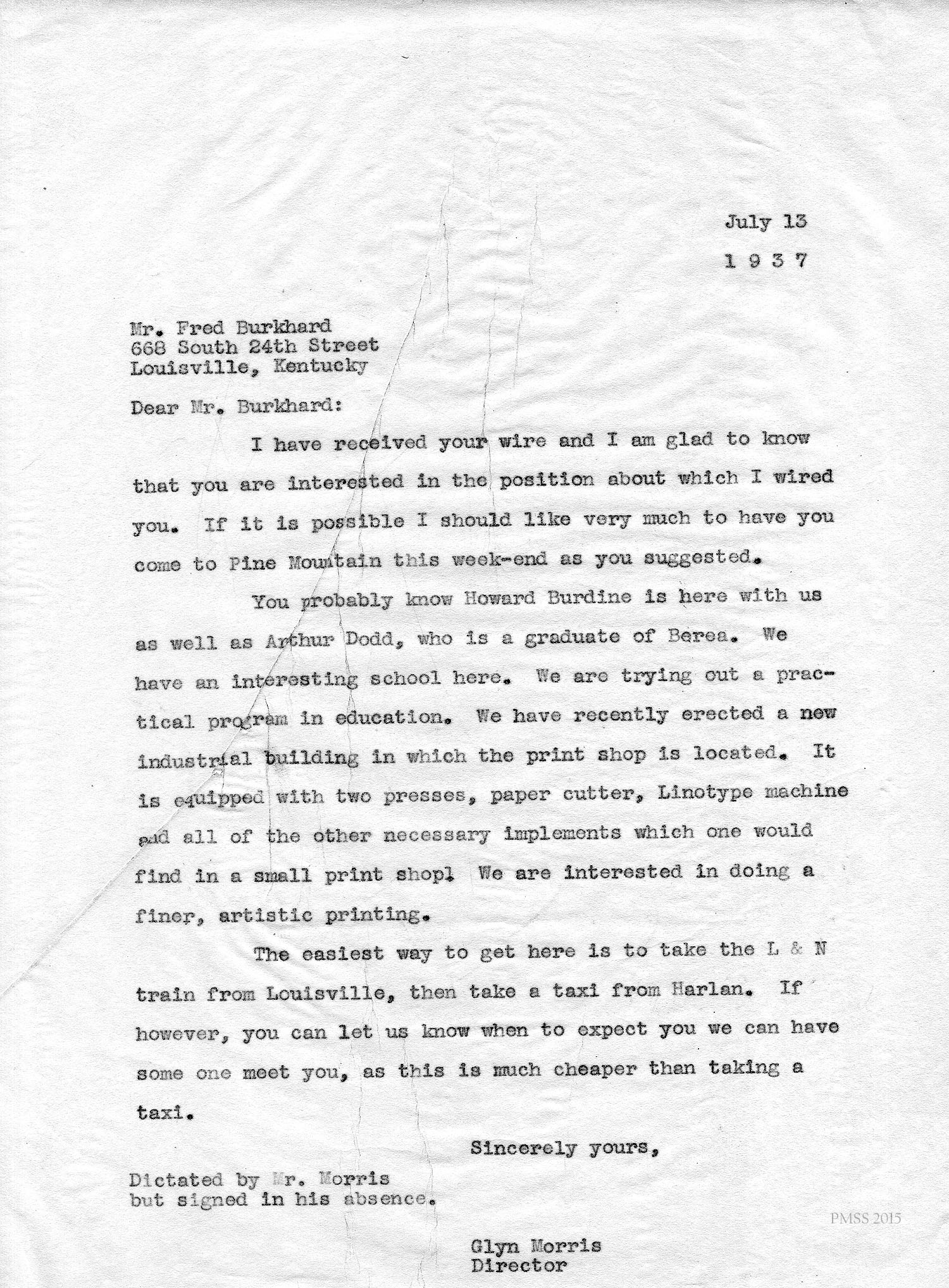 The following FRED J. BURKHARD CORRESPONDENCE consists of images and transcriptions of telegrams, memos and letters between Burkhard and PMSS staff. The correspondence is dated from July 1937 to March 1947. Fred J. Burkhard was Print Shop operator and teacher from 1937 to 1940 at the Pine Mountain Settlement School.