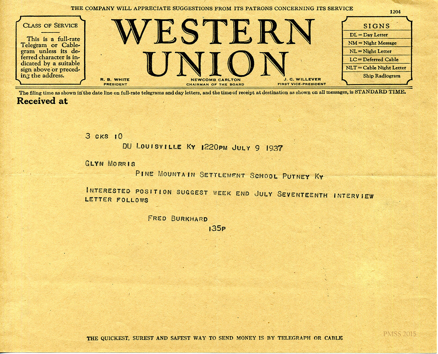 - 1937 July 9. Fred Burkhard to Glyn Morris, from Louisville, KY (telegram)