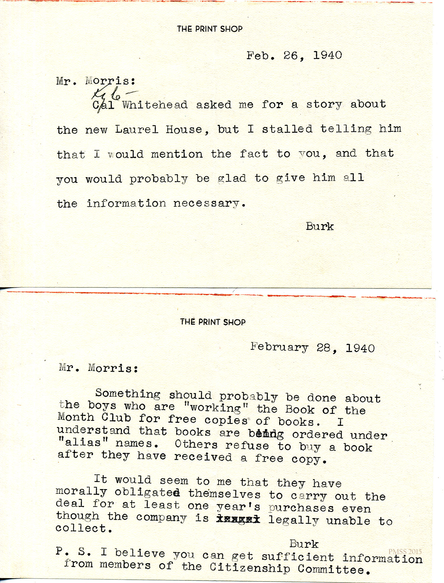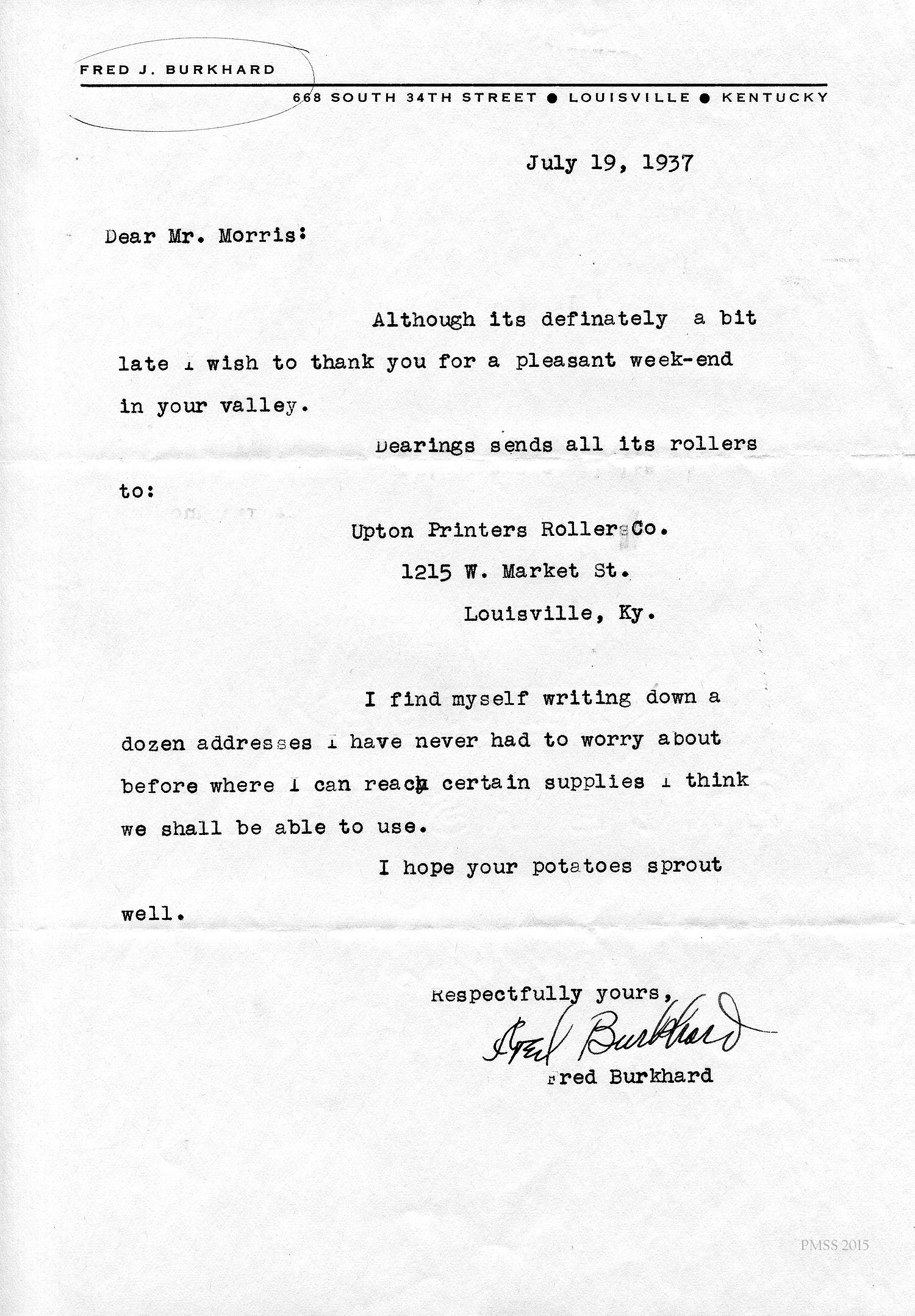 - 1937 n.d. Fred Burkhard to Glyn Morris, from Louisville, KY