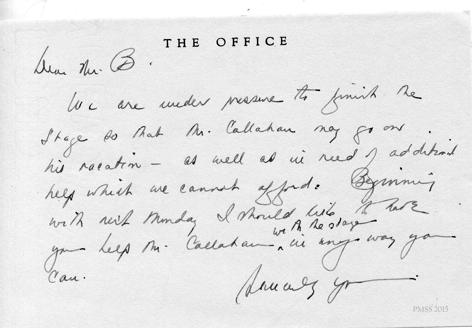 We are under pressure to finish the stage so that Mr. Callahan may go on his vacation — as well as in need of additional help which we cannot afford. Beginning with next Monday I should like to have you help Mr. Callahan with the stage in any way you can.