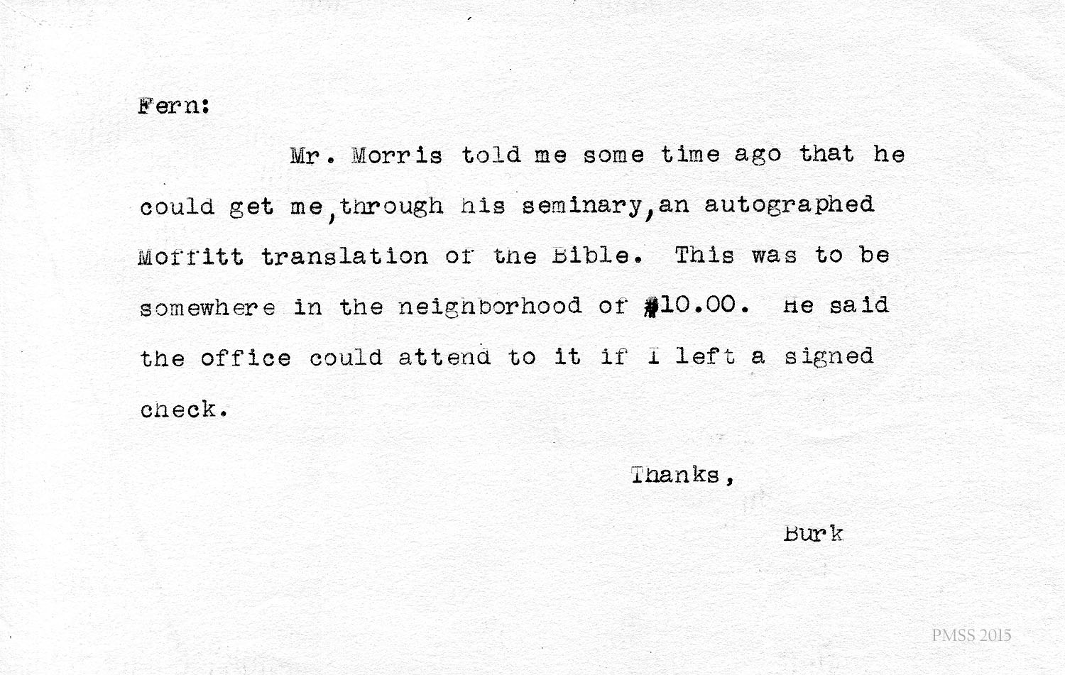 Mr. Morris told me some time ago that he could get me, through his seminary, an autographed Moffitt translation of the Bible. This was to be somewhere in the neighborhood of $10.00. He said the office could attend to it if I left a signed check.