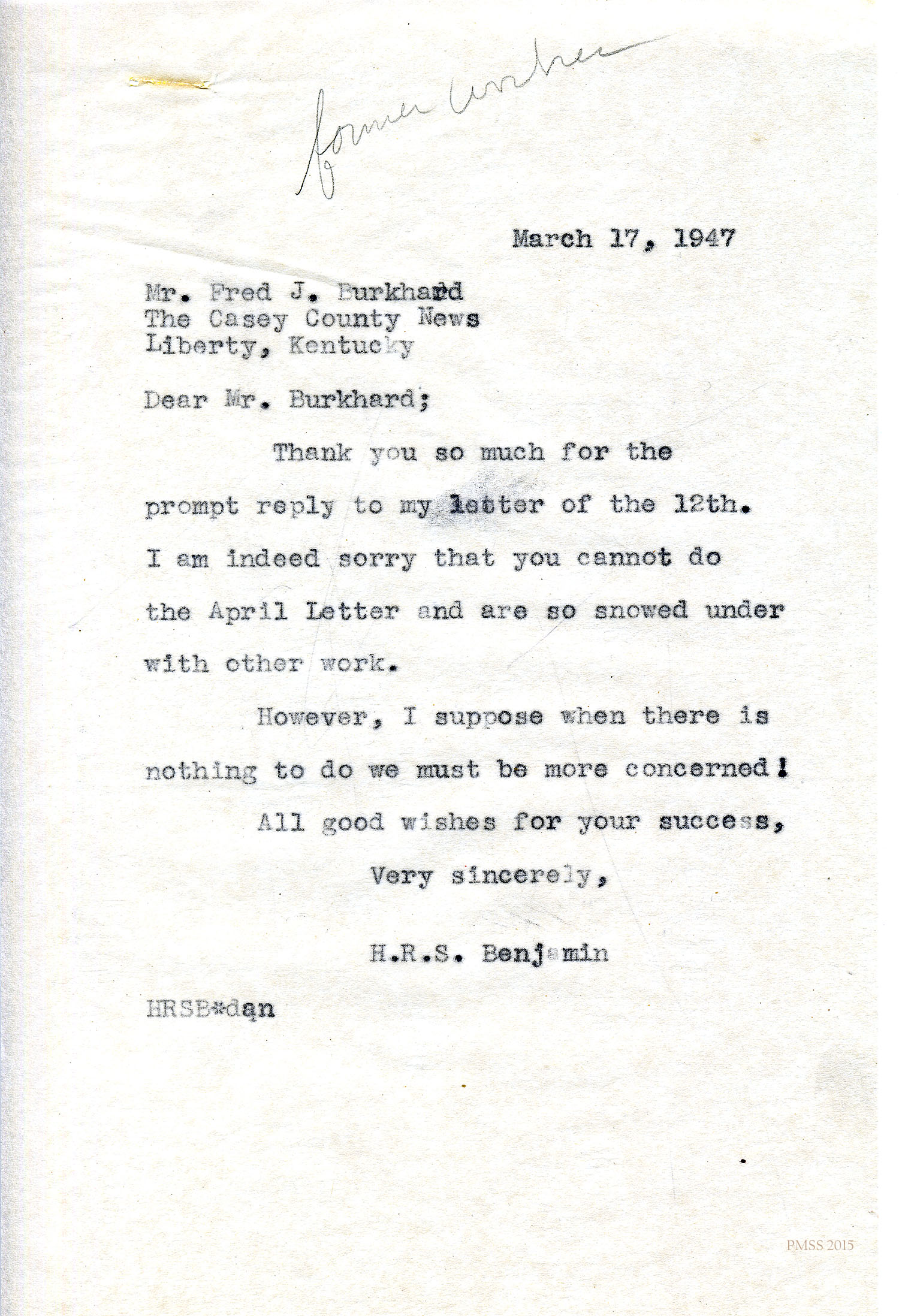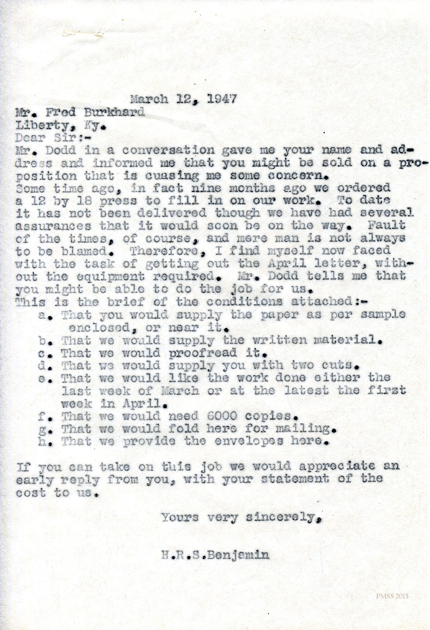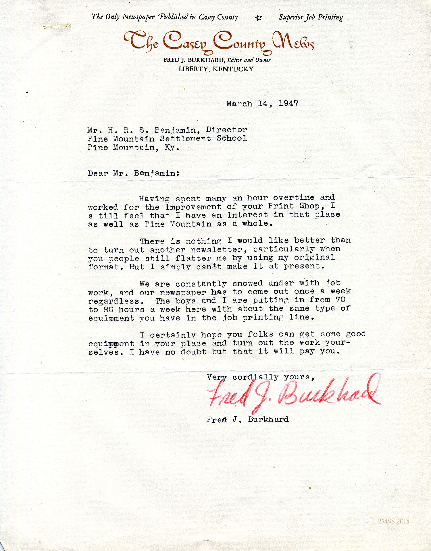 TAGS: Fred J. Burkhard Correspondence ; printing equipment ; print shops ; PMSS Print Shop ; printers ; Glyn Morris ; H.R.S. Benjamin ; The Casey County News ;