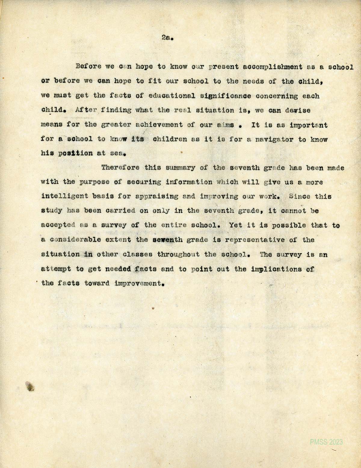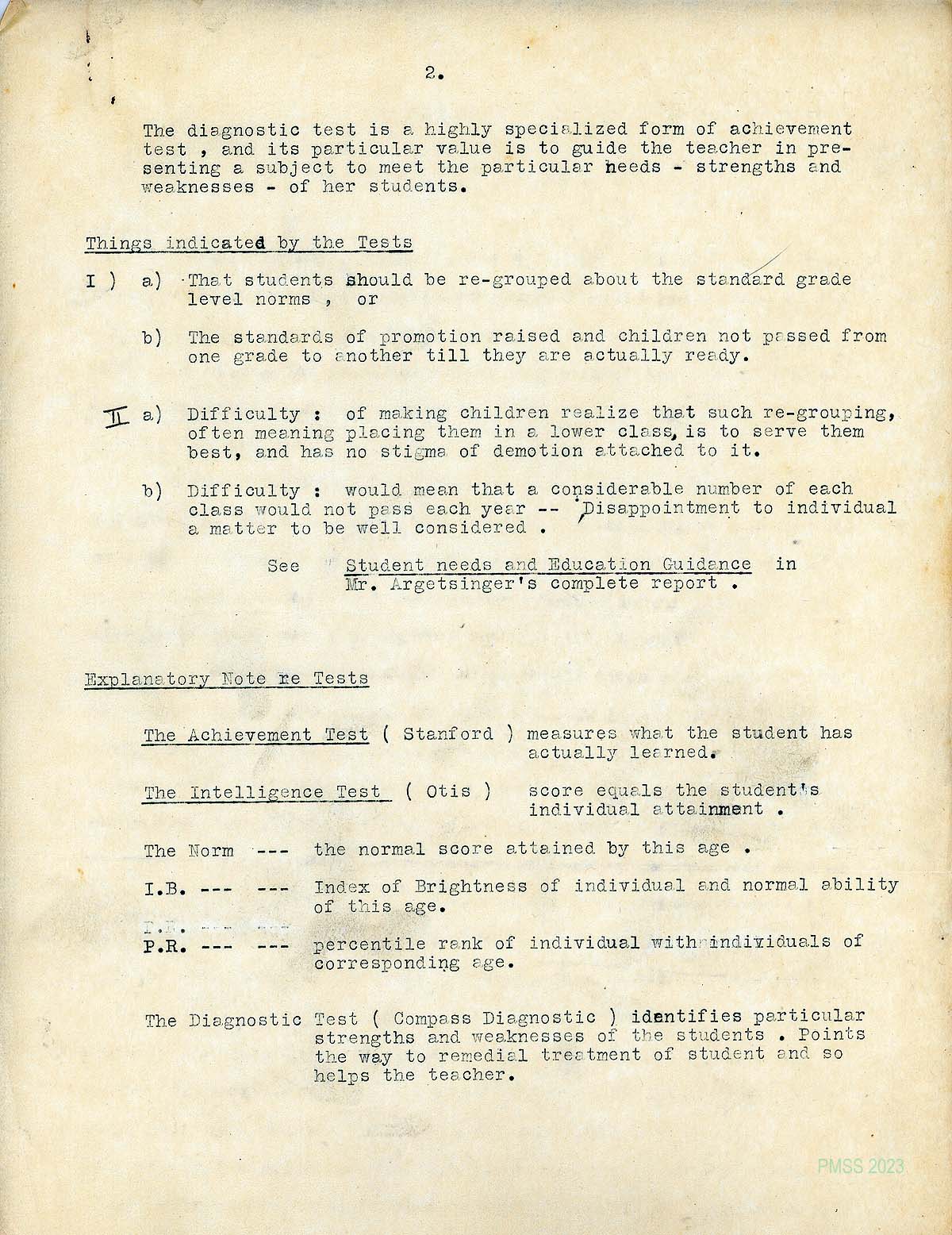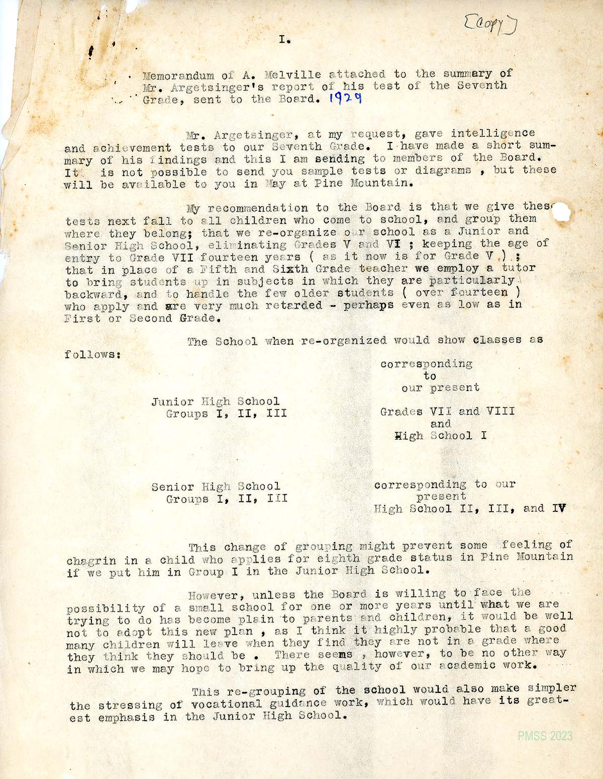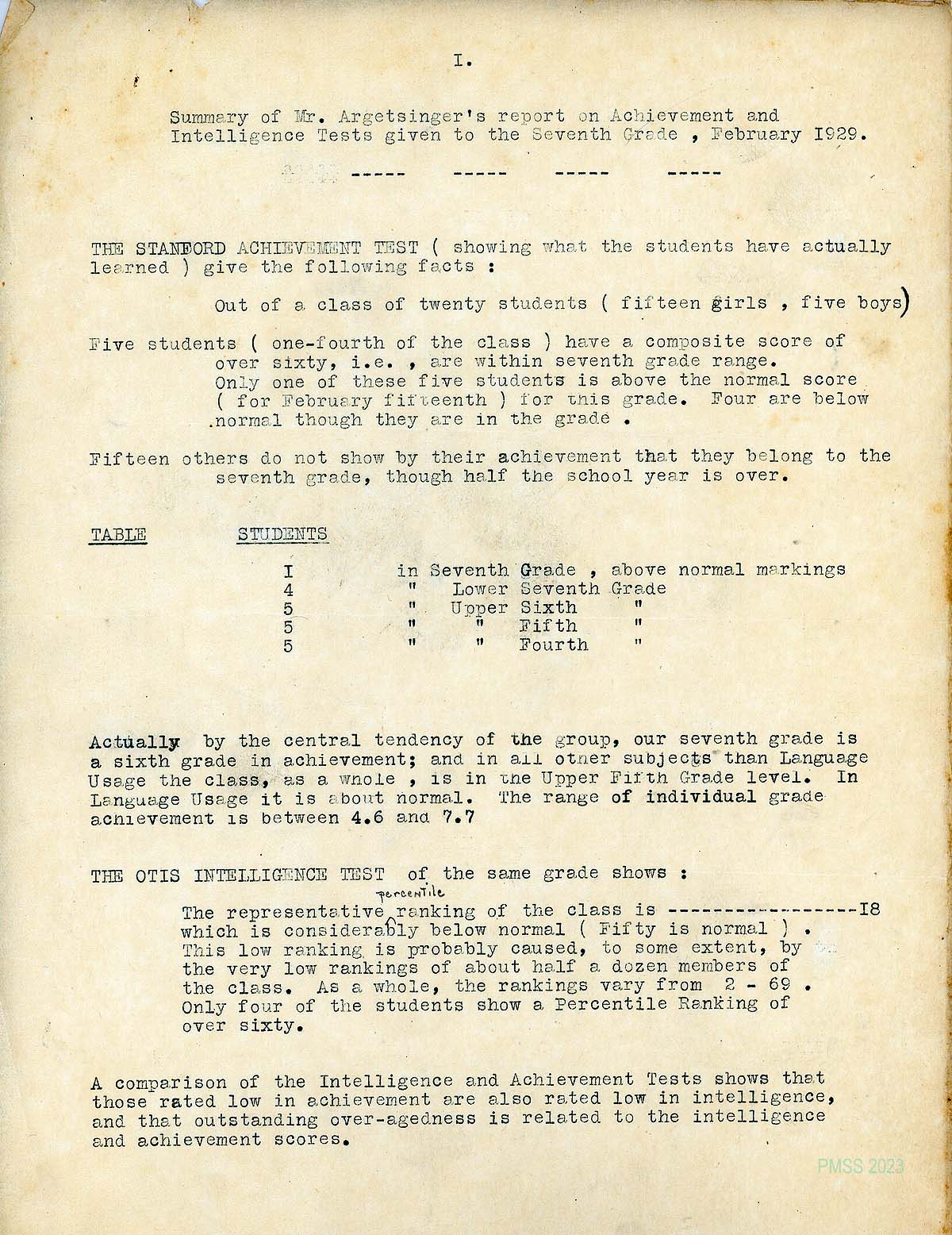 Displayed below are Images and transcription of a typewritten summary of Mr. Argetsinger’s tests of seventh grade students, sent to the PMSS Board of Trustees in 1929. Attached to the report, and also transcribed, is a memorandum from Angela Melville, PMSS Interim Director, offering her recommendations for re-organization of the School.