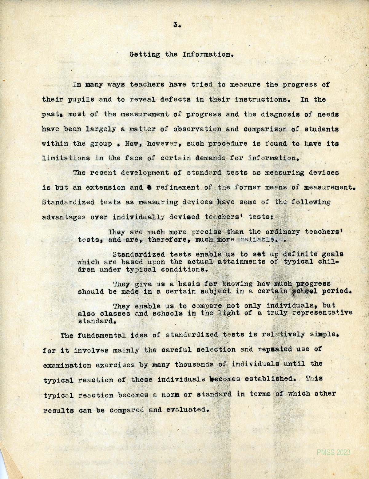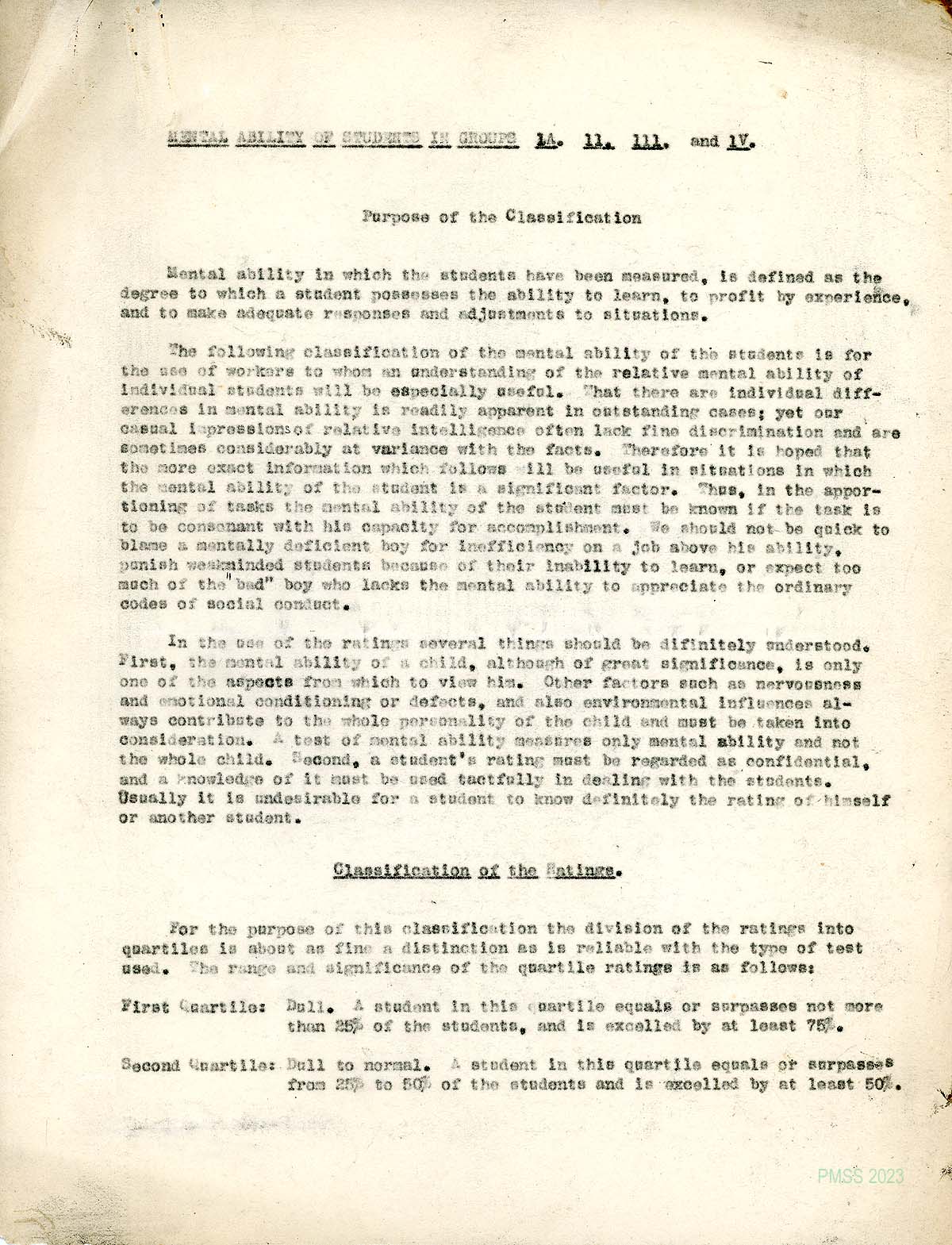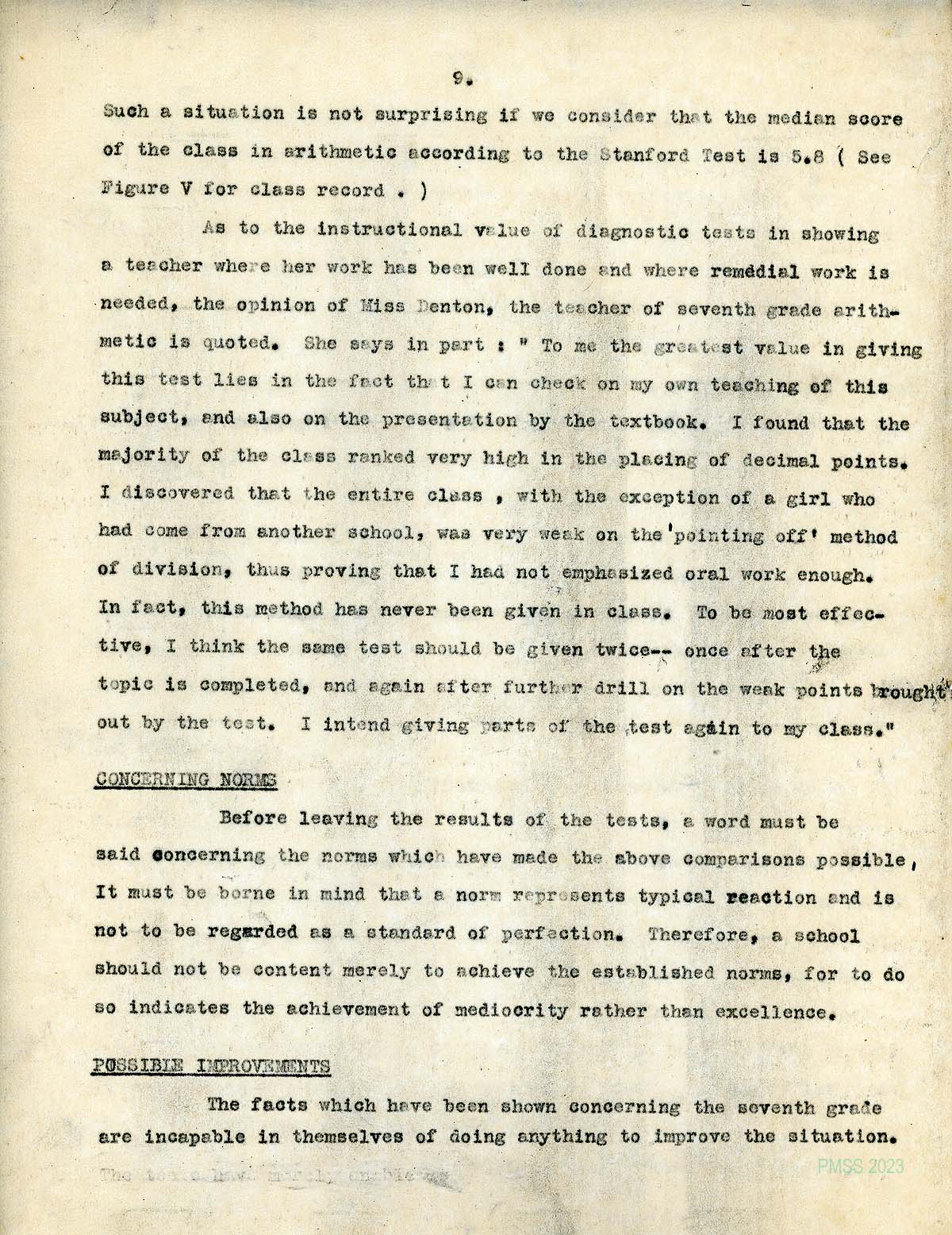 Displayed below are Images and transcription of a typewritten summary of Mr. Argetsinger’s tests of seventh grade students, sent to the PMSS Board of Trustees in 1929. Attached to the report, and also transcribed, is a memorandum from Angela Melville, PMSS Interim Director, offering her recommendations for re-organization of the School.