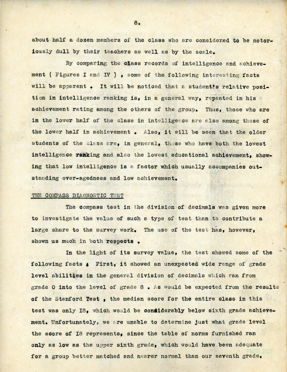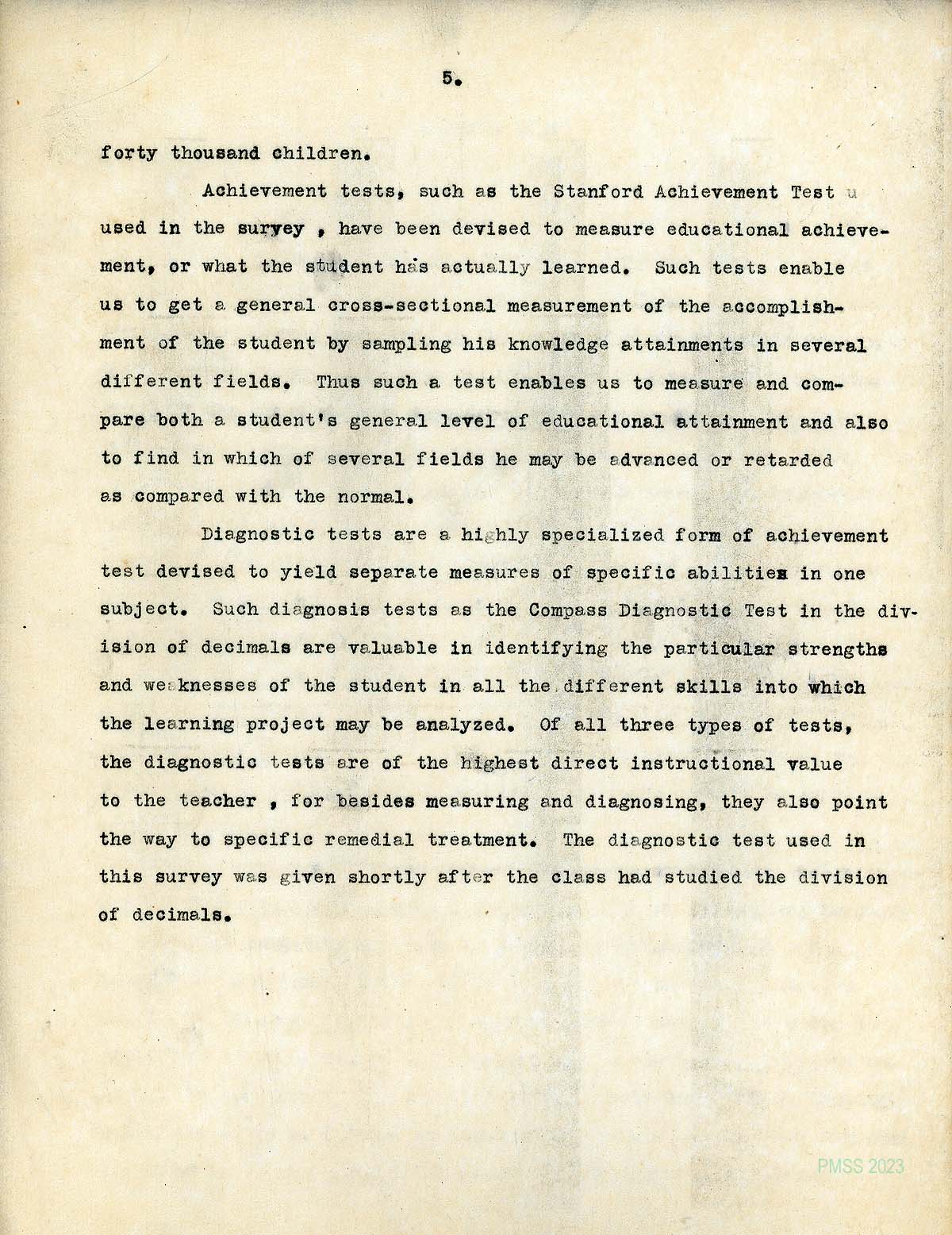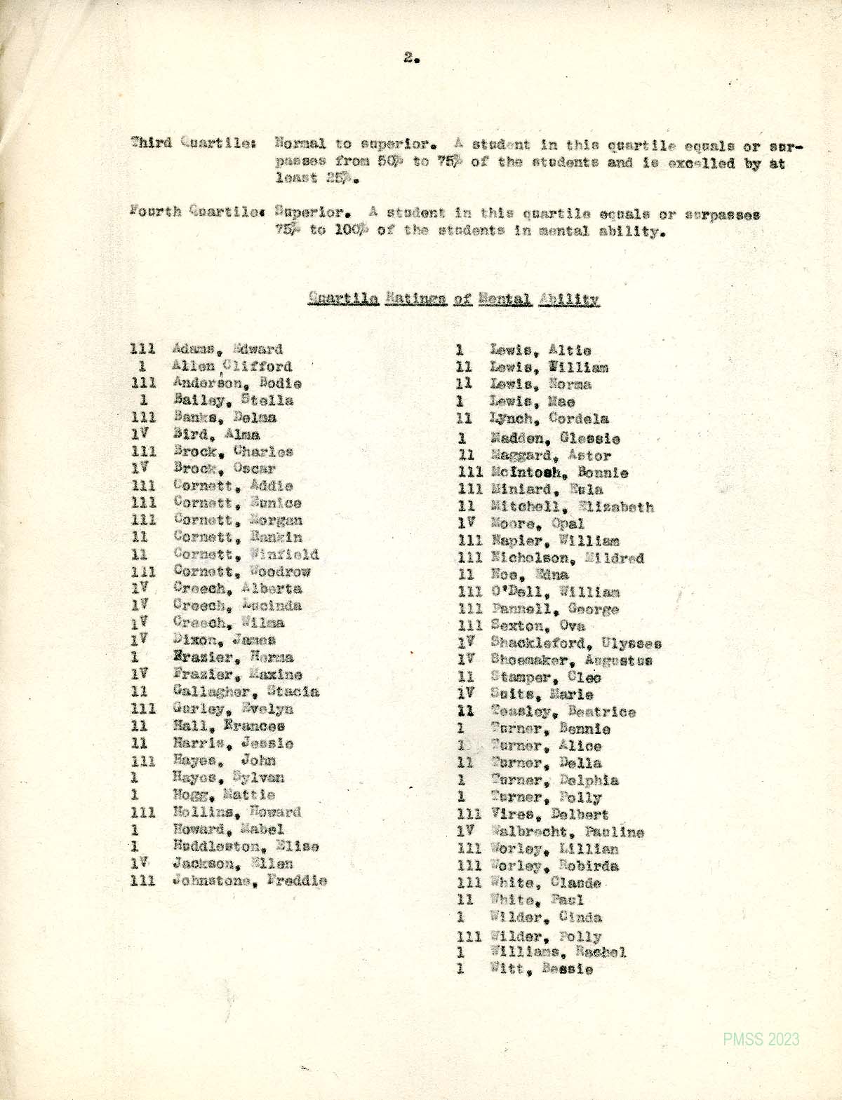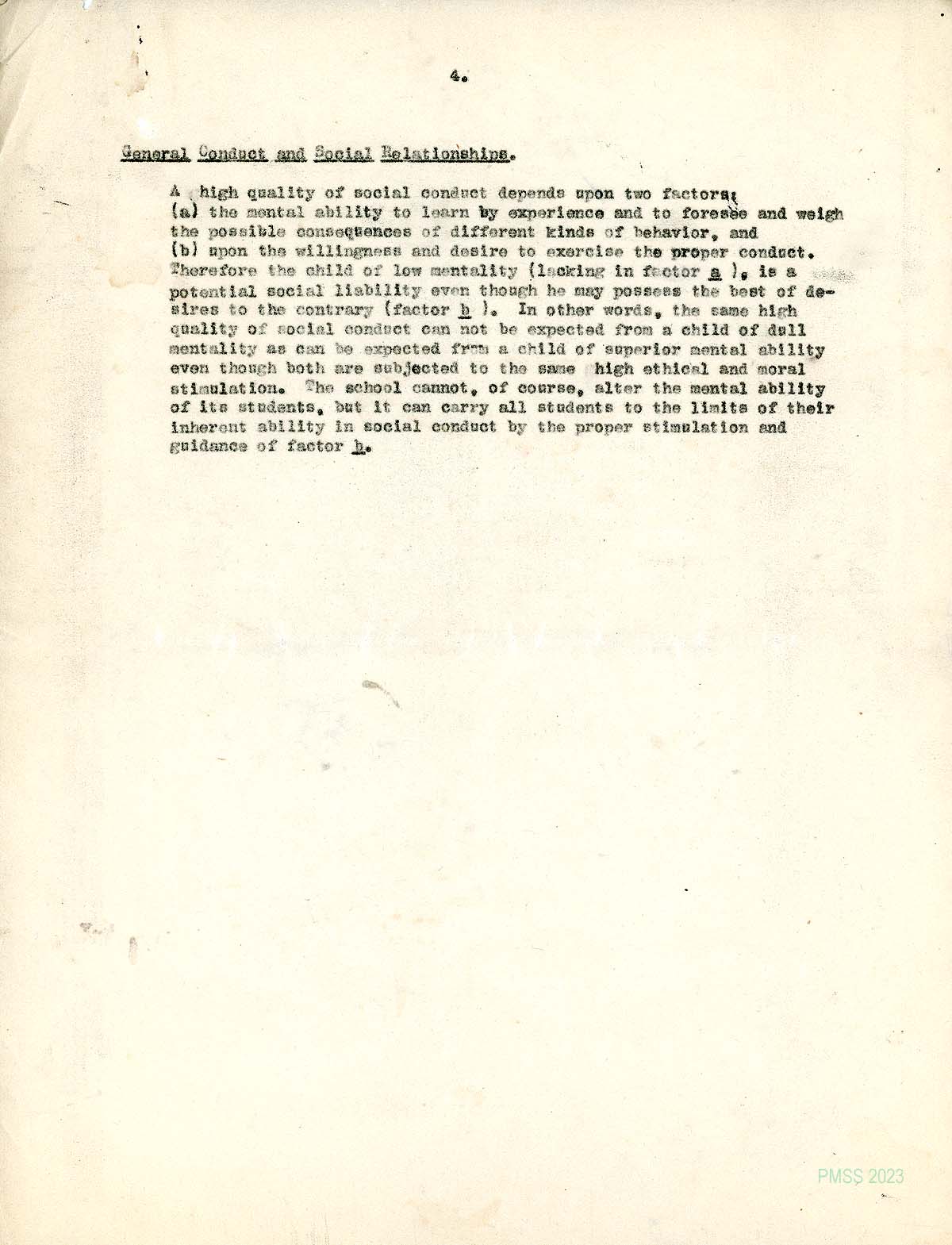 Displayed below are Images and transcription of a typewritten summary of Mr. Argetsinger’s tests of seventh grade students, sent to the PMSS Board of Trustees in 1929. Attached to the report, and also transcribed, is a memorandum from Angela Melville, PMSS Interim Director, offering her recommendations for re-organization of the School.
