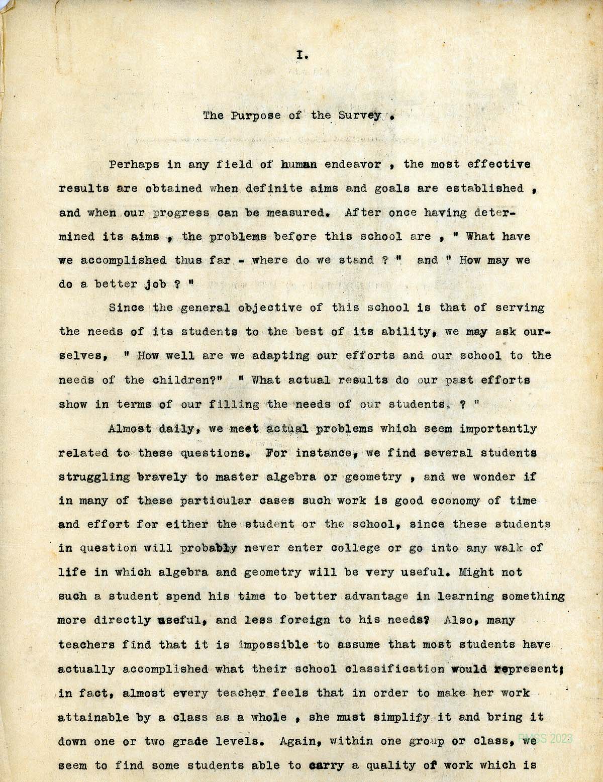 Since the general objective of this school is that of serving the needs of its students to the best of its ability, we may ask ourselves, “How well are we adapting our efforts and our school to the needs of the children?” “What actual results do our past efforts show in terms of our filling the needs of our students?”