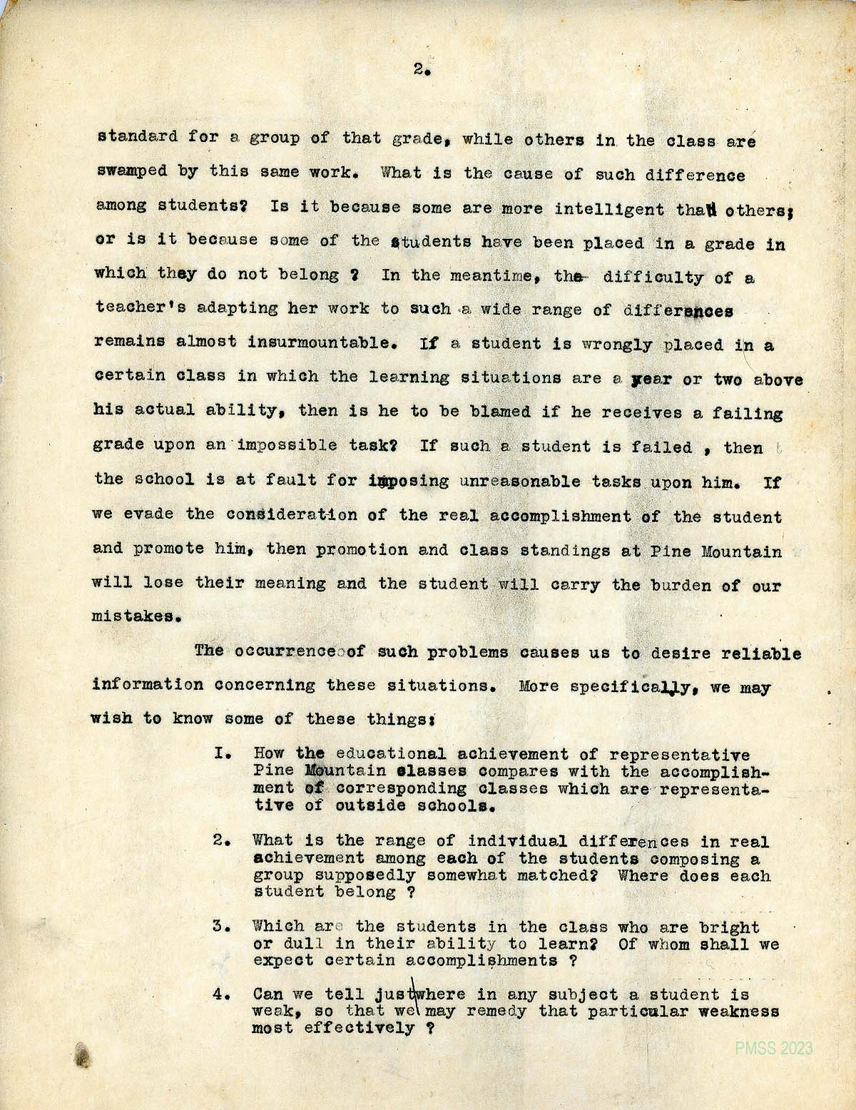 …standard for a group of that grade, while others in the class are swamped by this same work. What is the cause of such difference among students? Is it because some are more intelligent than others; or is it because some of the students have been placed in a grade in which they do not belong? In the meantime, the difficulty of a teacher’s adapting her work to such a wide range of differences remains almost insurmountable. If a student is wrongly placed in a certain class in which the learning situations are a year or two above his actual ability, then is he to be blamed if he receives a failing grade upon an impossible task? If such a student is failed, then the school is at fault for imposing unreasonable tasks upon him. If we evade the consideration of the real accomplishment of the student and promote him, then promotion and class standings at Pine Mountain will lose their meaning and the student will carry the burden of our mistakes.