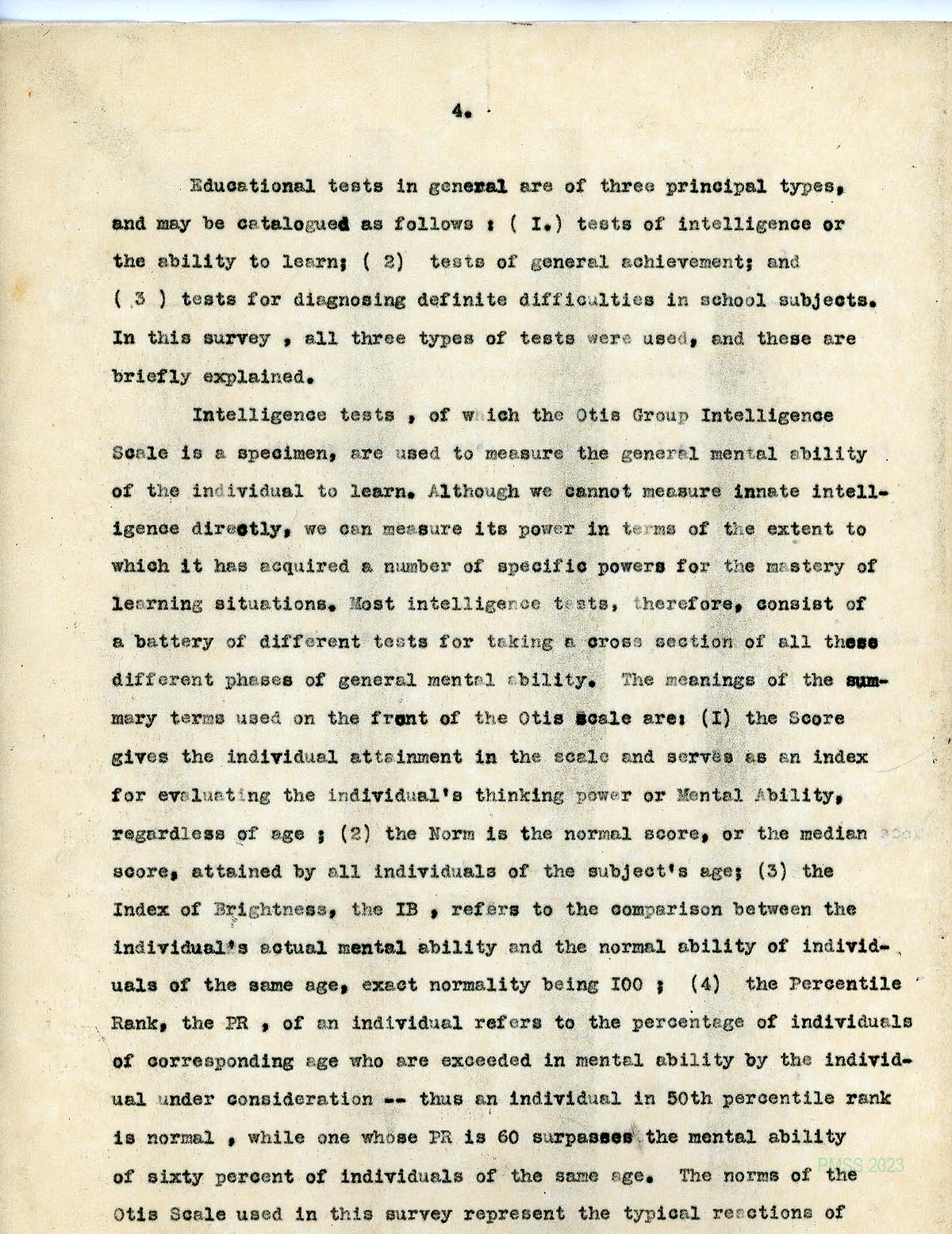 Intelligence tests, of which the Otis Group Intelligence Scale is a specimen, are used to measure the general mental ability of the individual to learn. Although we cannot measure innate intelligence directly, we can measure its power in terms of the extent to which it has acquired a number of specific powers for the mastery of learning situations. Most intelligence tests, therefore, consist of a battery of different tests for taking a cross section of all these different phases of general mental ability. The meanings of the summary terms used on the front of the Otis scale are: (1) the Score gives the individual attainment in the scale and serves as an index for evaluating the individual’s thinking power or Mental Ability, regardless of age; (2) the Norm is the normal score, or the median 200 score, attained by all individuals of the subject’s age; (3) the Index of Brightness, the IB, refers to the comparison between the individual’s actual mental ability and the normal ability of individuals of the same age, exact normality being 100; (4) the Percentile Rank, the PR, of an individual refers to the percentage of individuals of corresponding age who are exceeded in mental ability by the individual under consideration thus an individual in 50th percentile rank is normal, while one whose PR is 60 surpasses the mental ability of sixty percent of individuals of the same age. The norms of the Otis Scale used in this survey represent the typical reactions of…