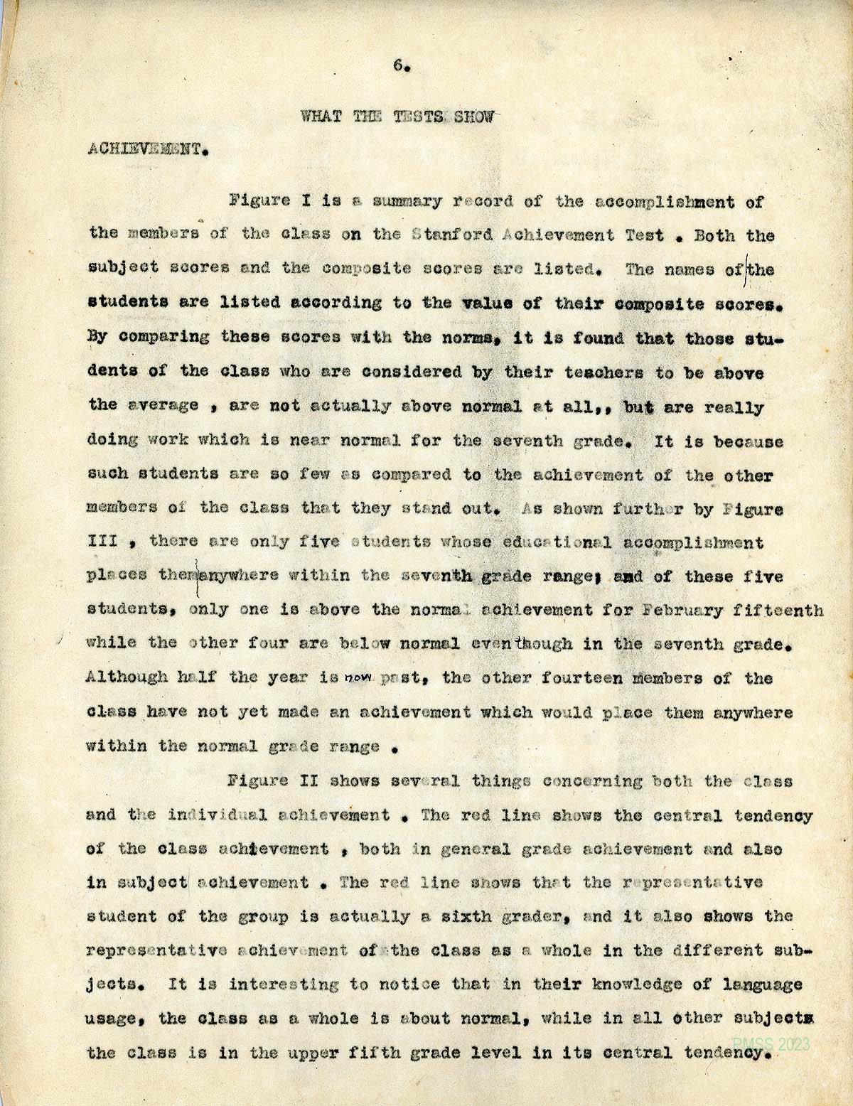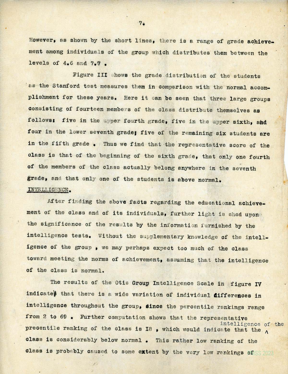 The representative [handwritten insertion: percentile] ranking of the class is ————-18 which is considerably below normal (Fifty is normal). This low ranking is probably caused, to some extent, by the very low rankings of about half a dozen members of the class. As a whole, the rankings vary from 2- 69. Only four of the students show a Percentile Ranking of over sixty.